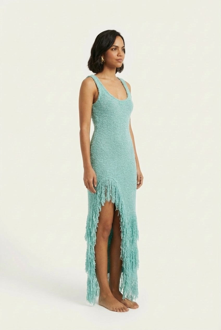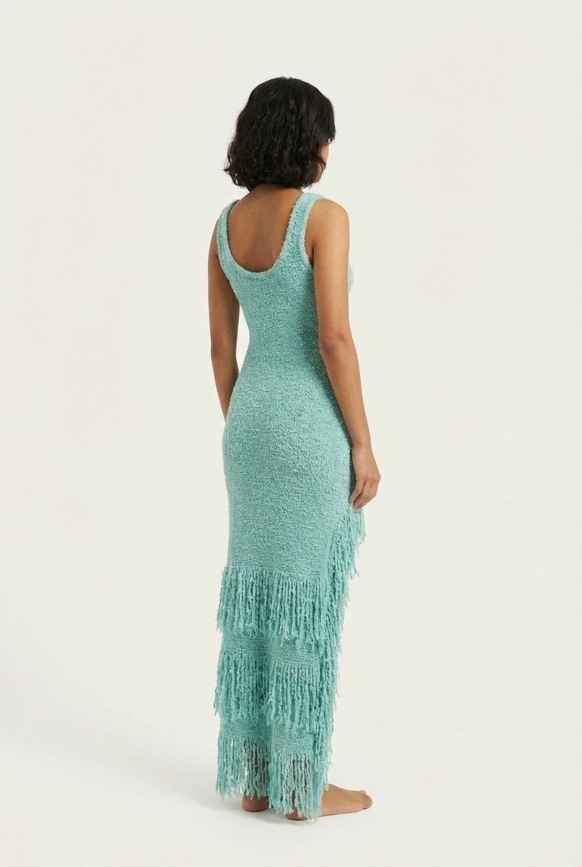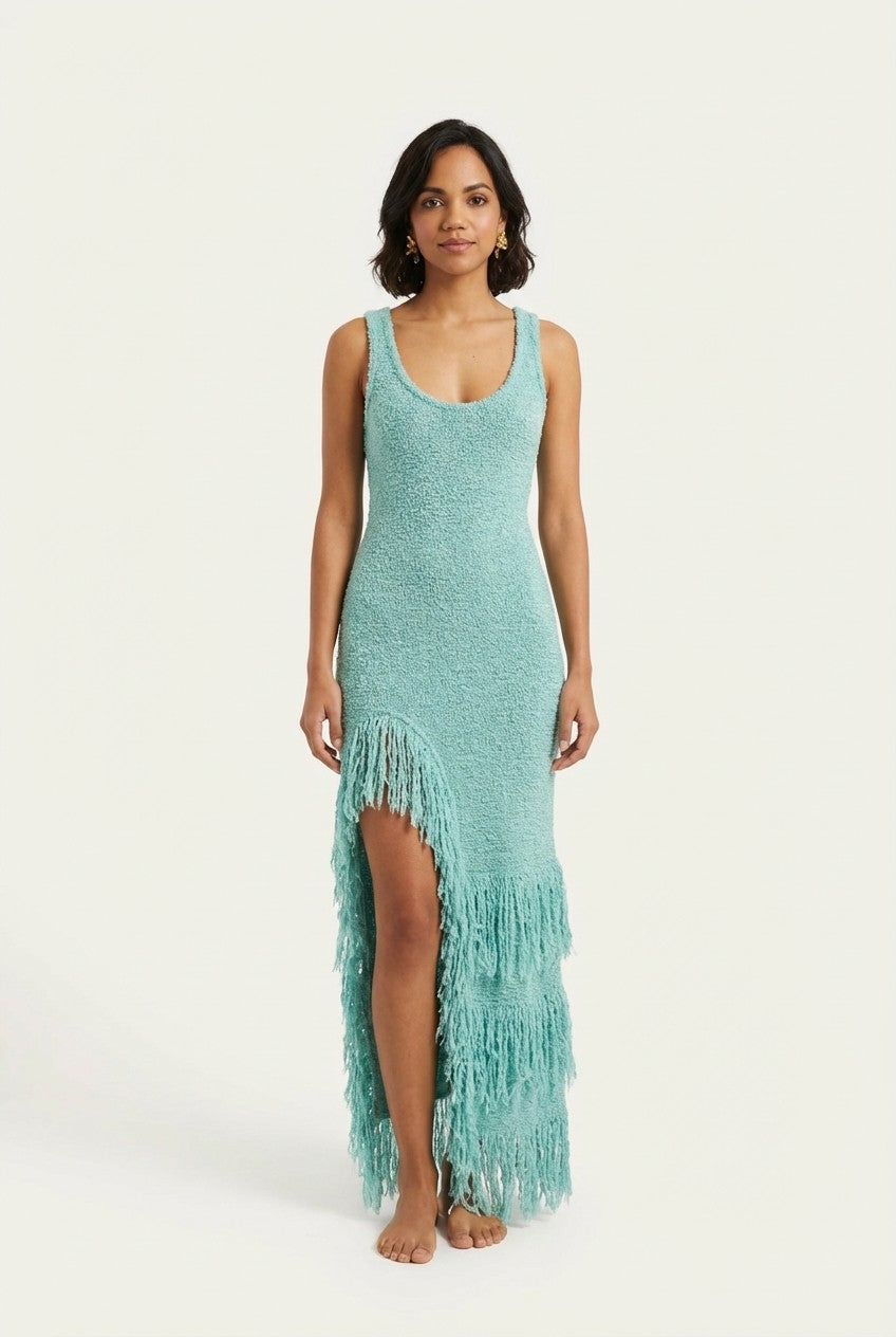 This fringe maxi dress is designed to catch the light and every eye, featuring a body-skimming silhouette with dynamic movement in every step.