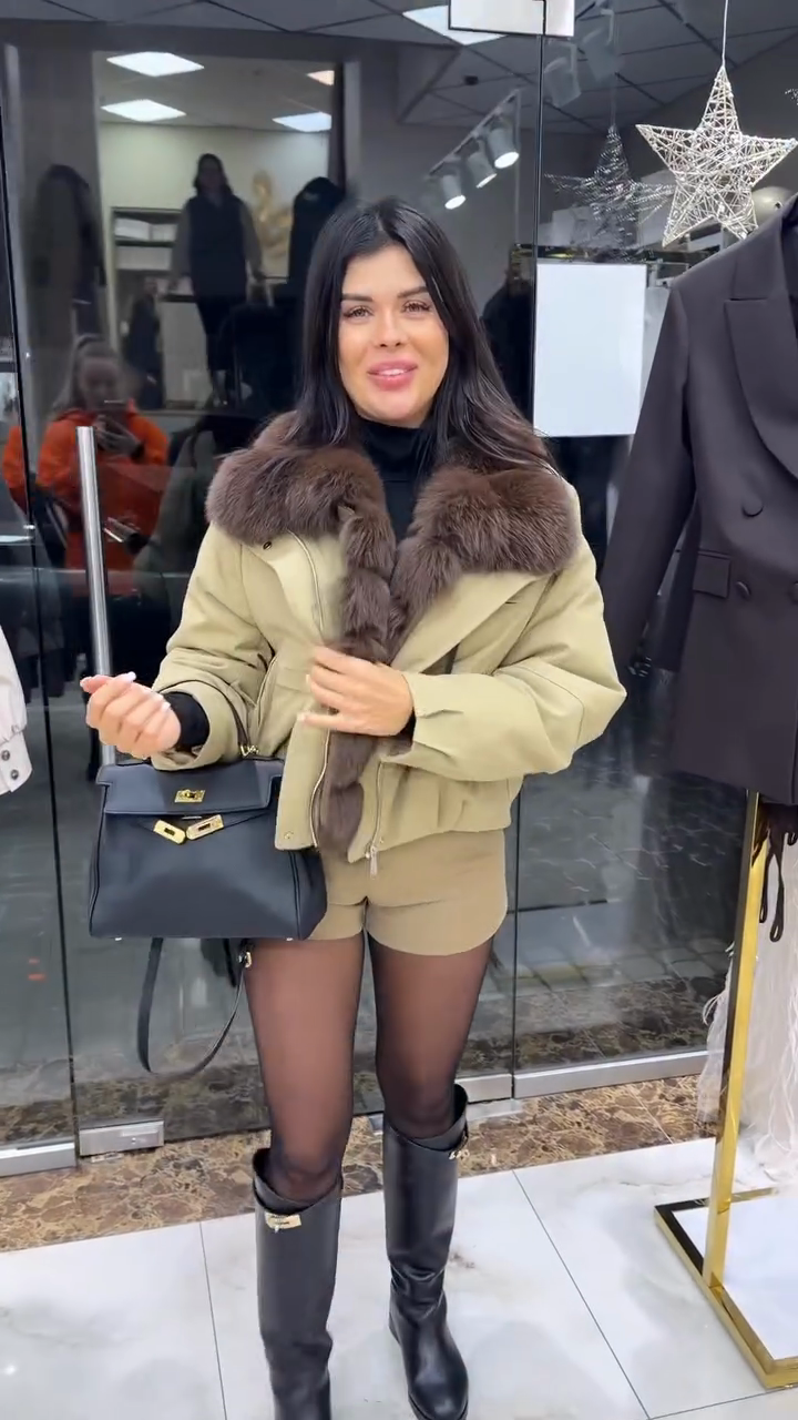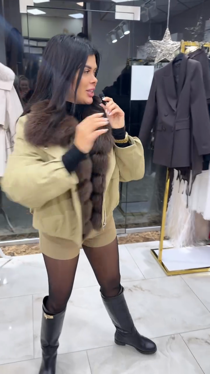 A beige utility-style jacket featuring a plush fur collar, zip-front design, and relaxed silhouette—merging durable outerwear fabric with luxurious fur details for winter casual or urban styling.