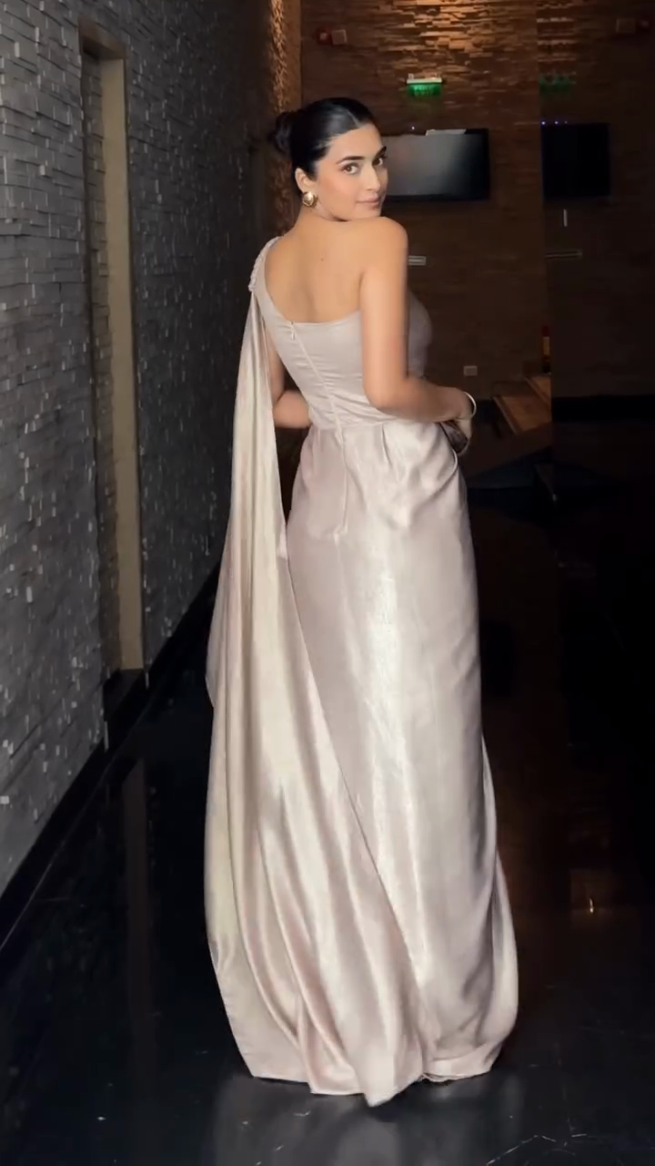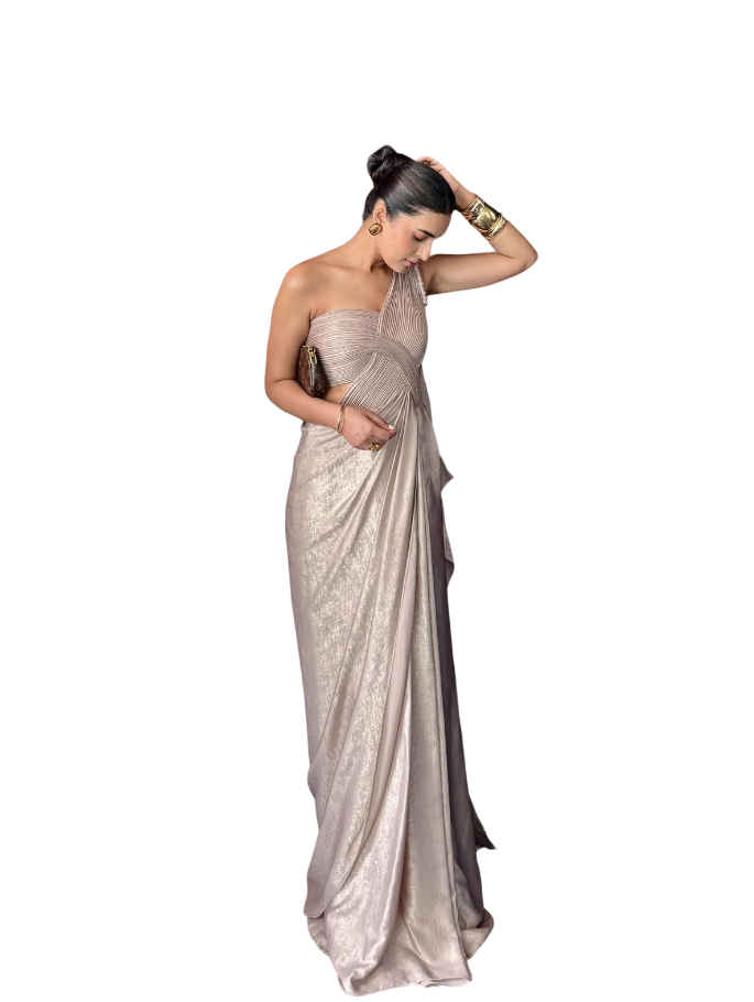 A beige one-shoulder gown featuring ruched texture, cut-out details, and a draped silhouette—merging sleek fabric with artistic structural design for formal events or upscale evening styling.