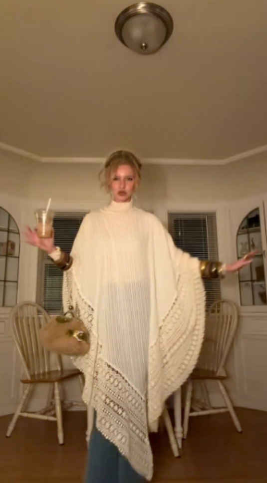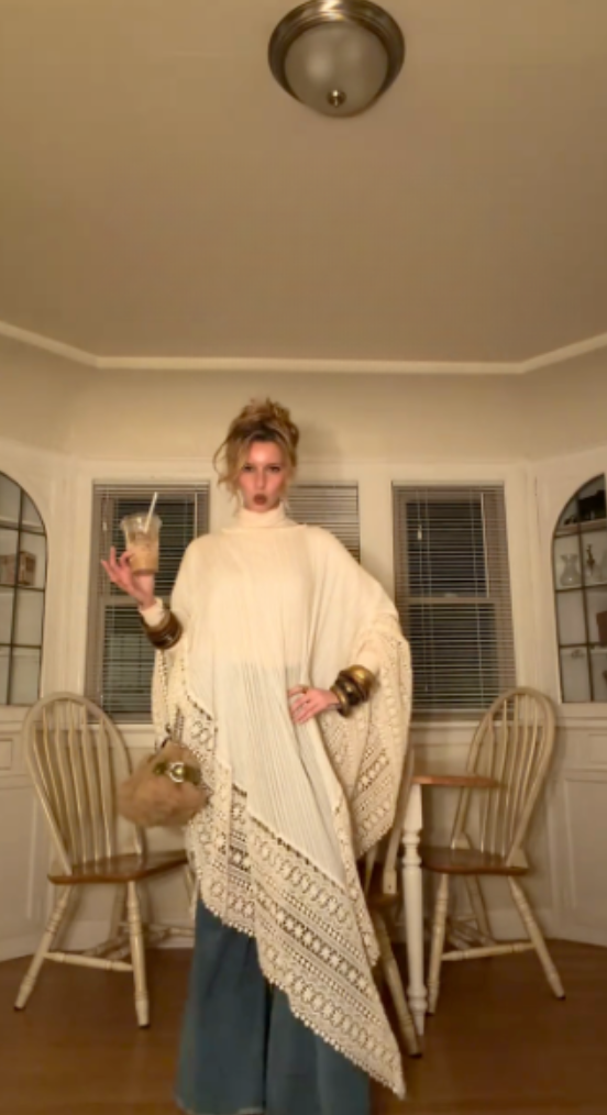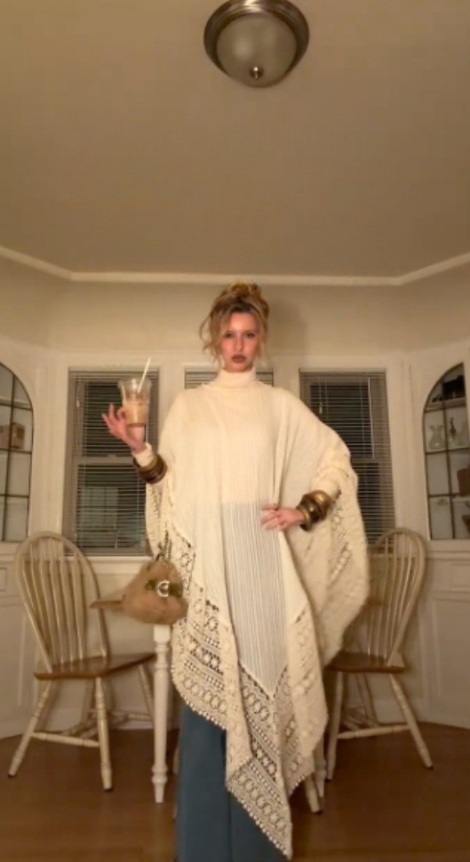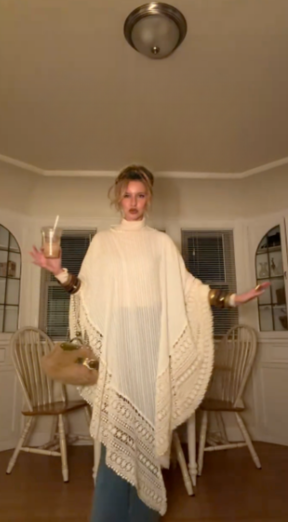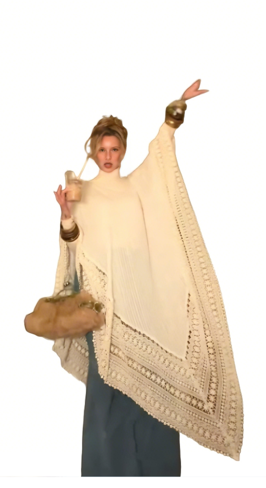 This cream-colored turtleneck crochet shawl is exquisitely textured, flowing and elegant, elevating the bohemian luxury style.
