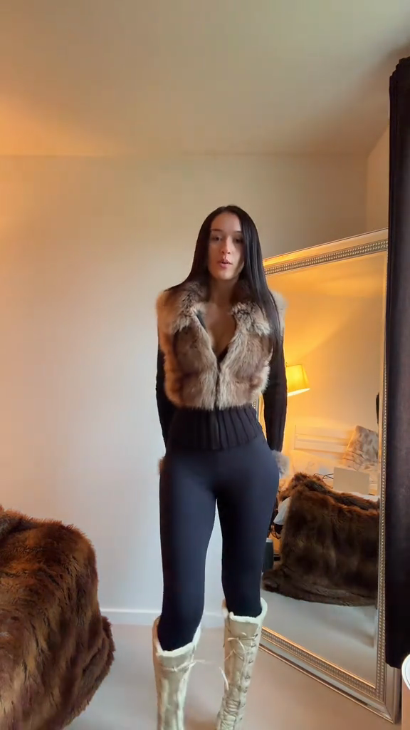 • Material: Stretchy ribbed knit fabric (soft, form-fitting texture) + beige-brown faux fur (plush, textured finish)