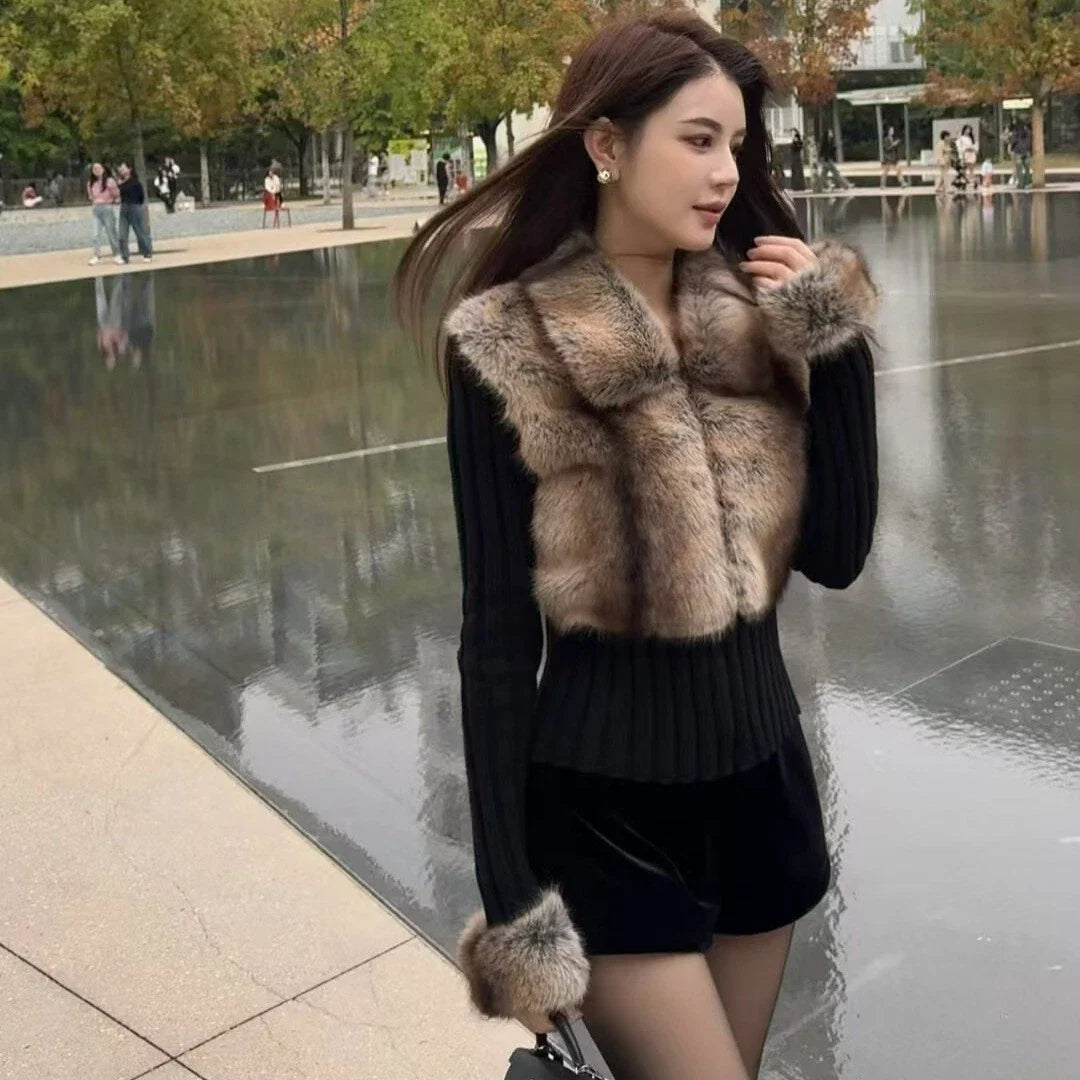 This is a knit cardigan with faux fur collar & cuff accents featuring a slim-fitting ribbed knit base, oversized beige-brown faux fur shoulder/collar panel, and matching faux fur cuffs. The style merges "cozy everyday comfort" (stretchy knit fabric) with "luxurious statement texture" (plush faux fur details)—aligning with "autumn/winter casual outings, urban daily styling, or upscale weekend gatherings" trends, suitable for park walks, café visits, or pairing with tailored bottoms to balance the soft textures.