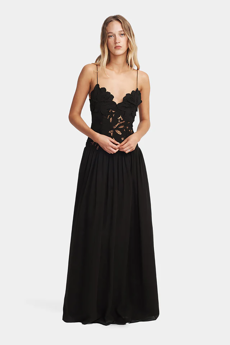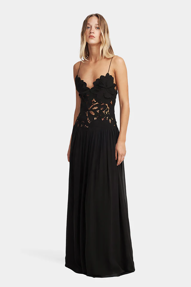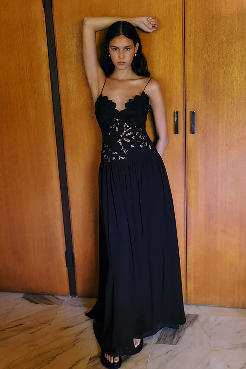 This flowing black floor-length gown is adorned with elegant three-dimensional floral appliqués, while the bodice features a leaf-shaped cutout design. Paired with black strappy heels and minimalist gold jewelry, it exudes a sophisticated and elegant evening style.