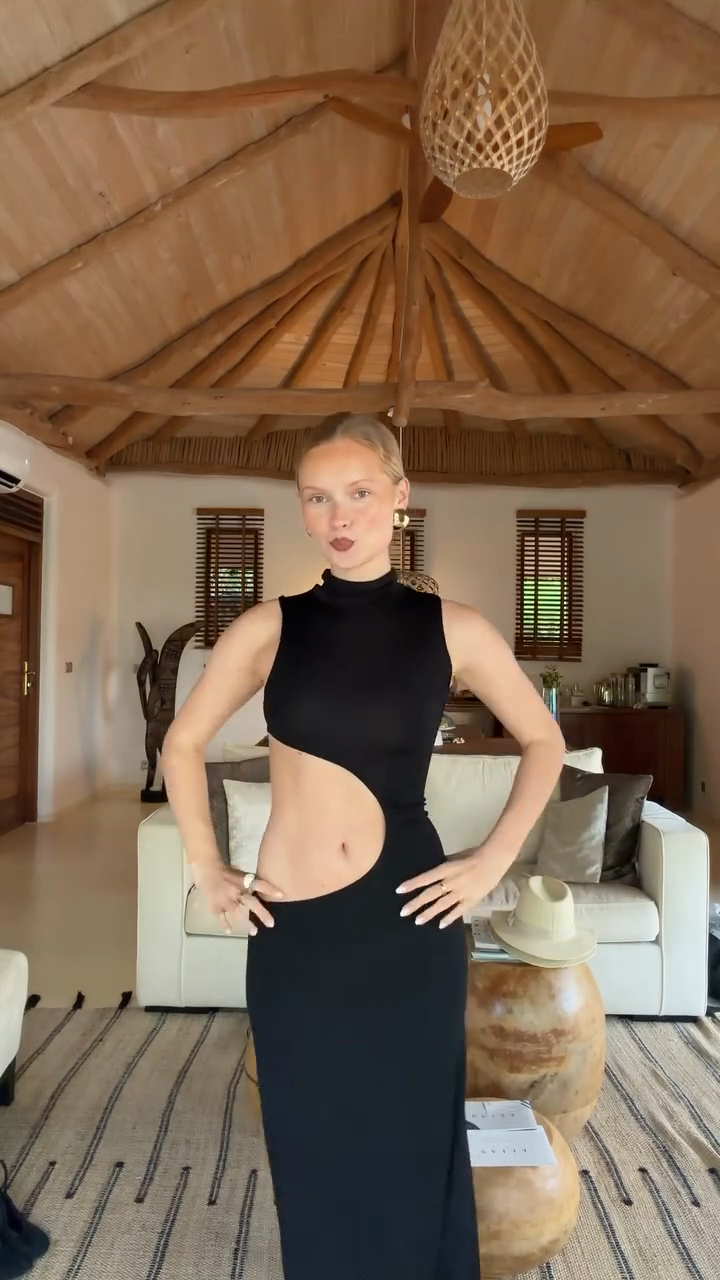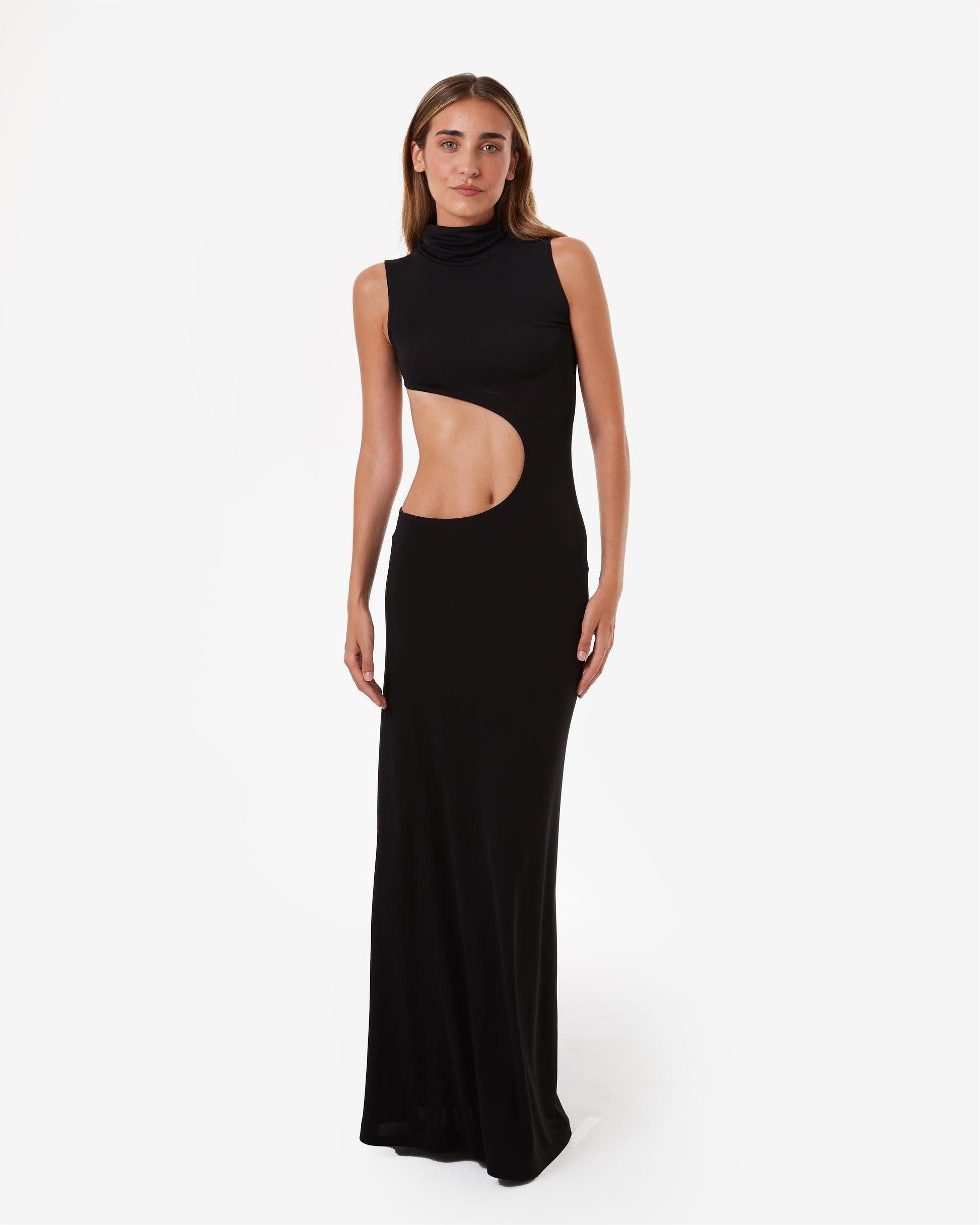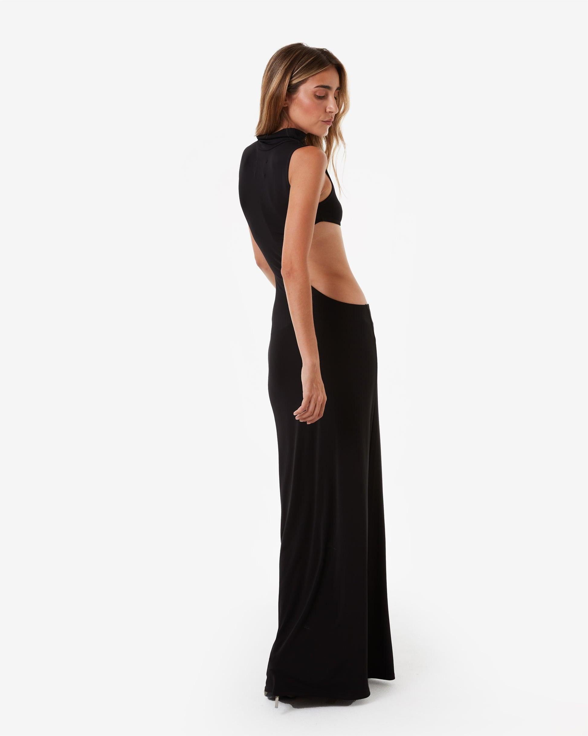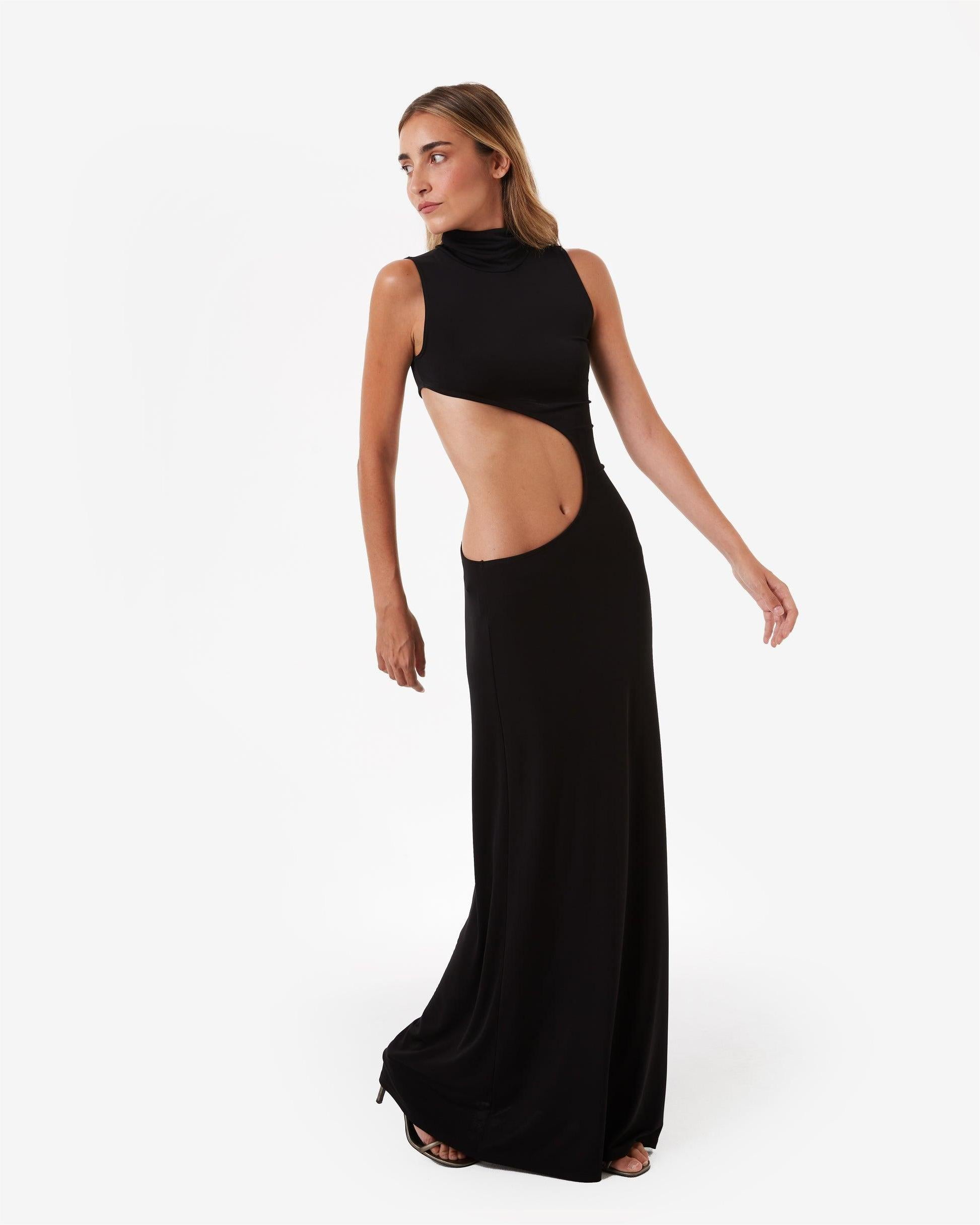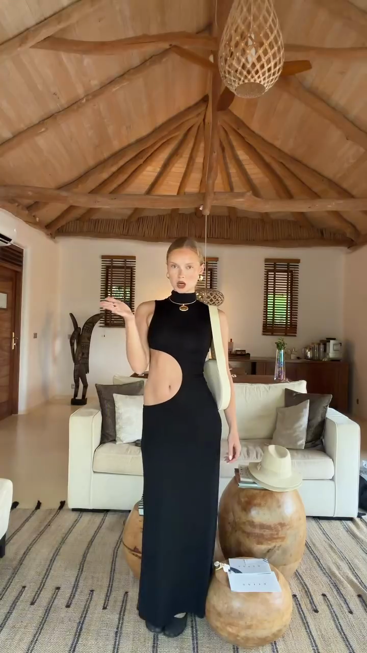 A black sleeveless high-neck openwork maxi dress, with its modern silhouette and effortless sex appeal, elevates a stylish and glamorous look.