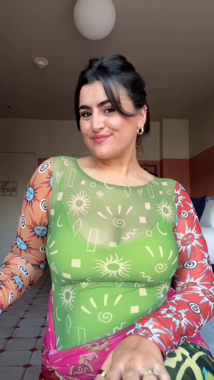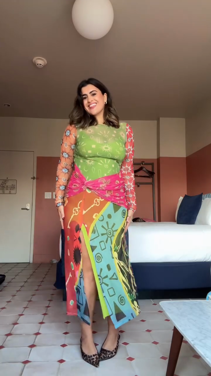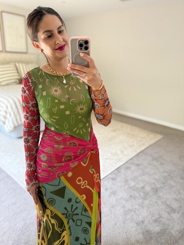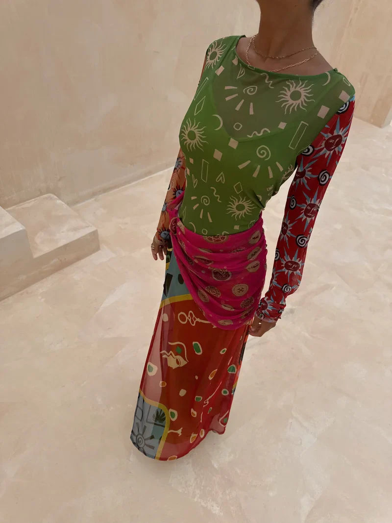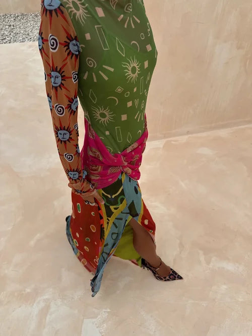 A two-tone maxi dress crafted from sheer fabric, featuring a green base top and a multi-color wrap skirt —merging artistic print design with lightweight sheer texture for creative casual or vacation styling.