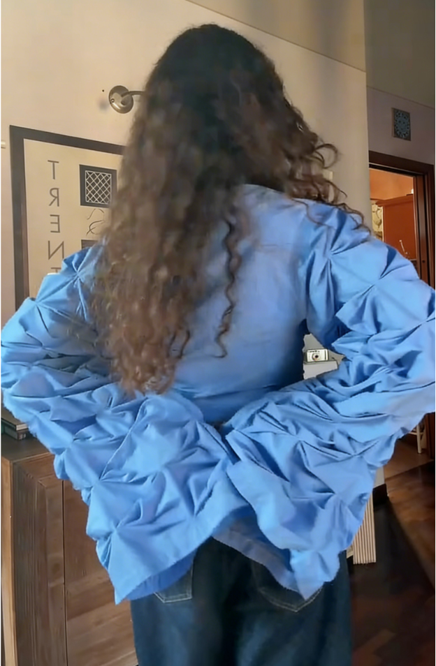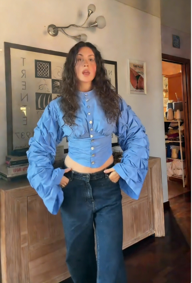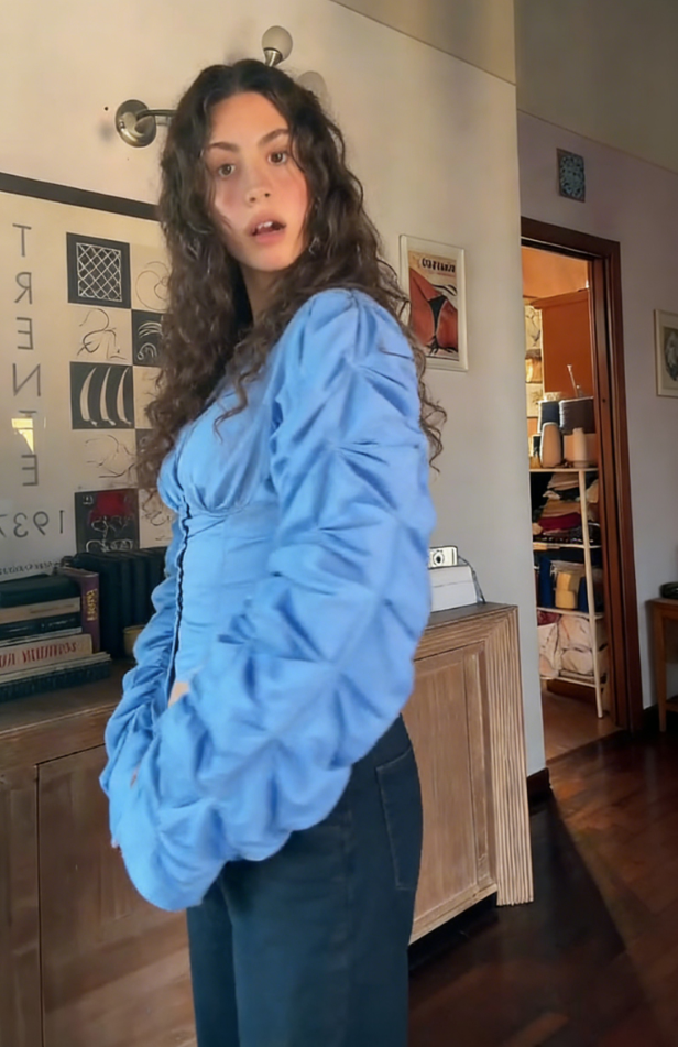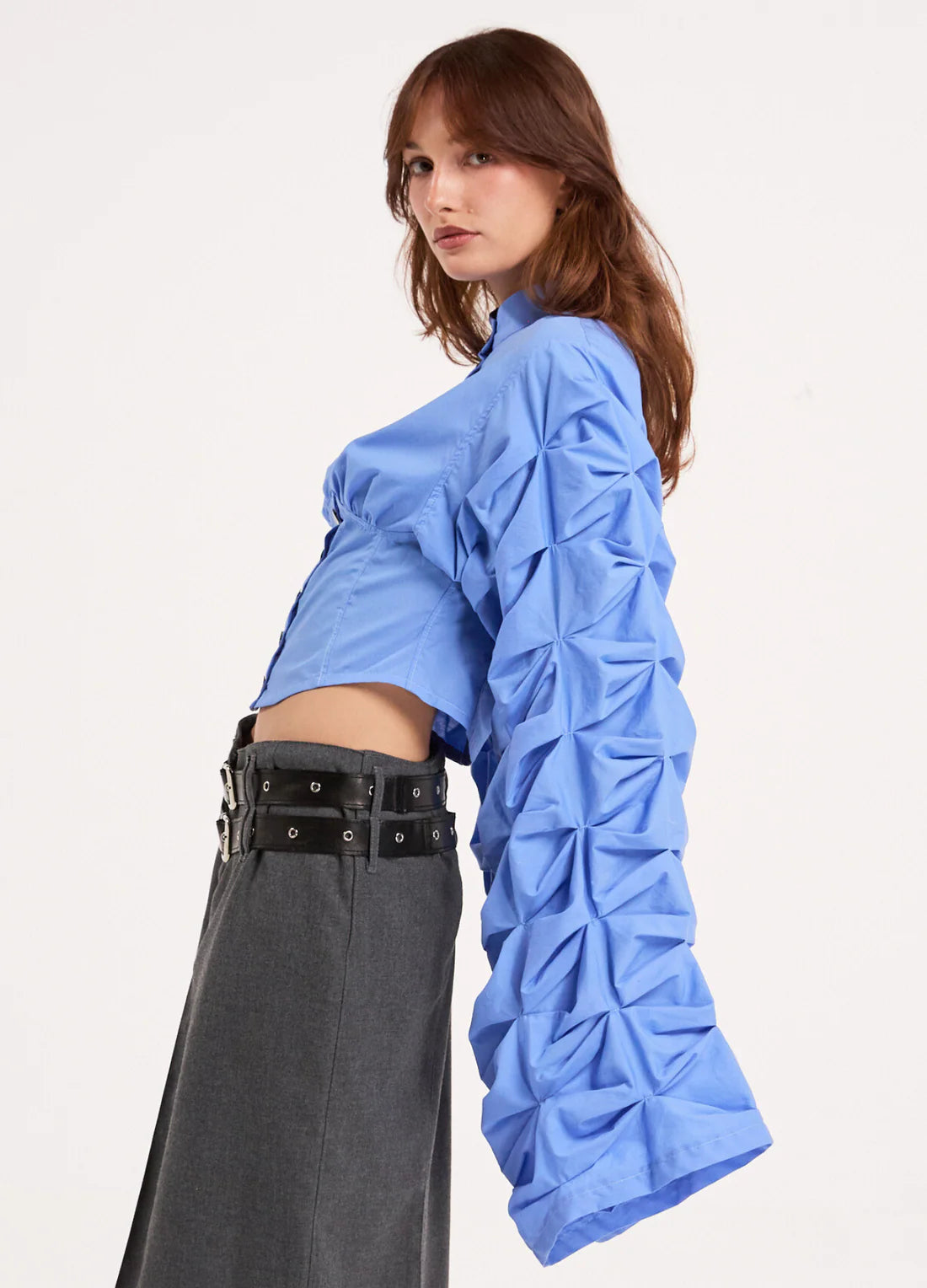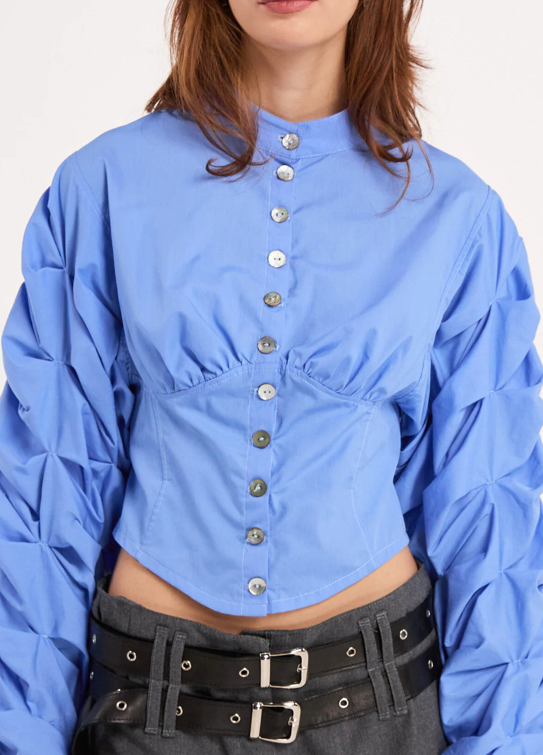 A bright blue crop shirt featuring a stand collar, full-button front, and dramatic ruched puff sleeves—merging structured cotton fabric with avant-garde silhouette details for artistic casual or statement styling.