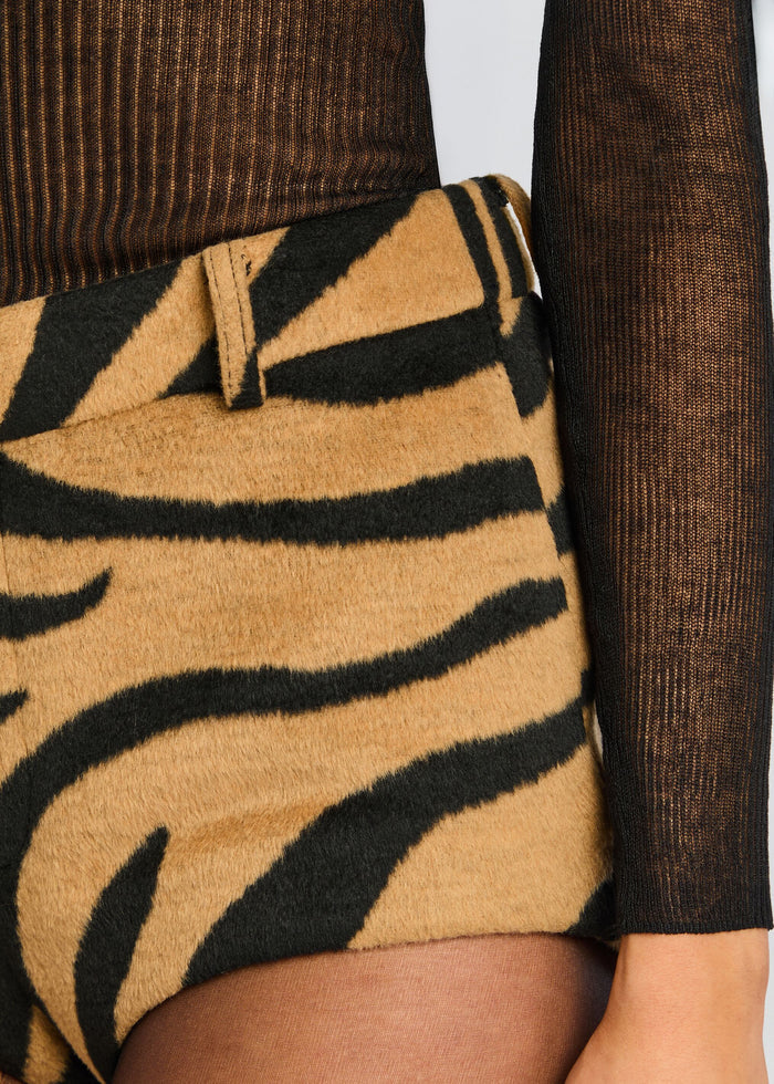 This two-piece set, crafted from a soft tan and black zebra-print wool blend, includes a long, double-breasted coat and matching shorts. Pair it with a chocolate-colored turtleneck sweater and pointed-toe heels for a sophisticated and elegant look.