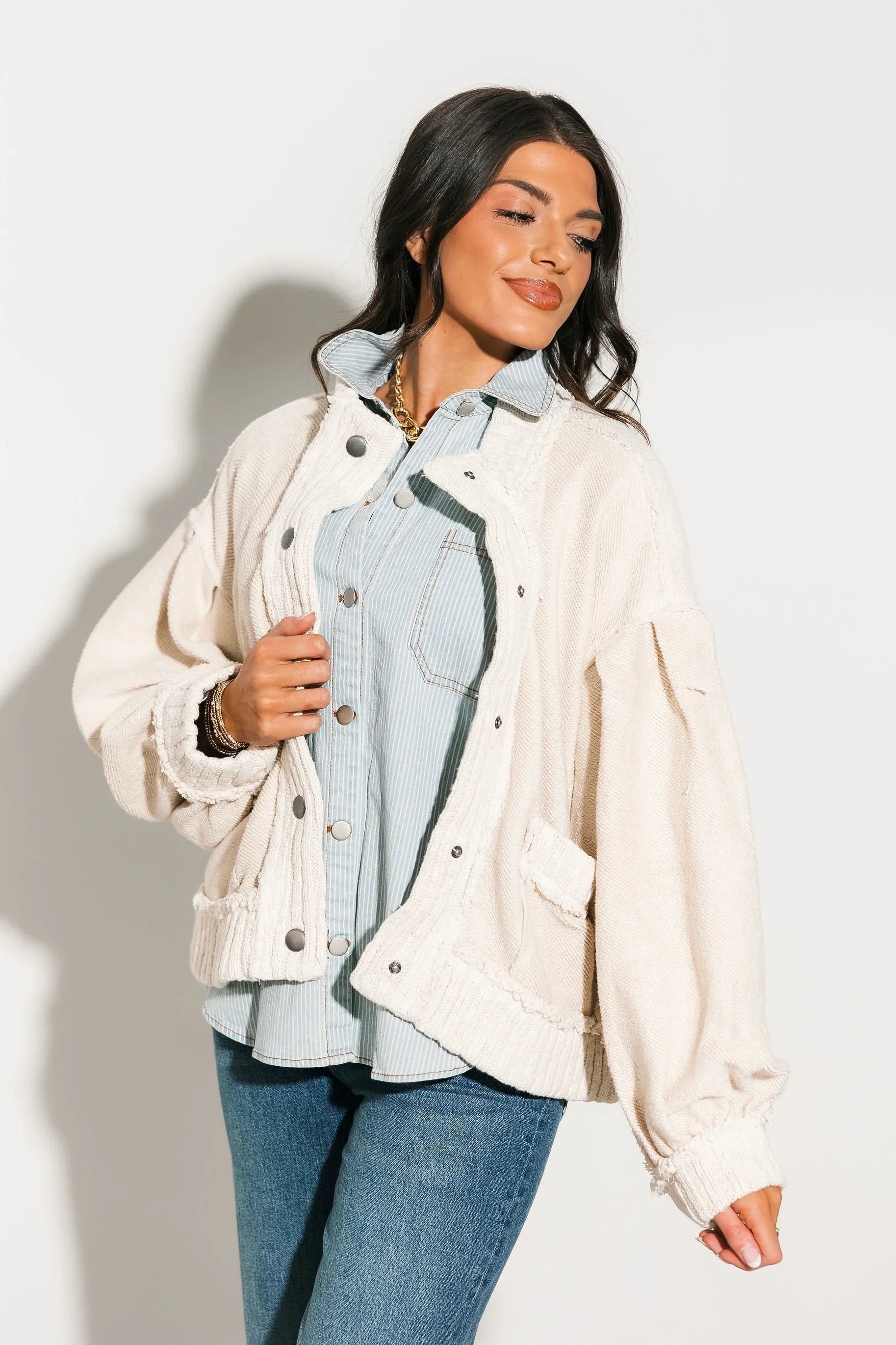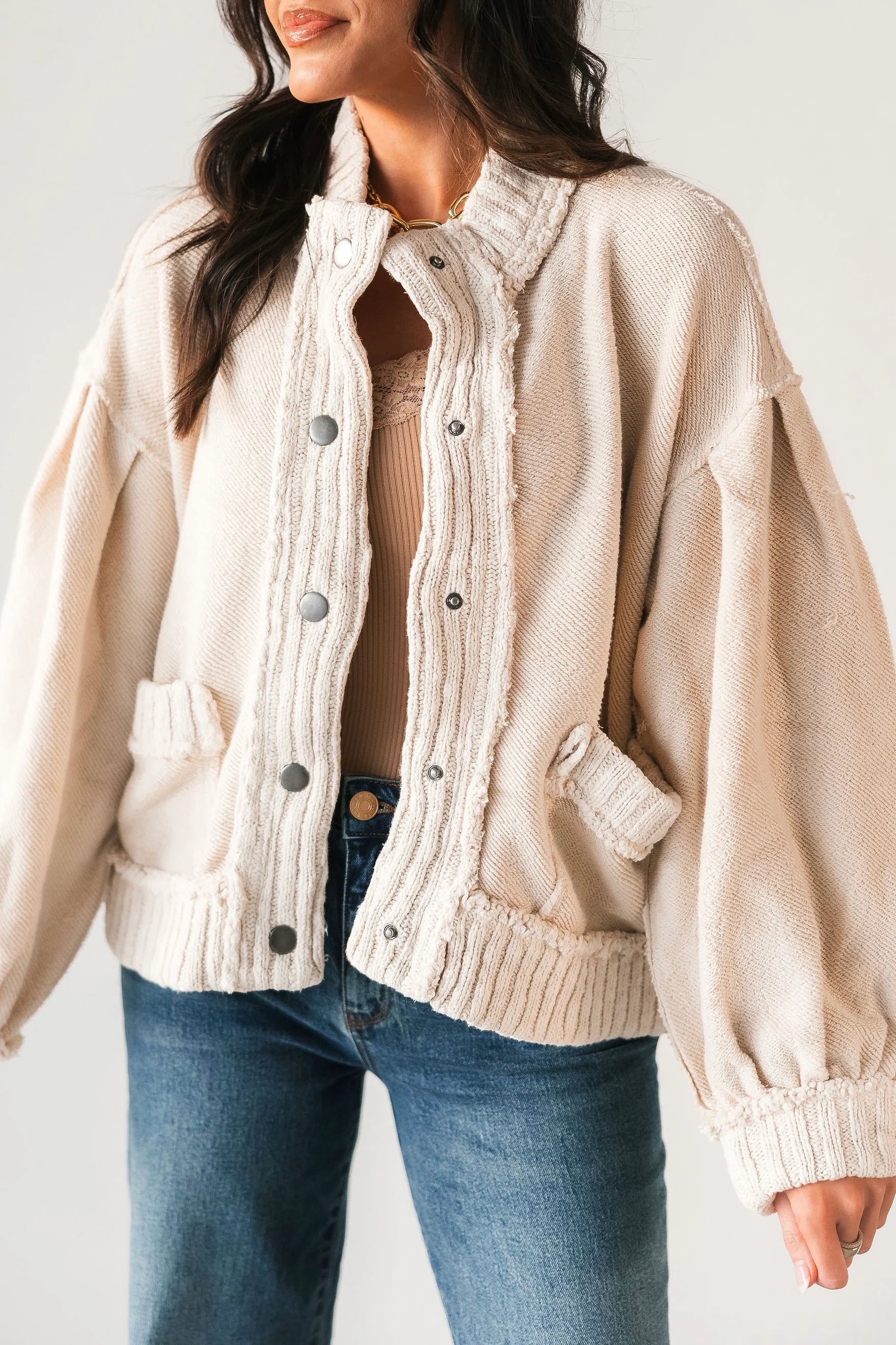 • Key Features: Oversized balloon sleeves , contrast metal buttons , cropped ribbed hem