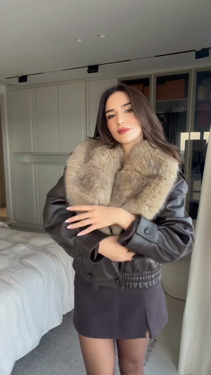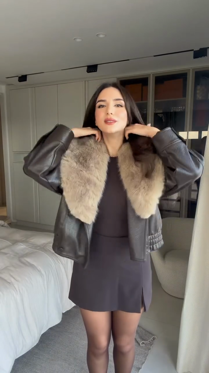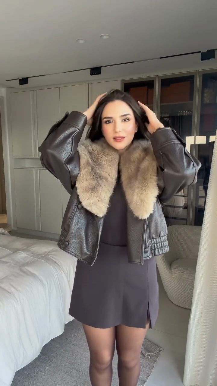 This jacket is crafted from smooth charcoal grey leather, featuring a relaxed fit and a soft beige faux fur collar. The cinched waist adds a touch of sophistication and elegance. Pair it with a matching charcoal grey mini skirt and sheer stockings for an effortlessly versatile monochromatic look.
