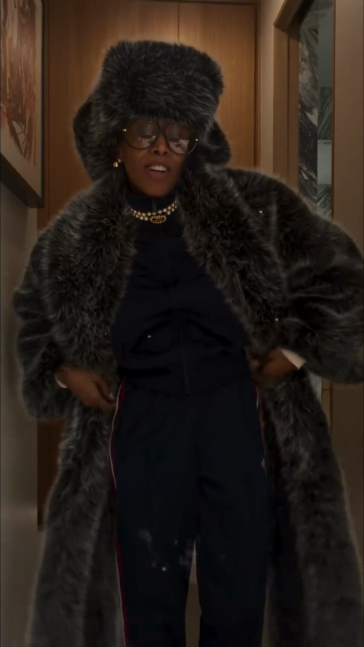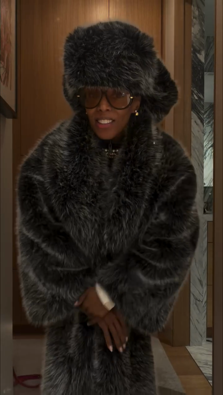 A charcoal oversized faux fur maxi coat crafted from plush, dense faux fur fabric, designed with an exaggerated oversized silhouette and full-length cut. Blends luxurious warmth with bold statement style, fitting cold-weather upscale outings, evening events or cozy urban looks—pair with minimal innerwear and sleek footwear to balance the coat’s voluminous texture.