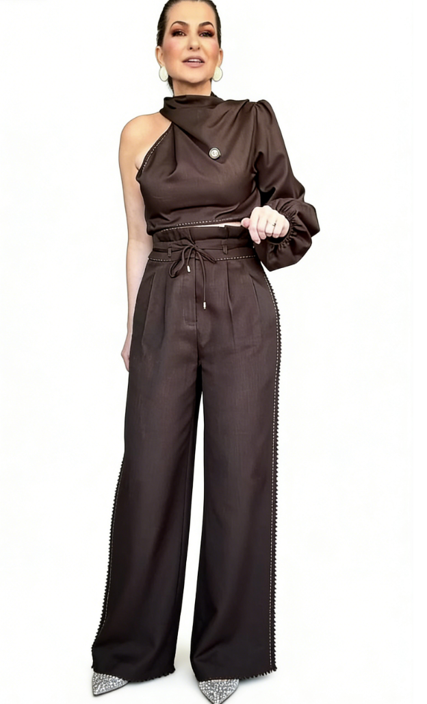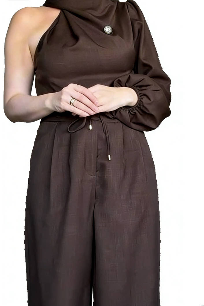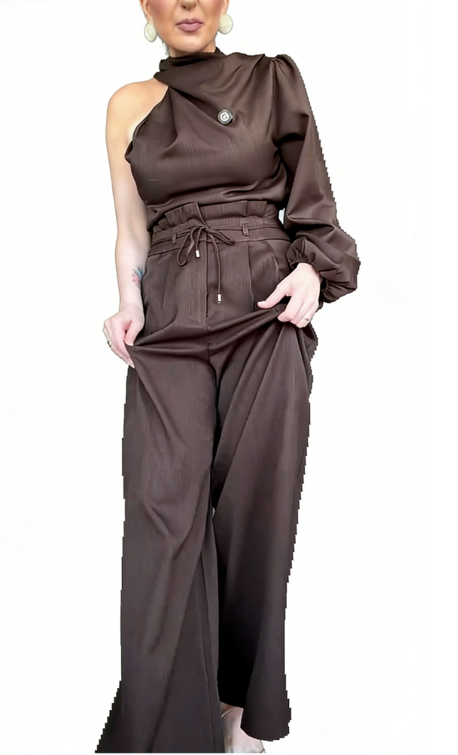 A two-piece chocolate brown set featuring a one-shoulder puff-sleeve top  and wide-leg pants , merging satin-like fabric texture with tailored details for elegant formal or evening styling.
