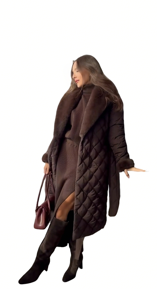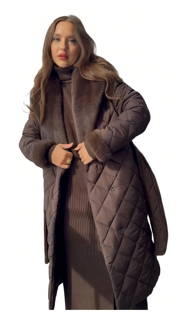 This chocolate brown quilted down jacket, adorned with faux fur, elevates a luxurious winter look with its comfortable texture and effortless elegance.