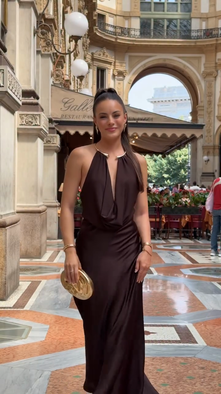 Elevate your formal or evening look with this Chocolate Brown Satin Halter Maxi Dress. The sleek halter neckline, draped front, and flowing maxi silhouette create a sophisticated, glamorous ensemble. Perfect for upscale dinners, special events, or stylish outings in elegant locations. Pair with metallic accessories and high - heels to complete the refined look.