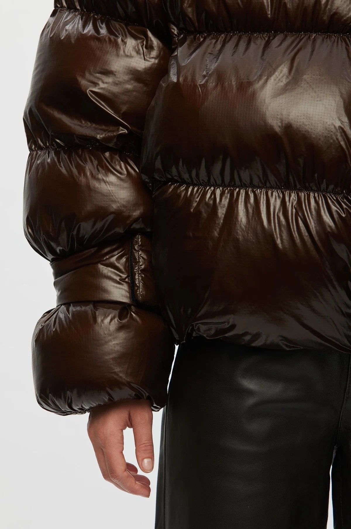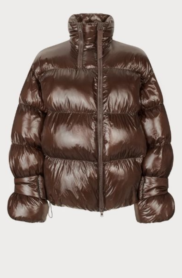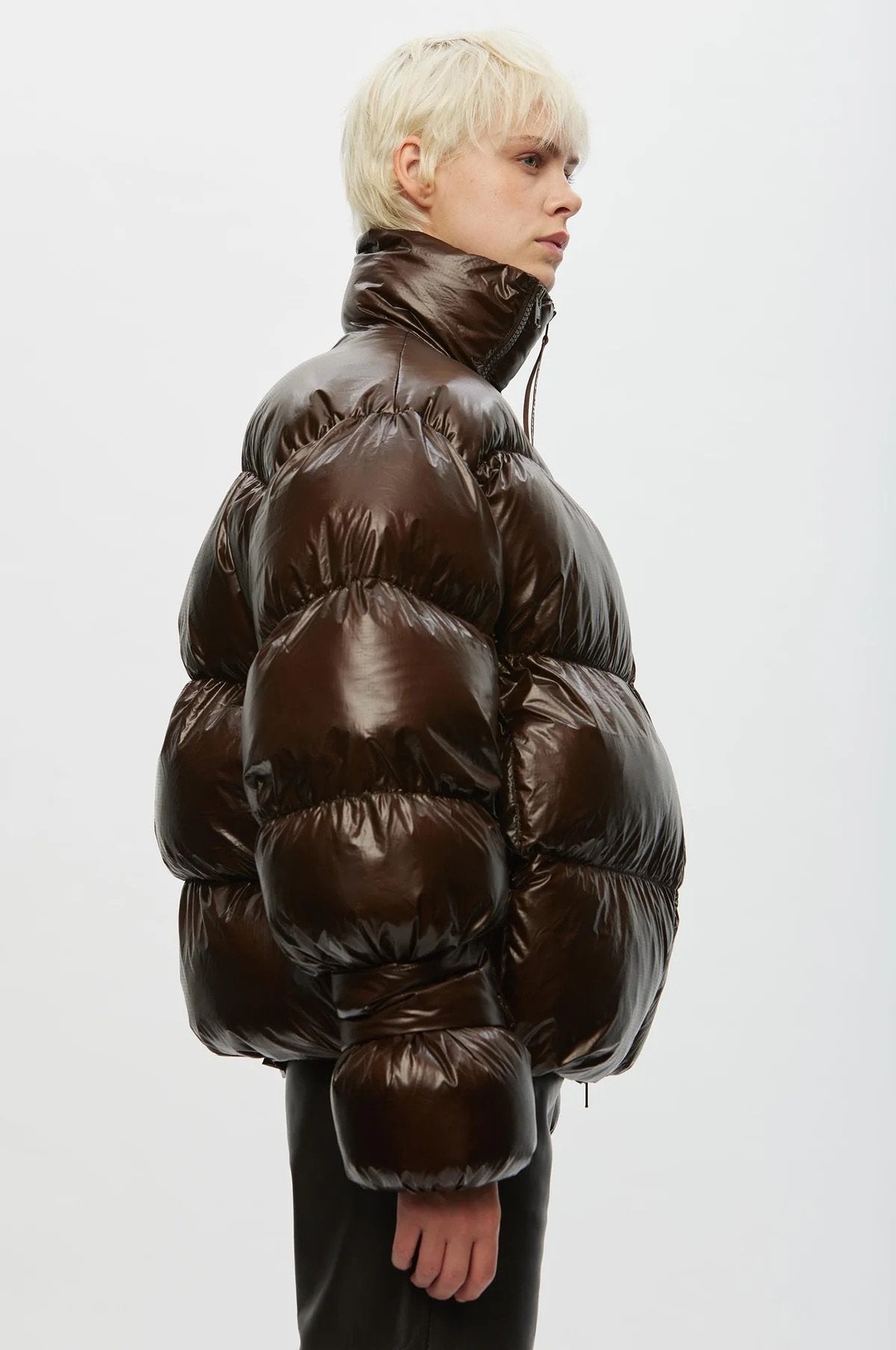 This glossy chocolate-colored down jacket features a relaxed fit, stand-up collar, and zipper, exuding fashionable charm. Try pairing it with black leather pants and pointed-toe boots for a more sophisticated look.
