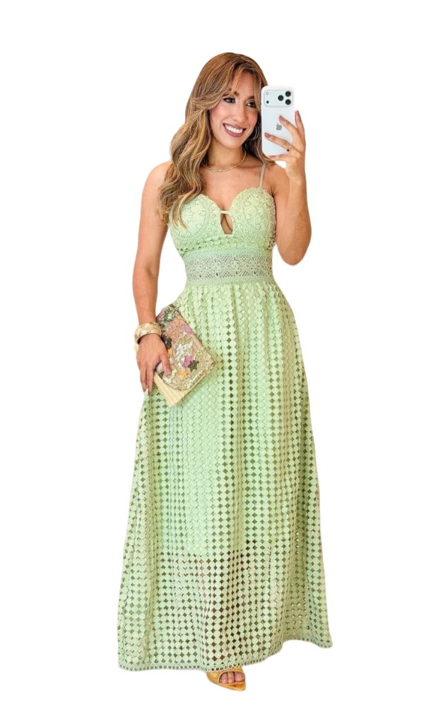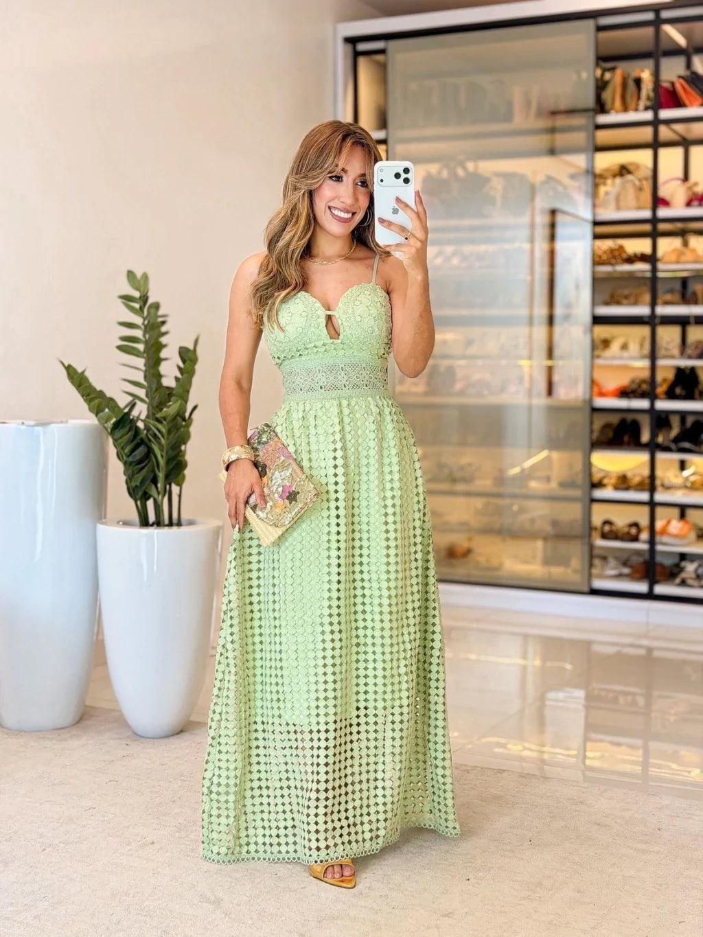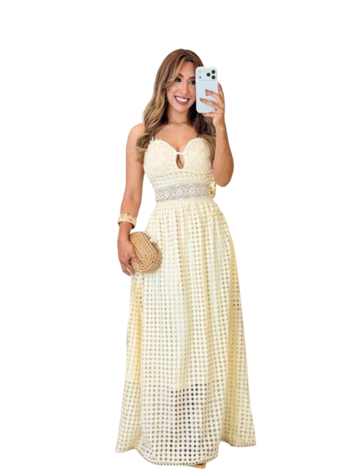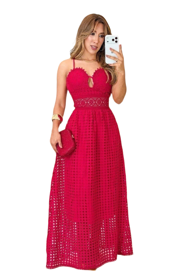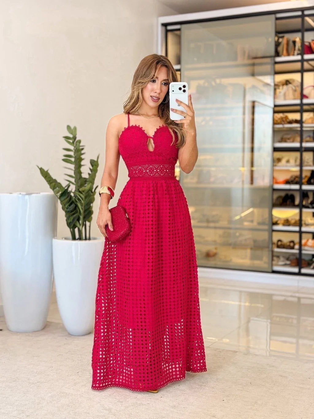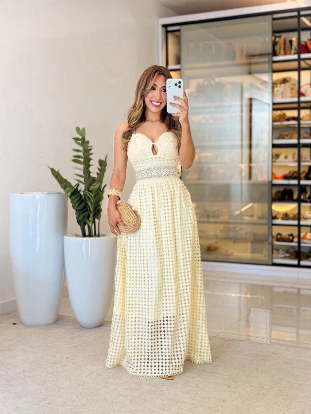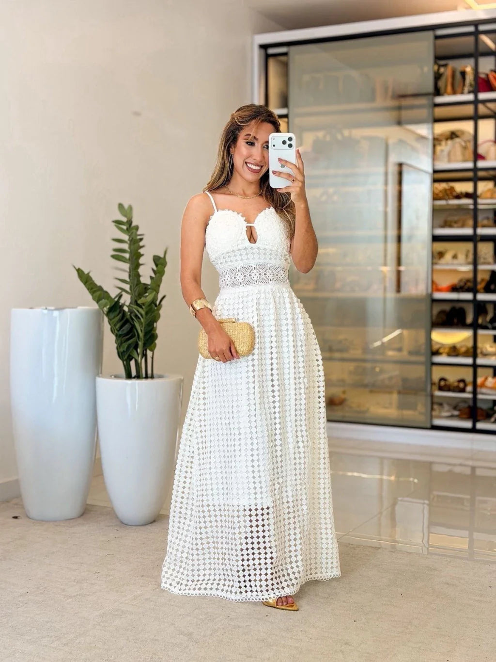 A crochet maxi dress featuring geometric cutout patterns, a lace waistband, and a strappy open-back silhouette—merging intricate crochet texture with feminine cutout details for summer casual or romantic occasion styling.
