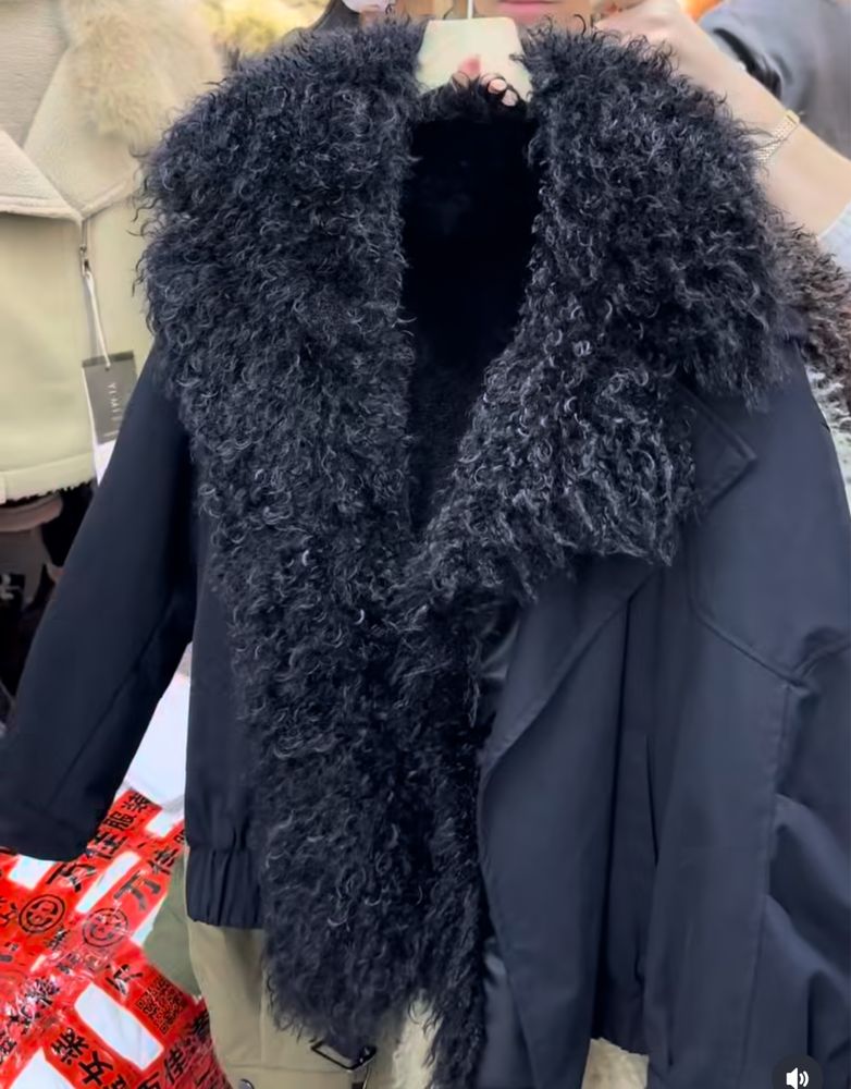An oversized parka accented with a voluminous curly faux fur collar, merging winter practicality with textured luxury for cold-weather casual styling.