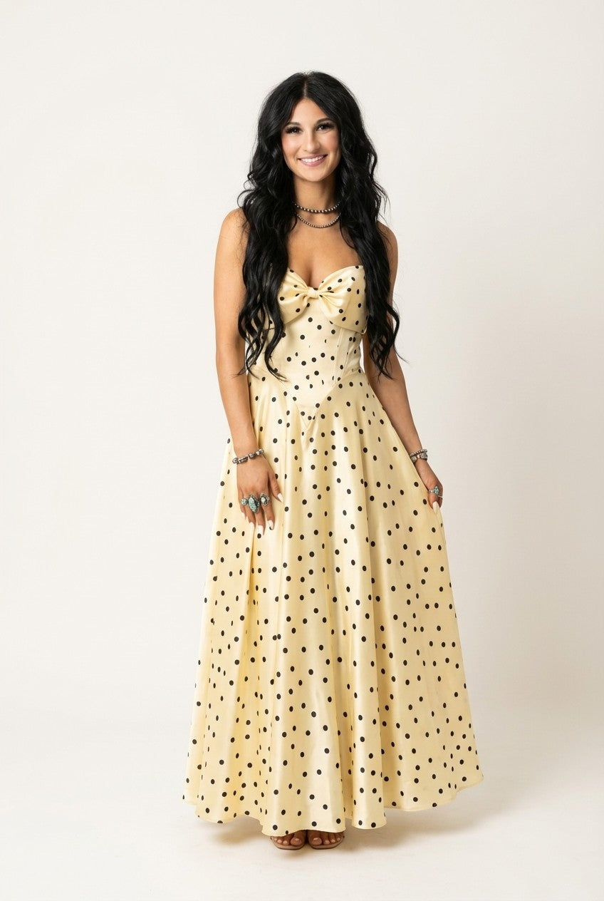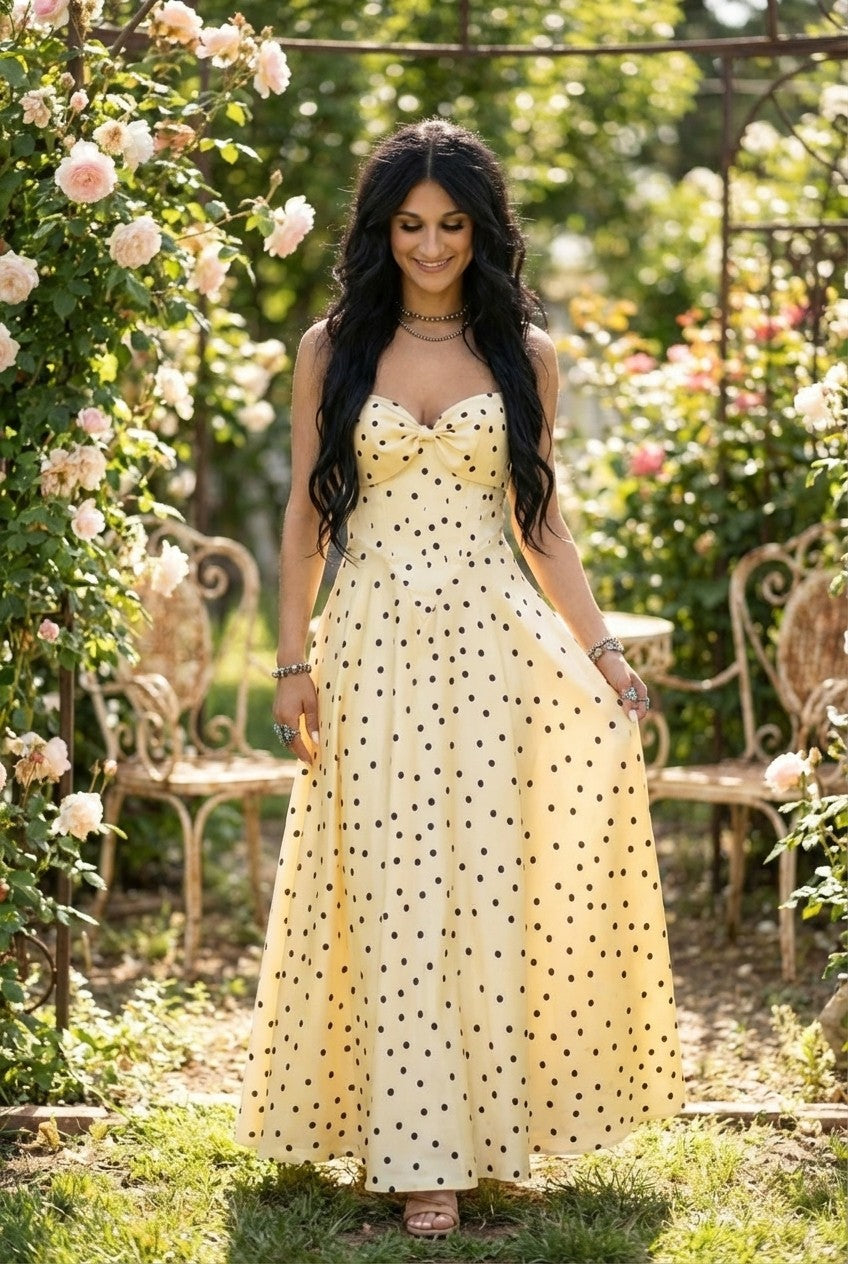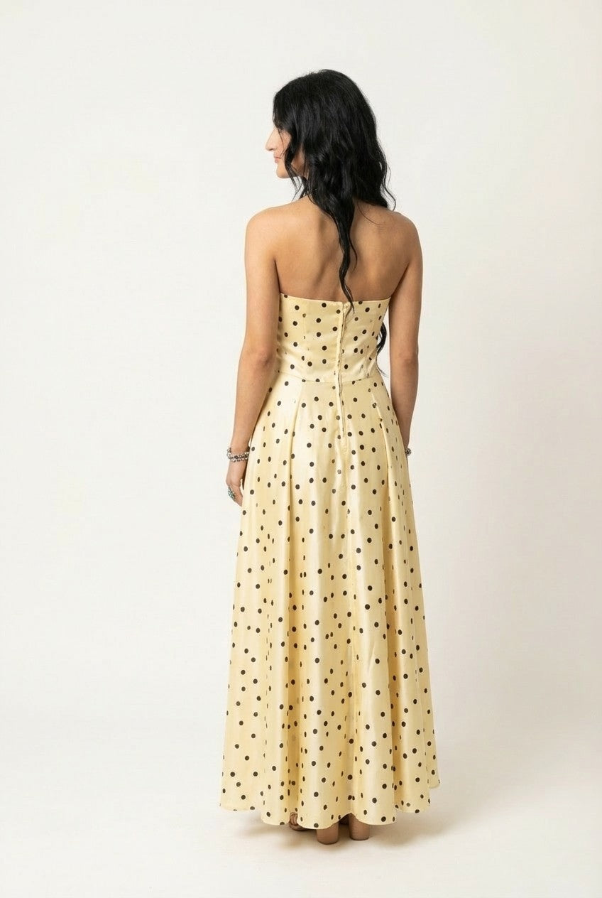 This polka dot maxi dress captures effortless femininity with its sculpted bodice and flowing skirt, designed to move beautifully with every step.