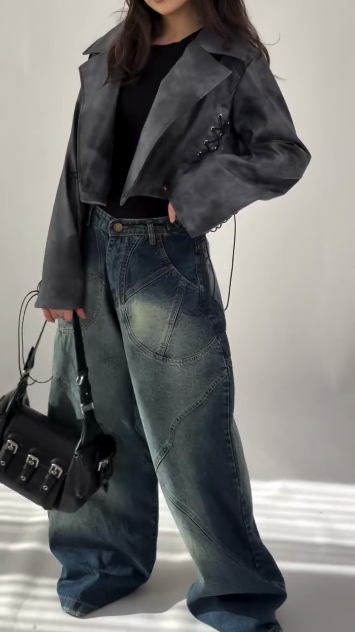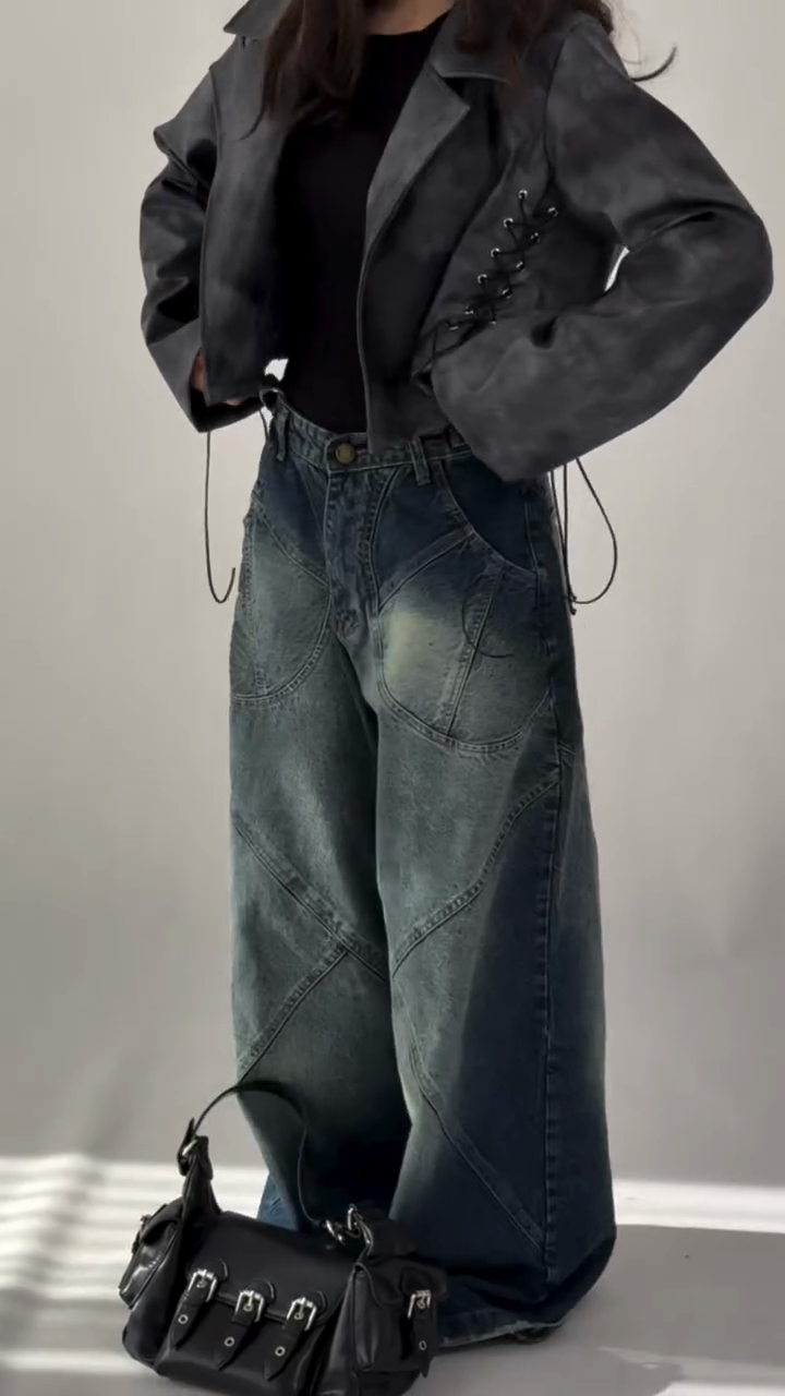 • Key Features: Dark gradient wash, oversized wide-leg, asymmetric stitching detail, classic pocket structure