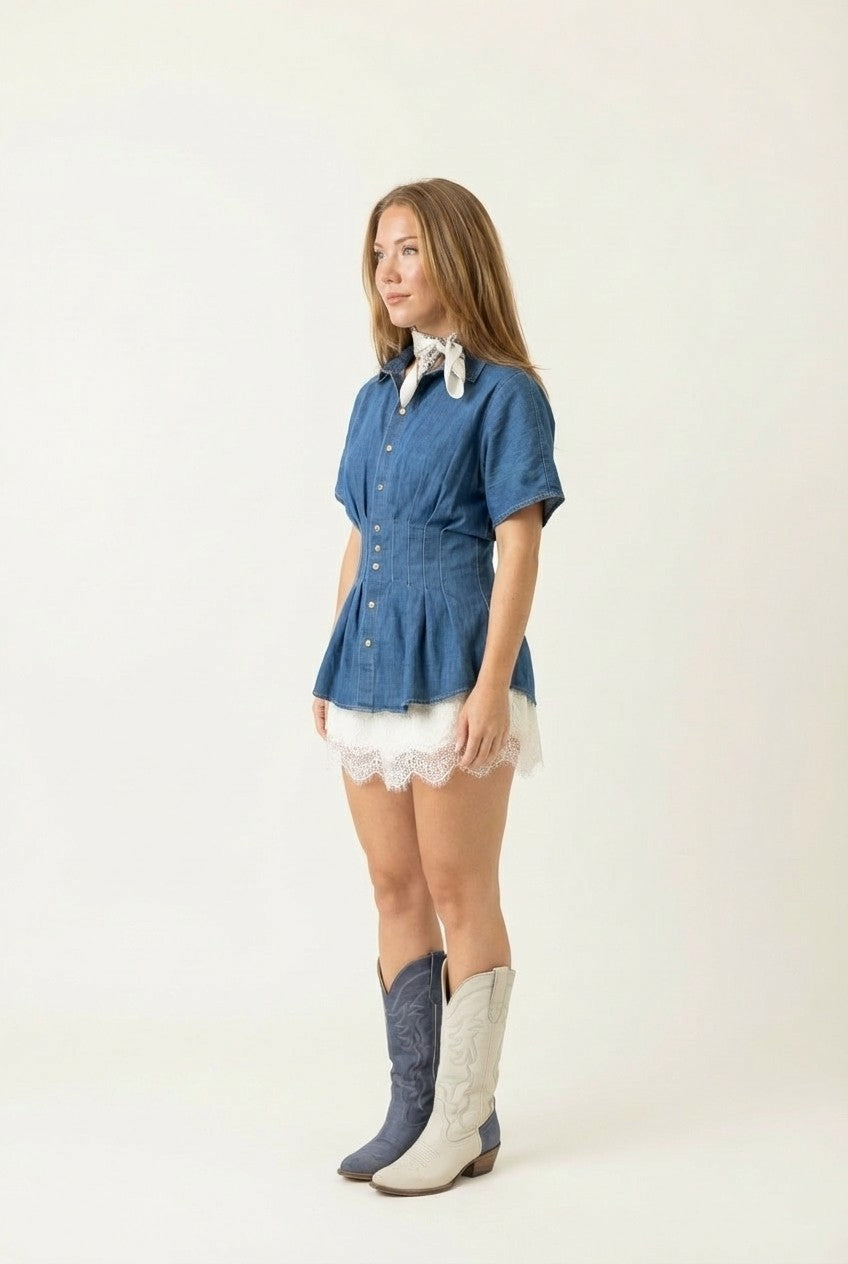 This denim-inspired two-piece set combines casual structure with soft feminine details, creating a look that feels both relaxed and uniquely charming.