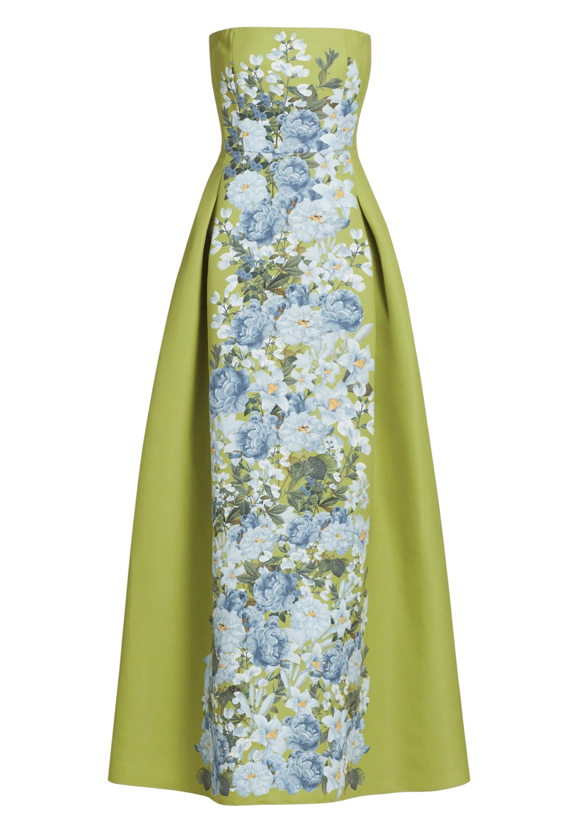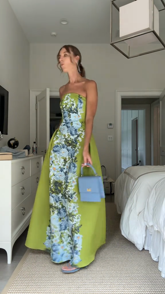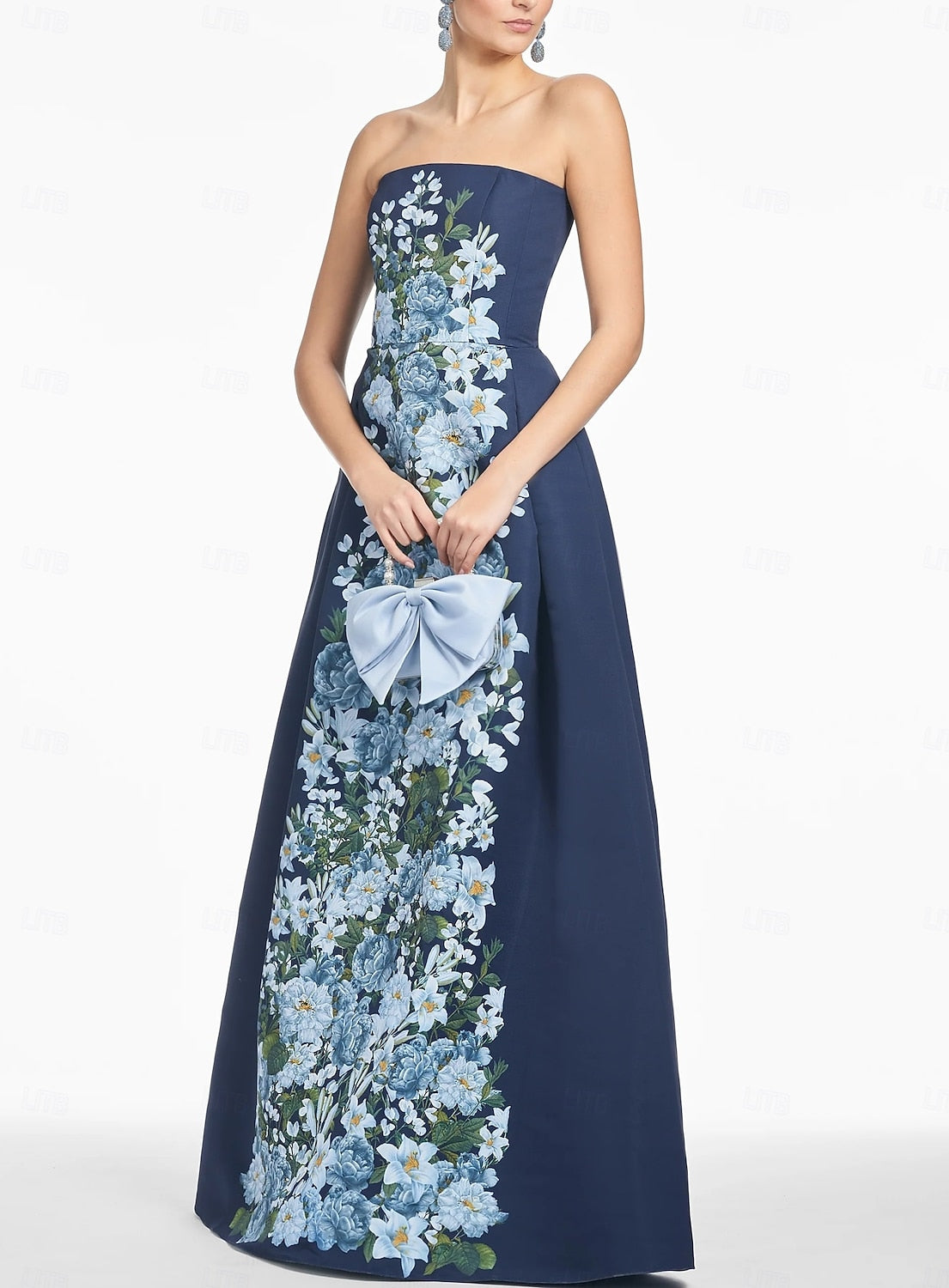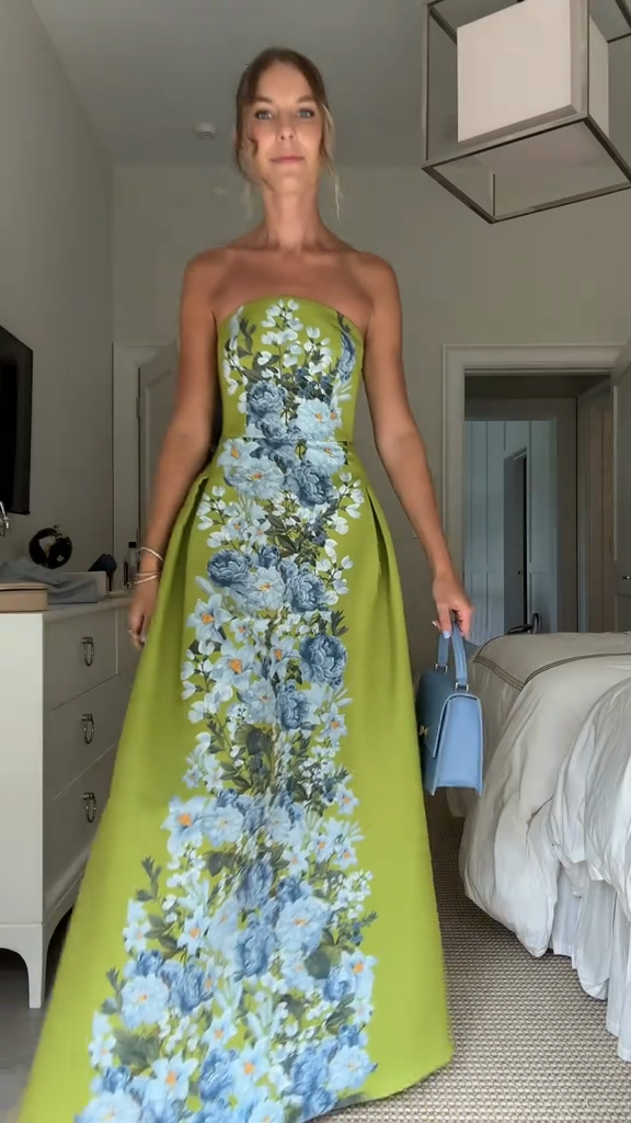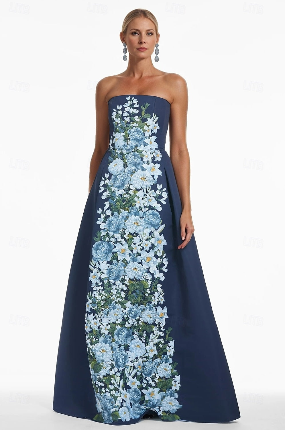 A strapless floral evening gown in structured fabric (vibrant blue-white floral print, fitted bodice, A-line maxi skirt). It blends elegant strapless design with romantic floral elements, fitting formal events like proms, galas or wedding receptions—pair with delicate accessories to enhance the sophisticated vibe.