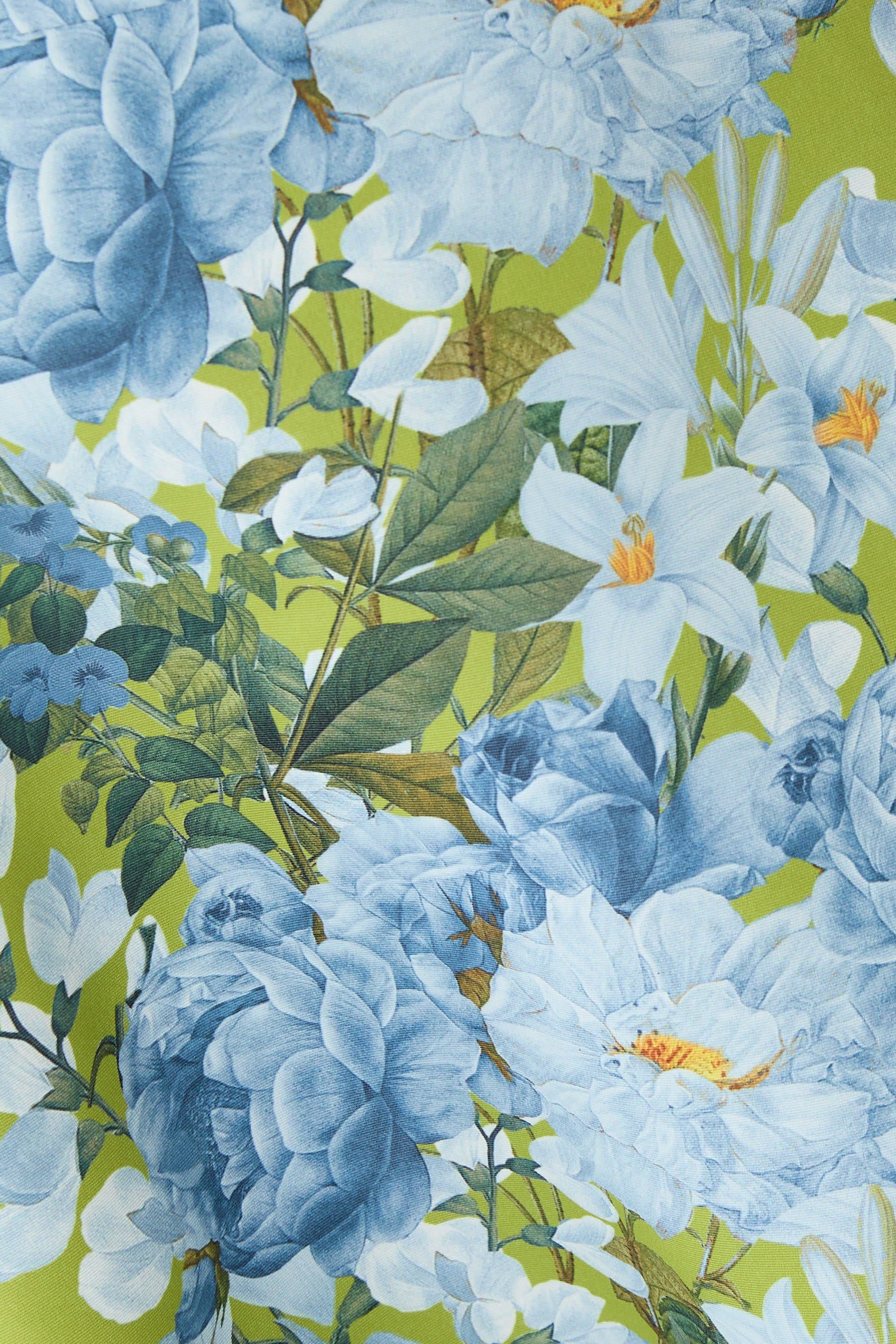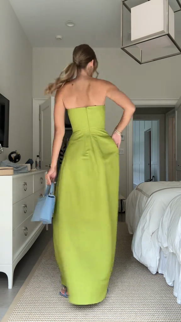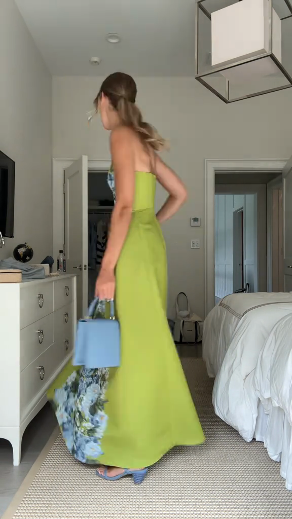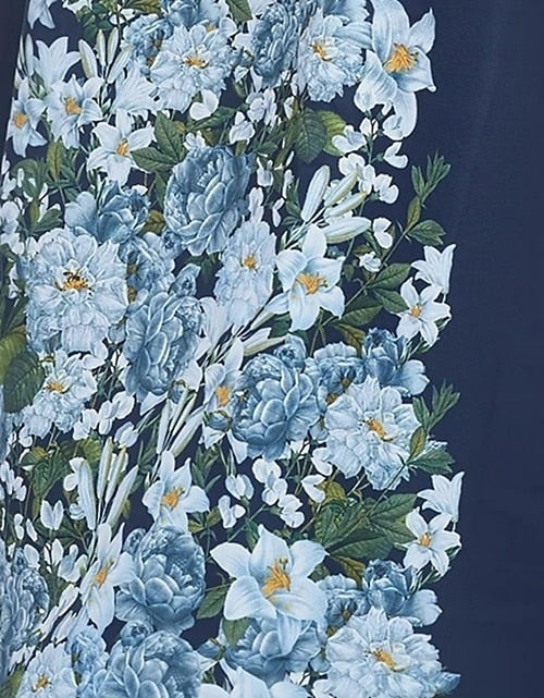 • Key Features: Strapless neckline, fitted bodice, A-line maxi skirt, side pockets, blue-white floral print