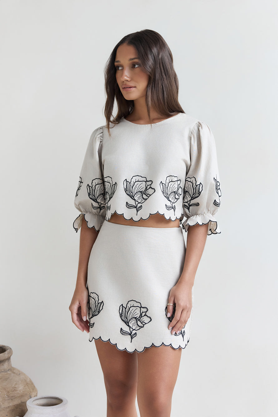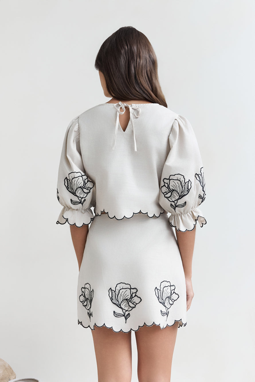 • Design: Cropped top with puff sleeves, mini skirt, black floral embroidery, and scalloped edges.
