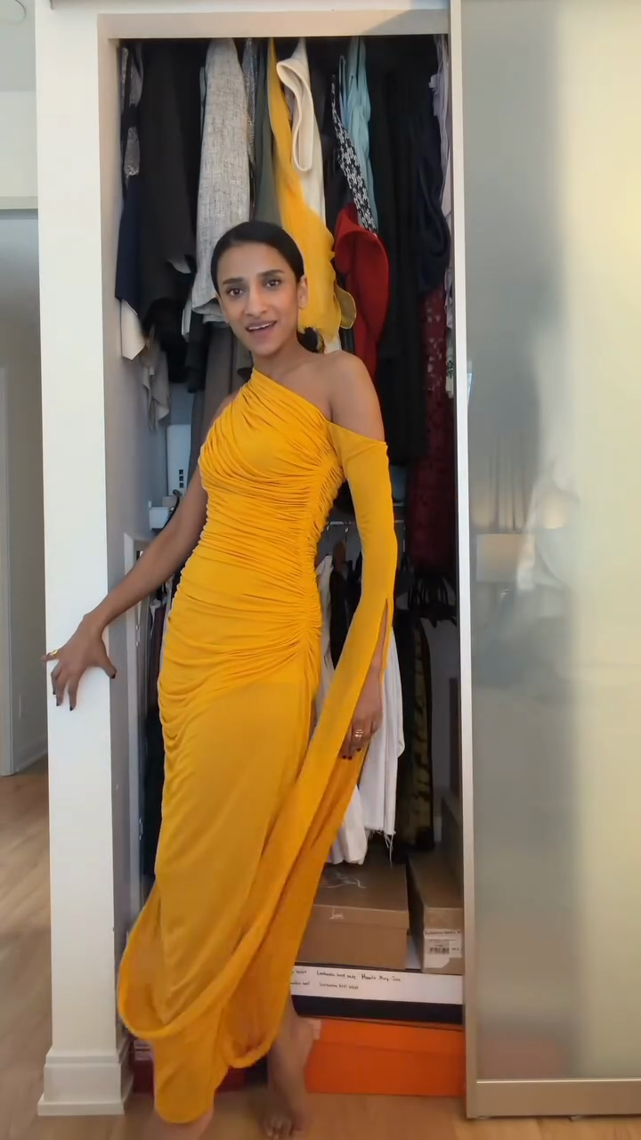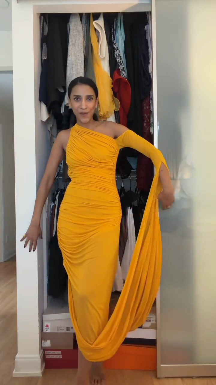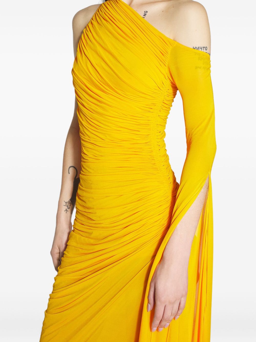 This is a  one-shoulder ruched maxi dress featuring a body-con silhouette, asymmetric single long sleeve, and draped fabric detail. The style merges "bold statement color" (saturated yellow hue) with "slinky, feminine texture" (all-over ruched fabric)—aligning with "red-carpet events, evening galas, or upscale cocktail parties" trends, suitable for formal celebrations, premium nightlife, or high-profile social gatherings.