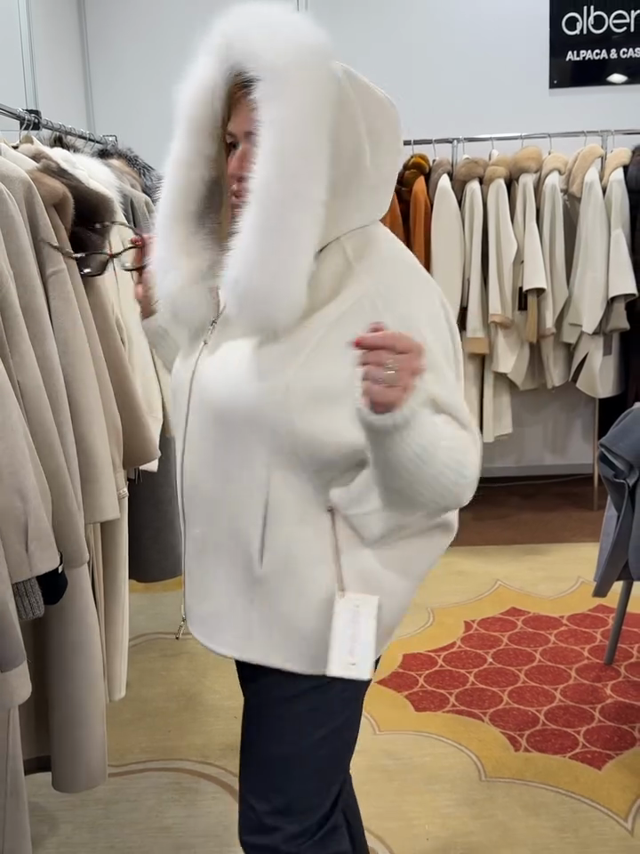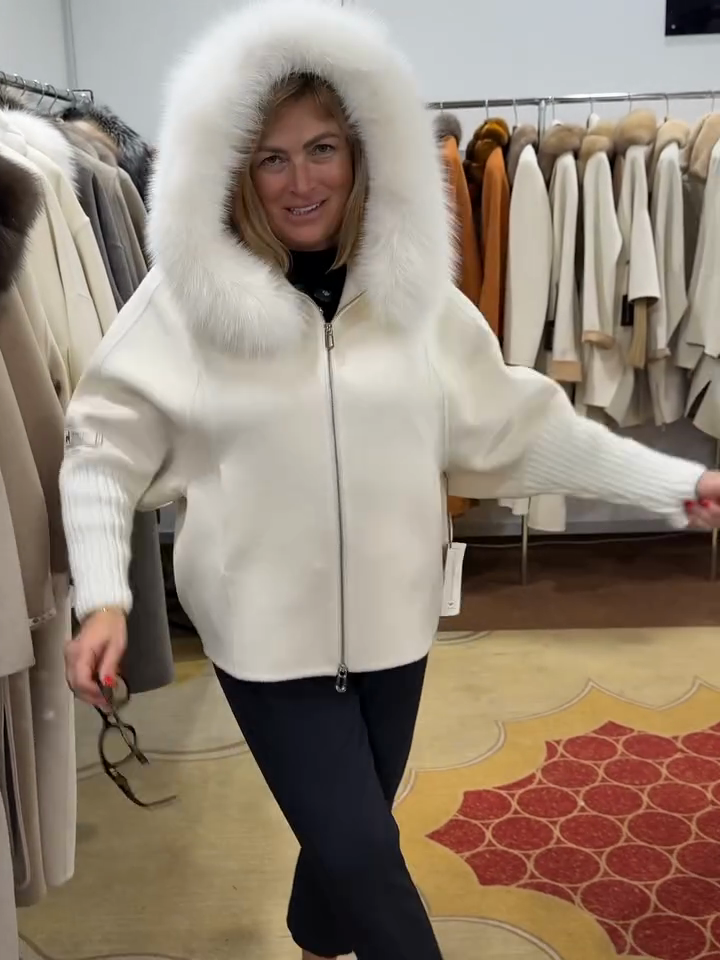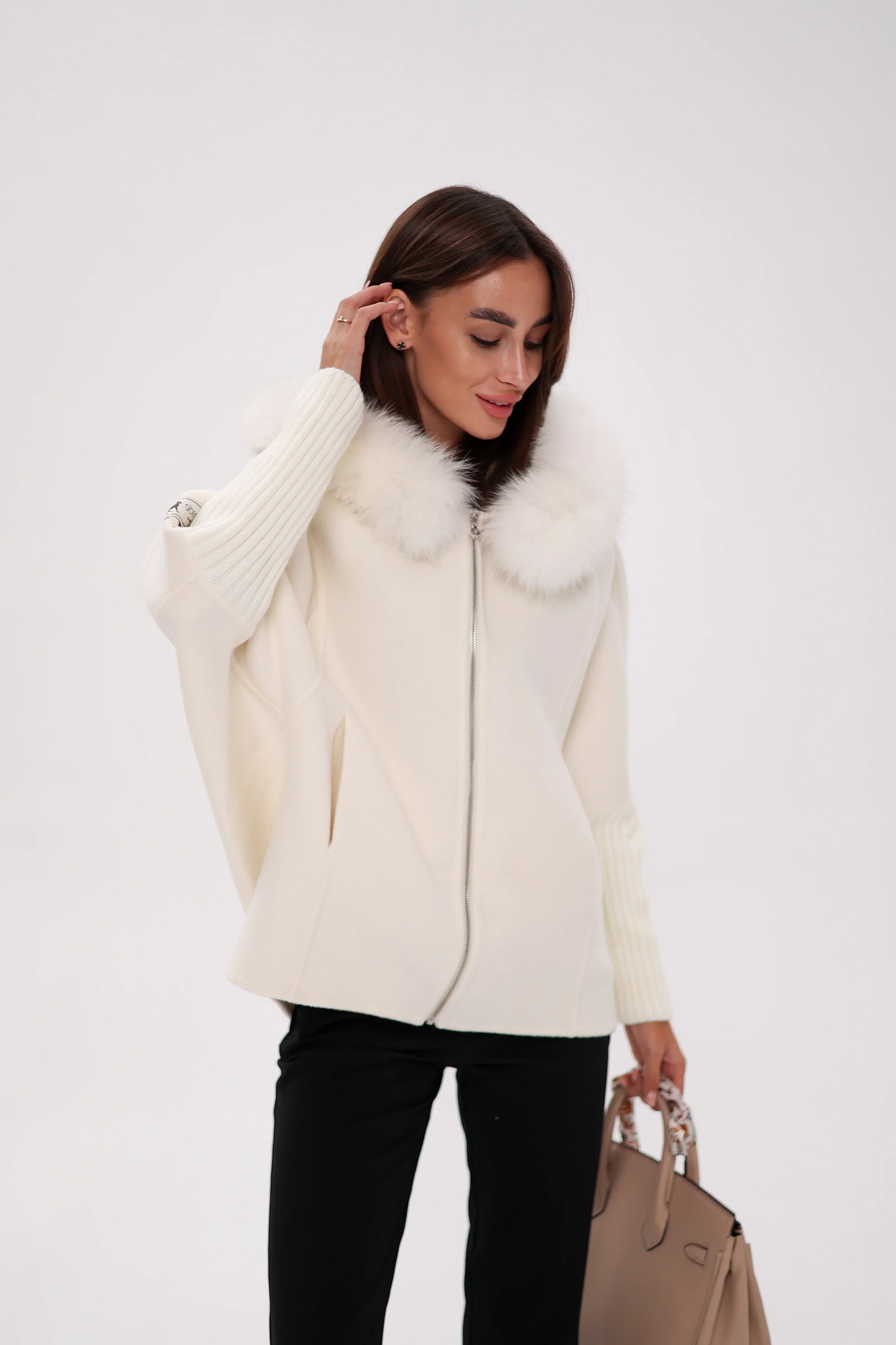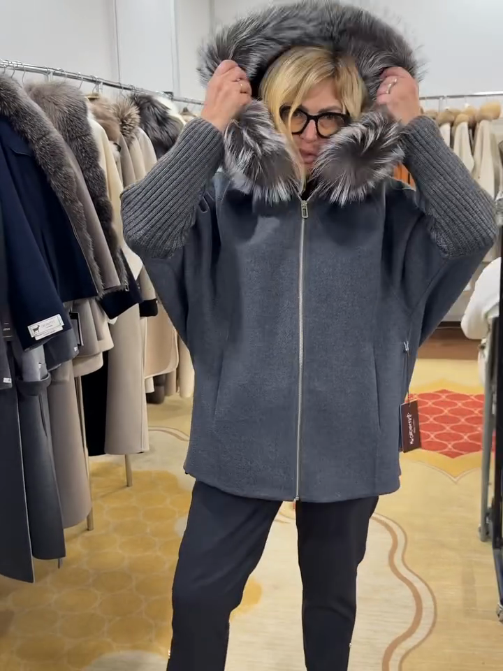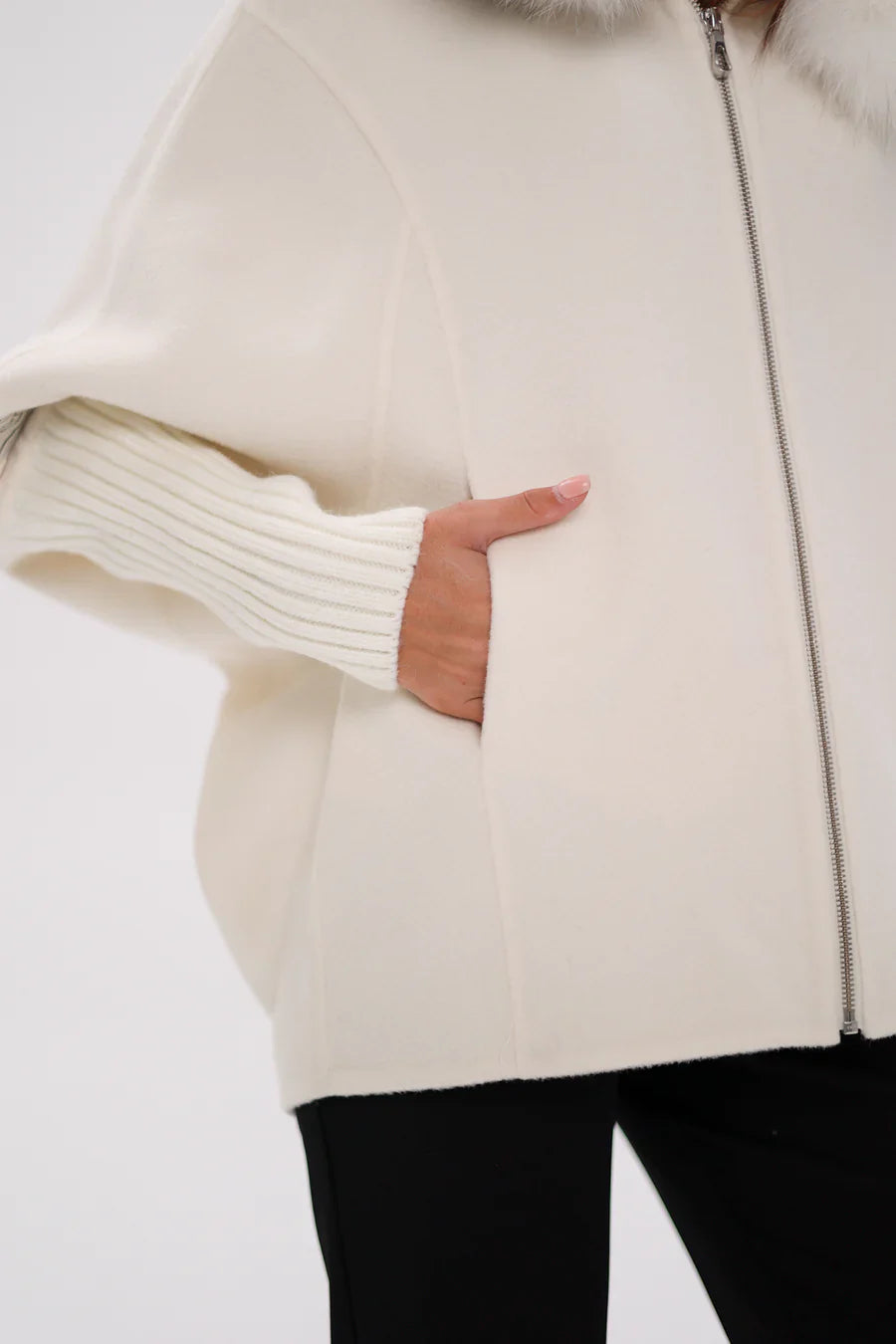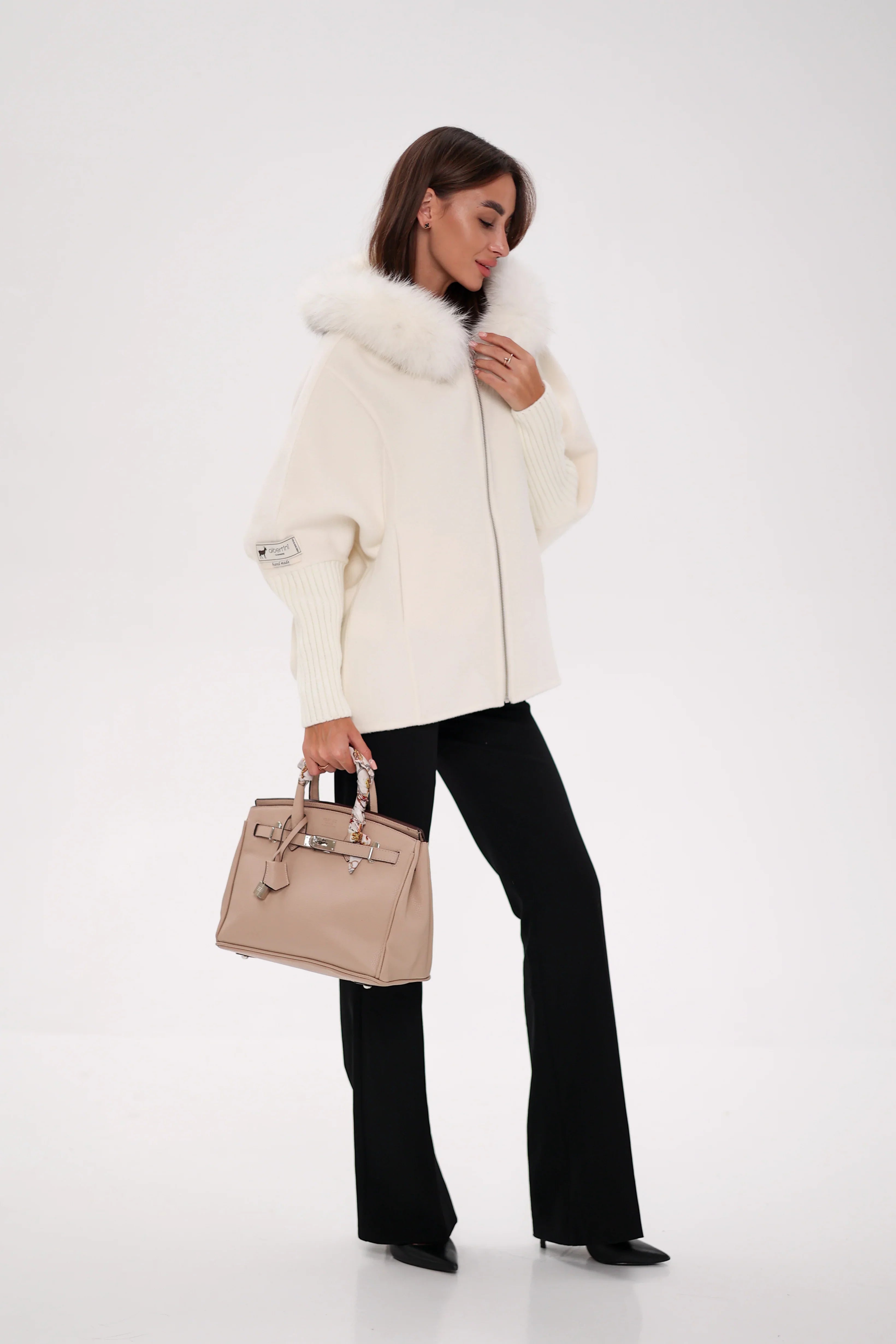 A faux fur hooded knit-sleeve jacket crafted from soft wool-like fabric . Blends luxurious warmth with casual relaxed style, fitting winter daily commutes, weekend outings or cold-weather social gatherings—pair with dark slim-fit pants to balance the jacket’s voluminous silhouette.