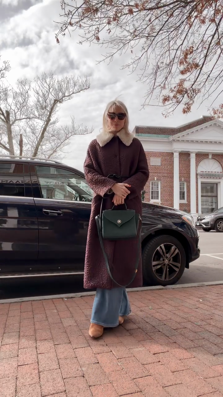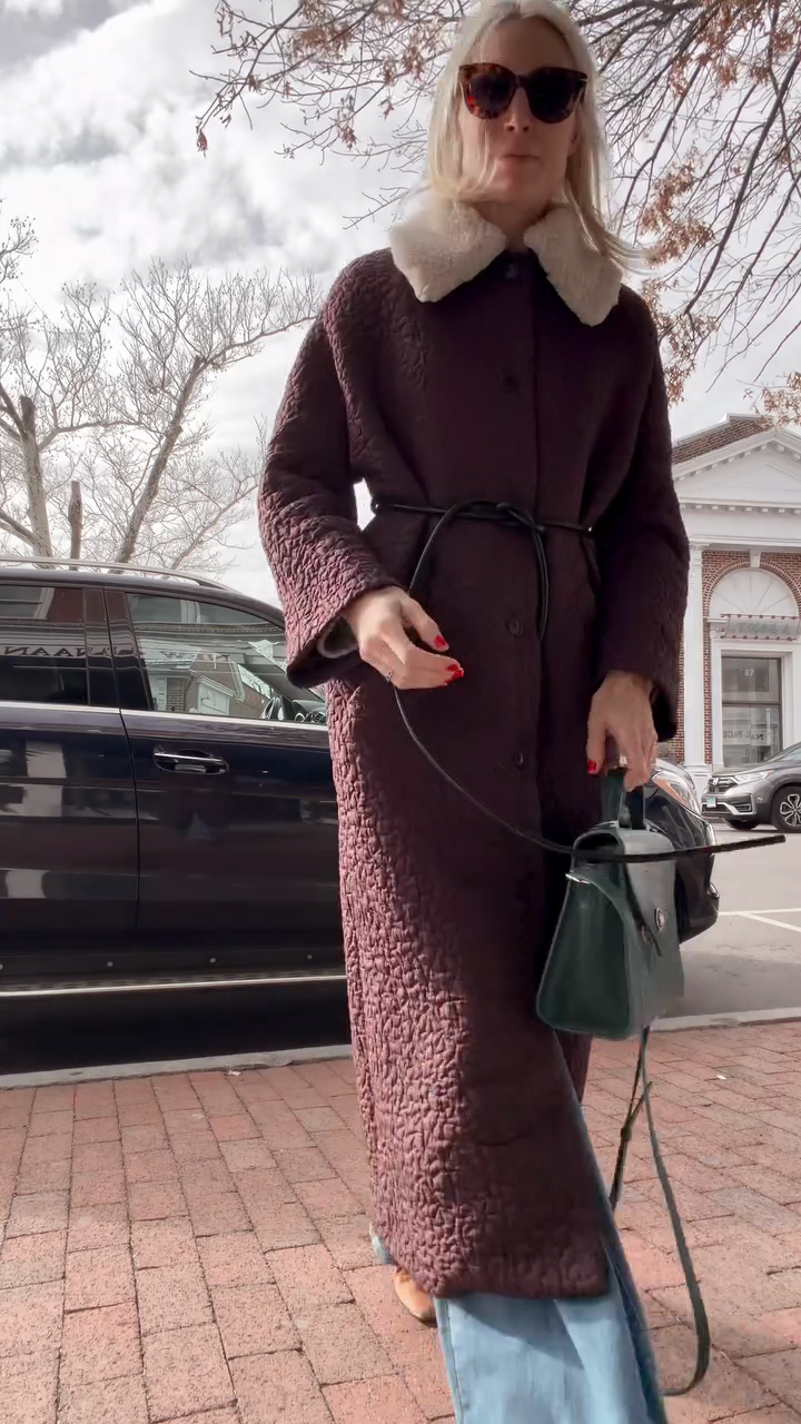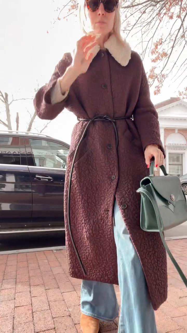 • Key Features: Faux shearling collar, adjustable leather waist tie, long relaxed fit