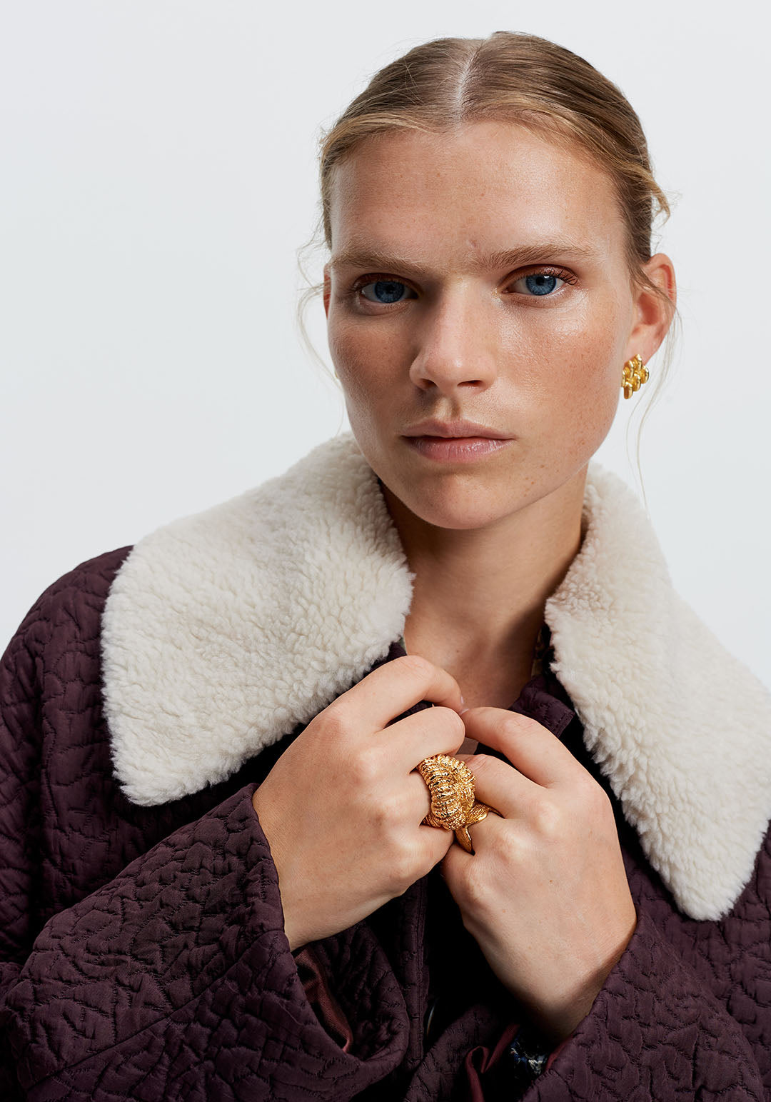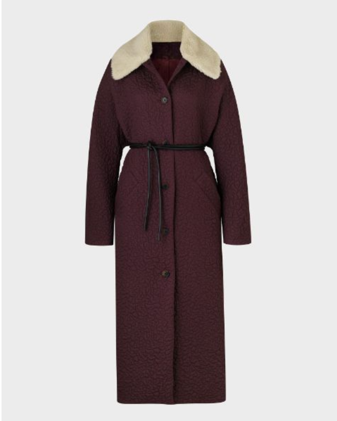 • Design: Burgundy Quilted Coat with Faux Shearling Collar