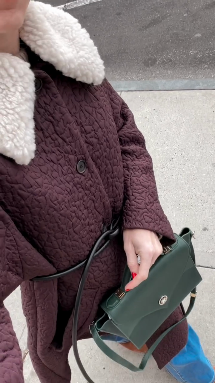 A burgundy quilted coat with faux shearling collar in textured quilted fabric (. Blends cozy retro charm with winter sophistication, fitting daily commutes, weekend gatherings or autumn/winter social outings—pair with neutral knits and ankle boots to amplify the coat’s rich burgundy tone.