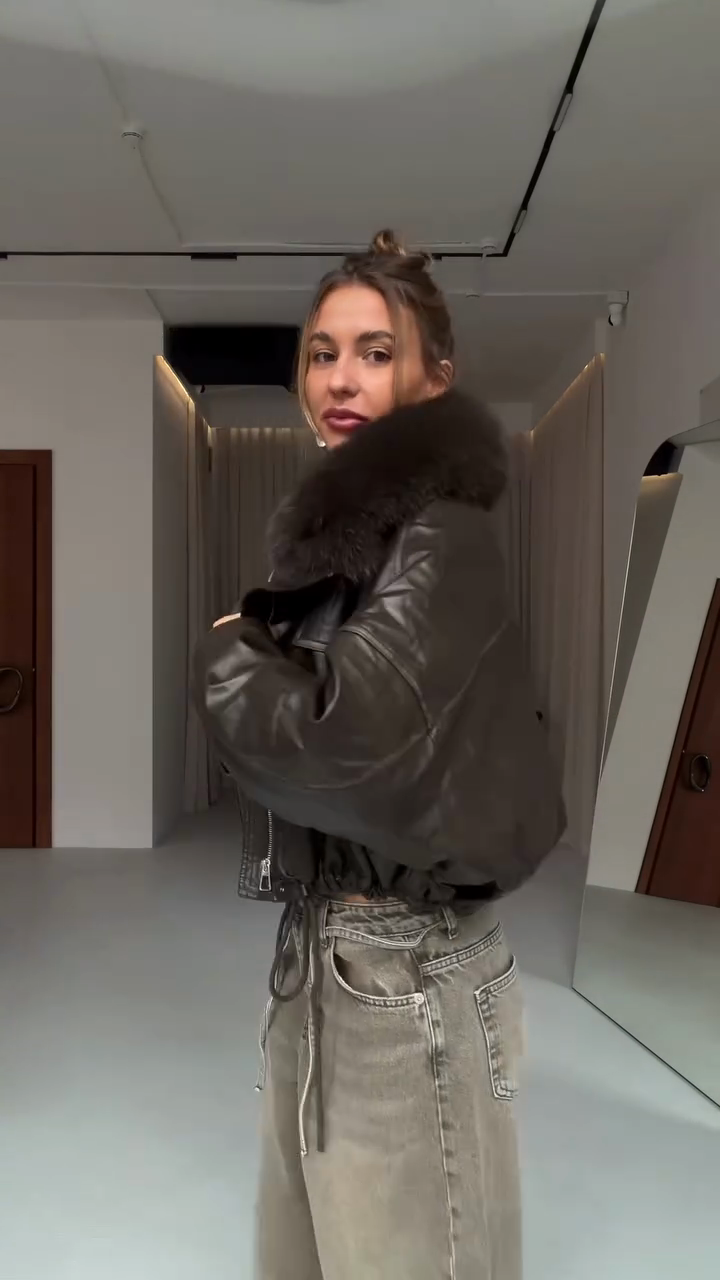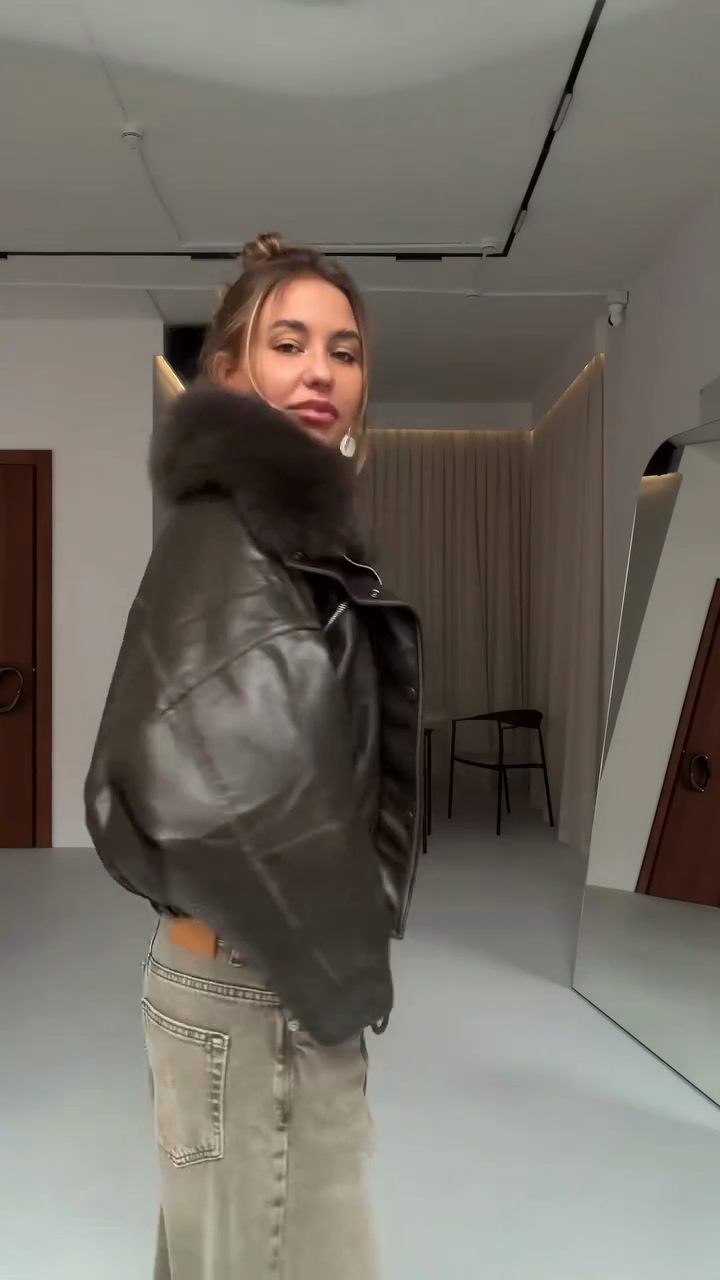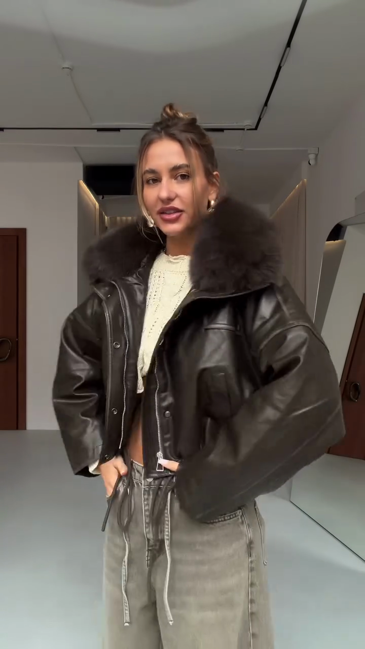 This is afaux leather jacket featuring an oversized charcoal faux fur collar, relaxed oversized silhouette, and dual zip-snap closure. The style merges "edgy modern glamour" (faux leather exterior + structured jacket design) with "luxe winter coziness" (plush fur collar + soft lining)—aligning with "urban street styling, evening casual outings, or transitional season layering" trends, suitable for city commutes, social gatherings, or pairing with basics for bold, warm seasonal wear.