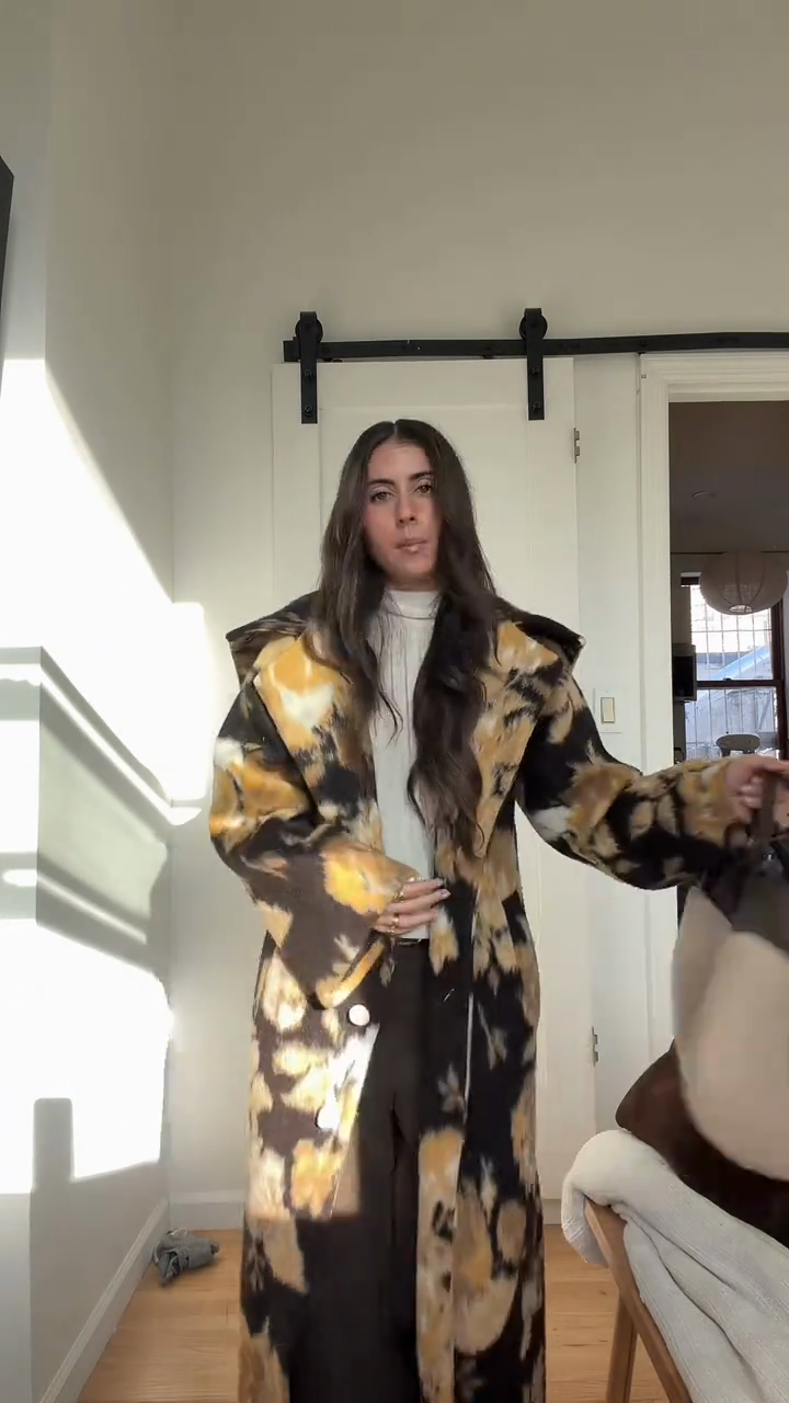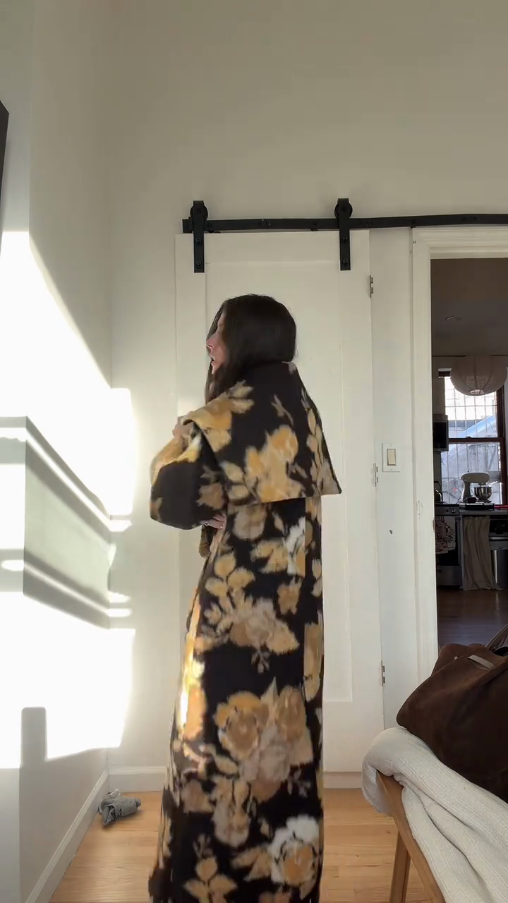 • Key Features: Oversized silhouette, long length, wide lapel, single-breasted button closure, bold floral print
