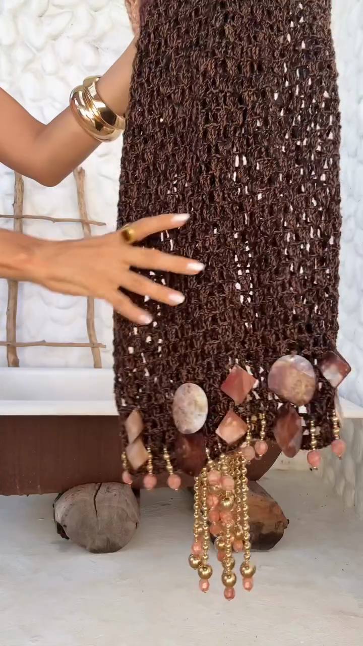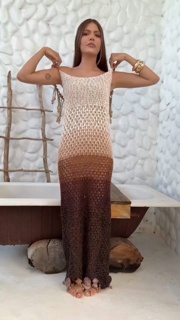 A gradient crochet beaded maxi dress featuring gradient color, beaded chain shoulder details, and a lace-up back design—merging breathable crochet texture with luxurious beaded elements for summer evening or upscale casual styling.