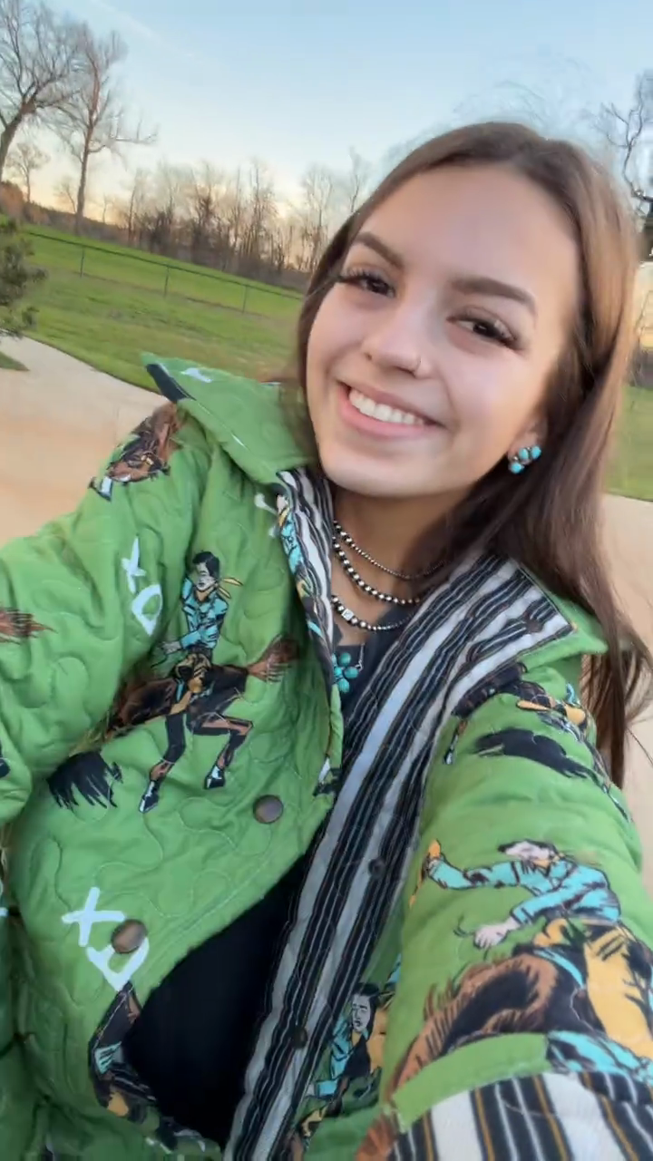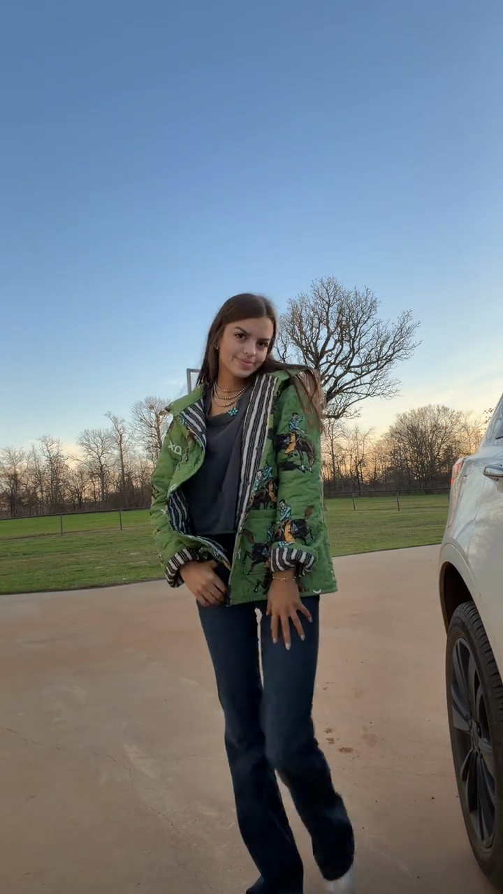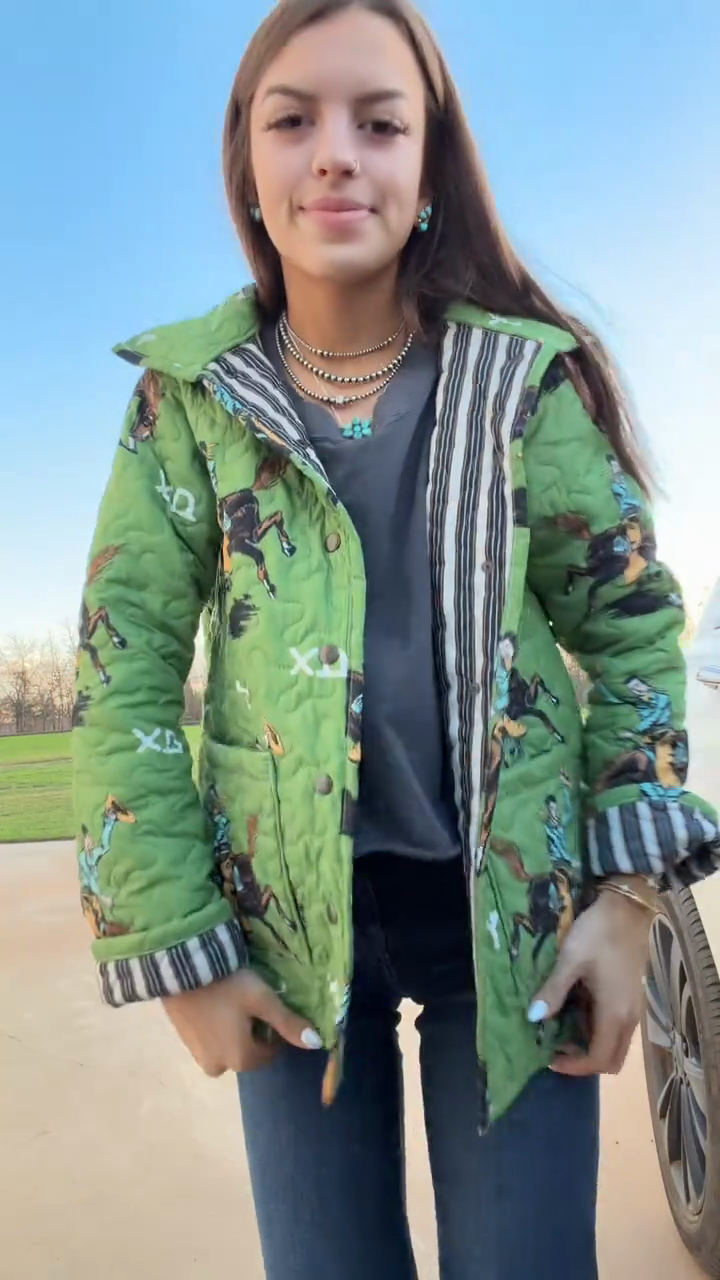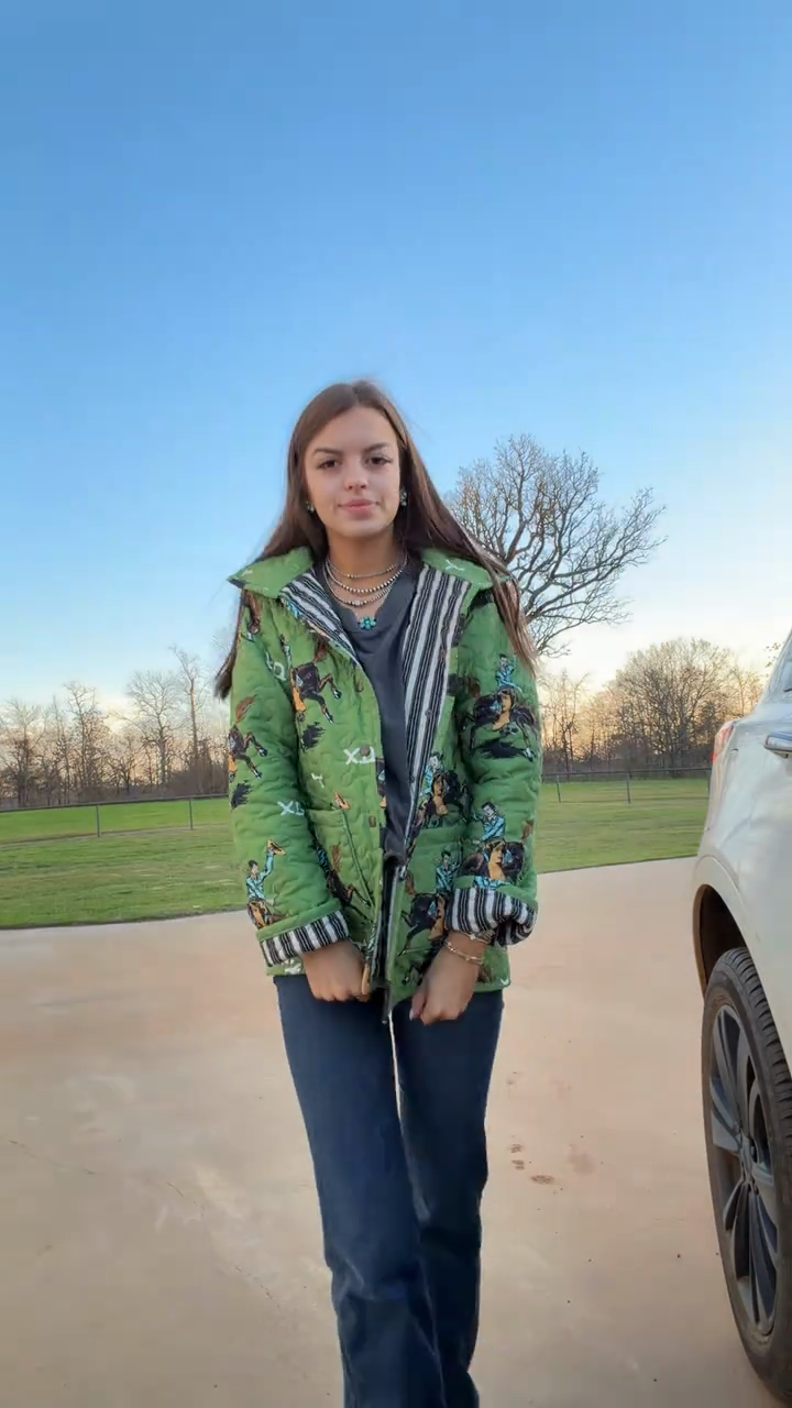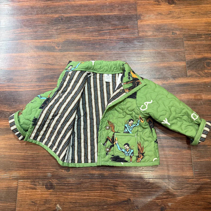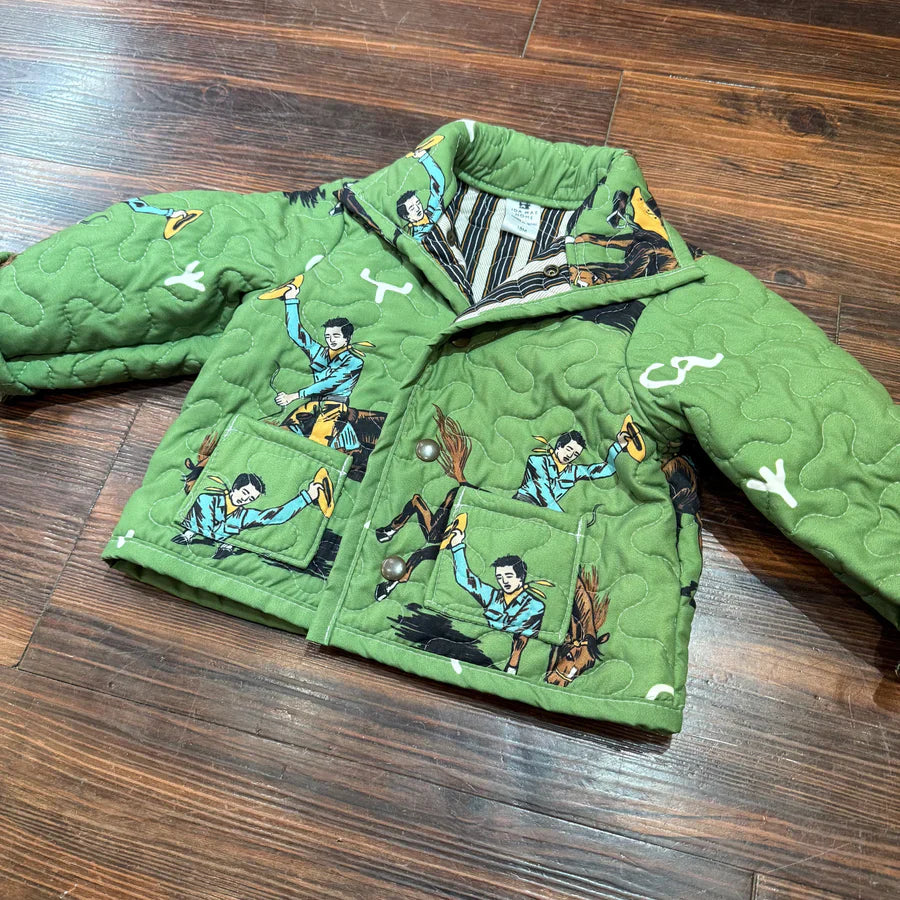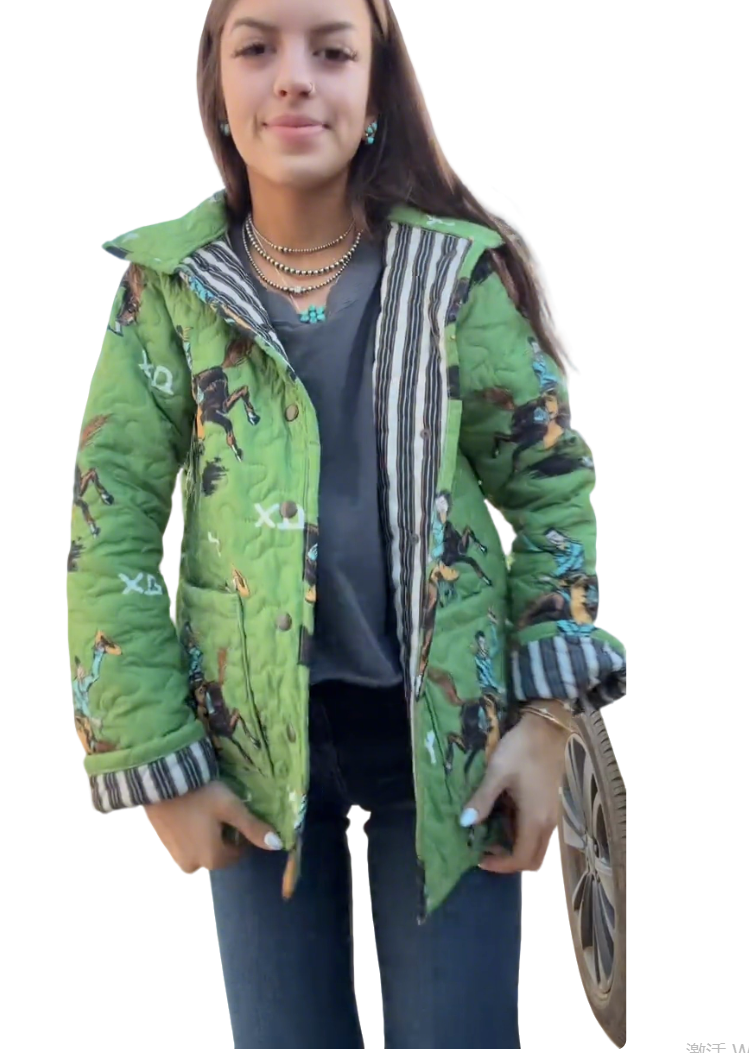 A quilted jacket featuring a playful cowboy & horse print, striped contrast trim, and relaxed silhouette—merging warm quilted fabric with whimsical Western-themed patterns for casual winter or retro-style outings.