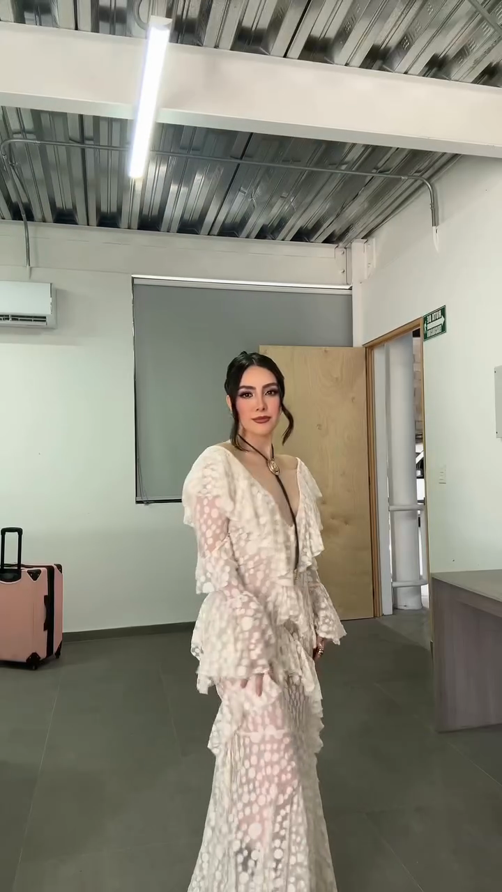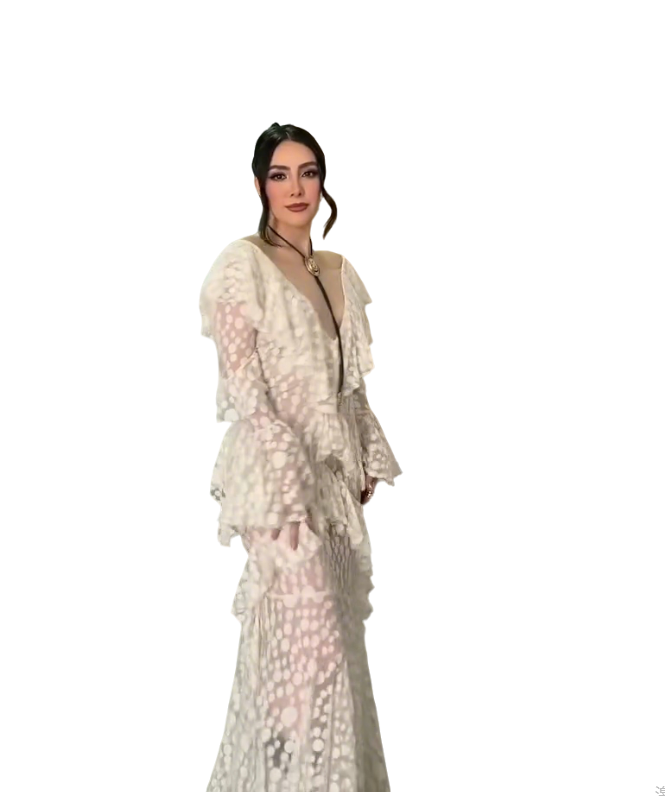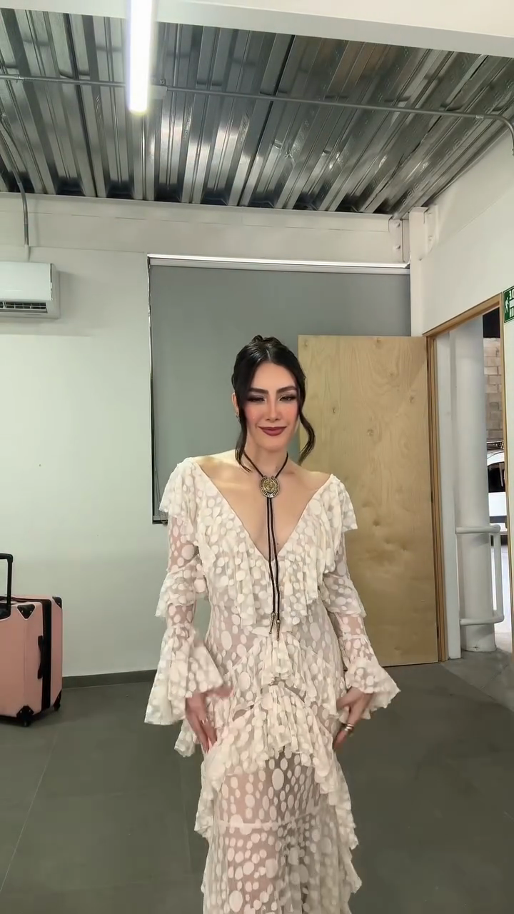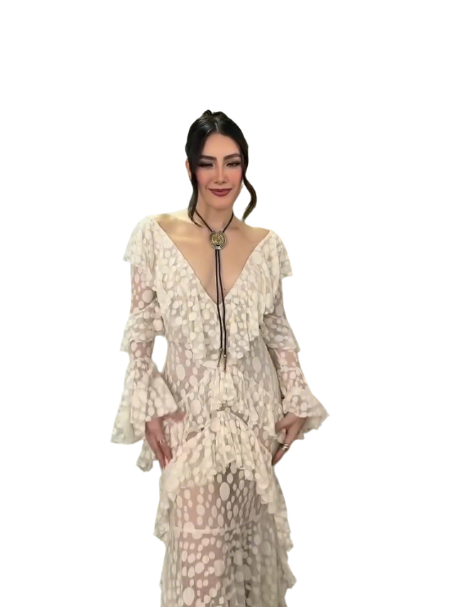 An ivory sheer maxi dress featuring polka dot patterns, layered ruffled details, and a deep V-back silhouette—merging delicate sheer texture with romantic ruffled elements for bohemian evening or upscale casual styling.