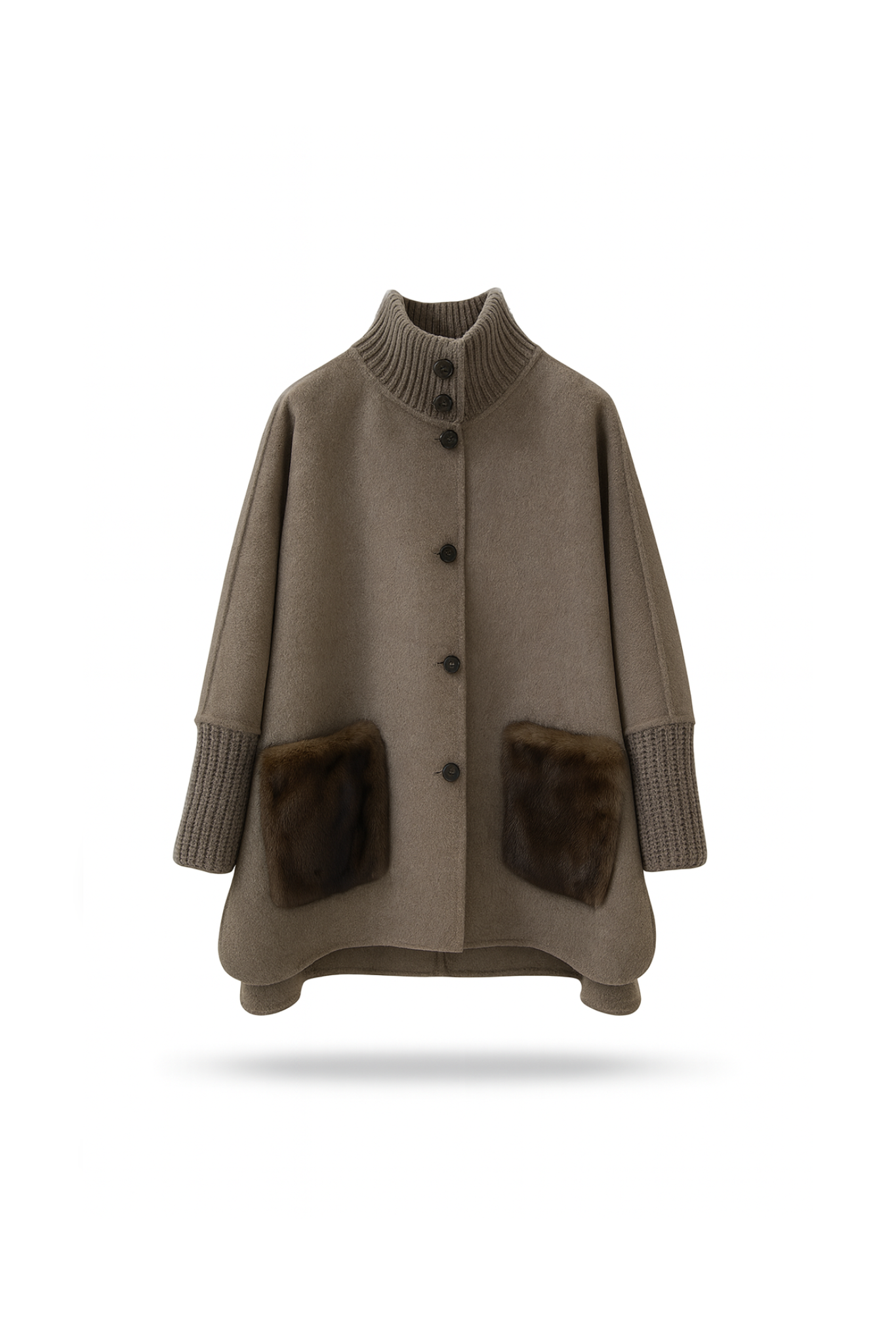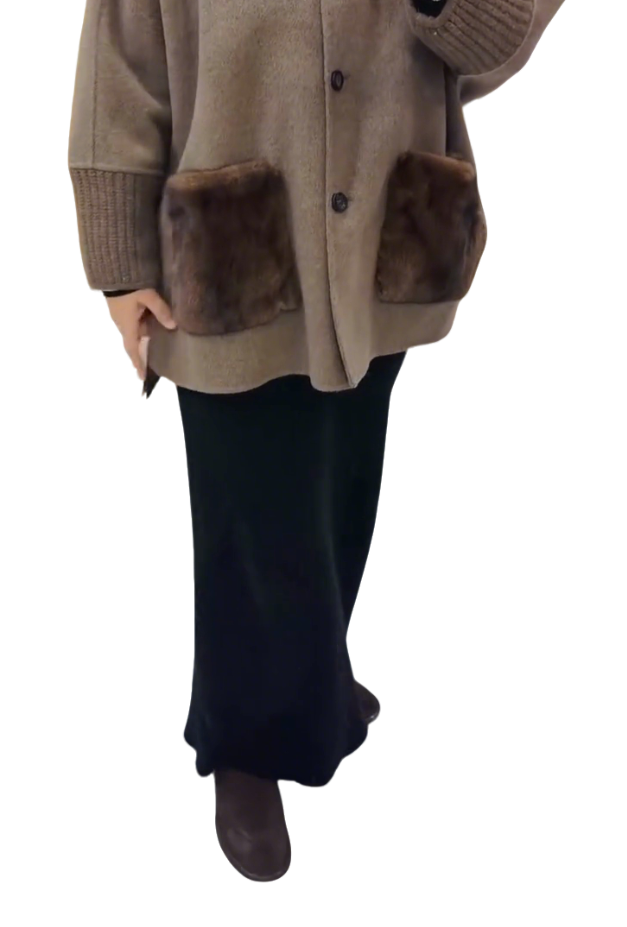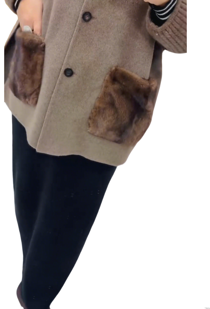 A taupe wool coat featuring fur-decorated pockets, knit turtleneck collar/cuffs, and a relaxed A-line silhouette—merging soft wool texture with luxurious details for elegant winter casual or commuting styling.
