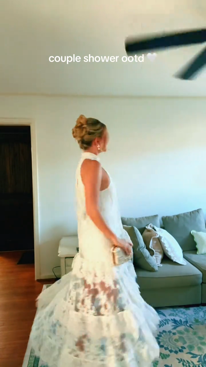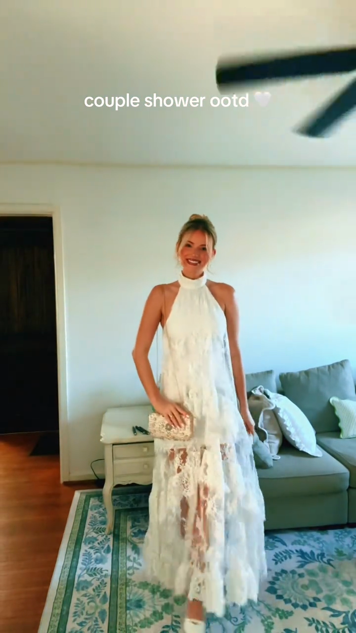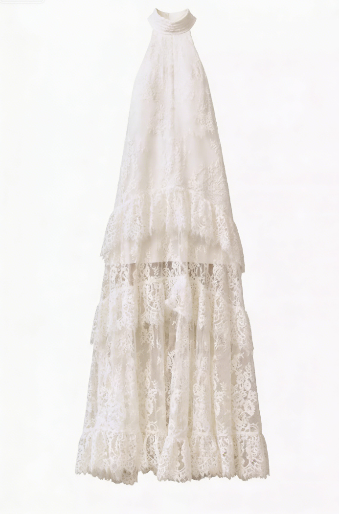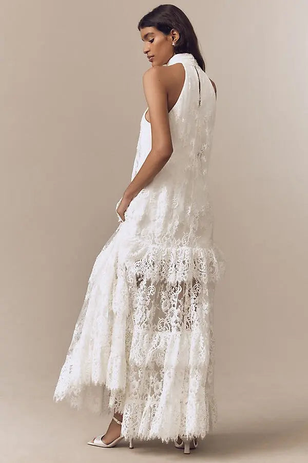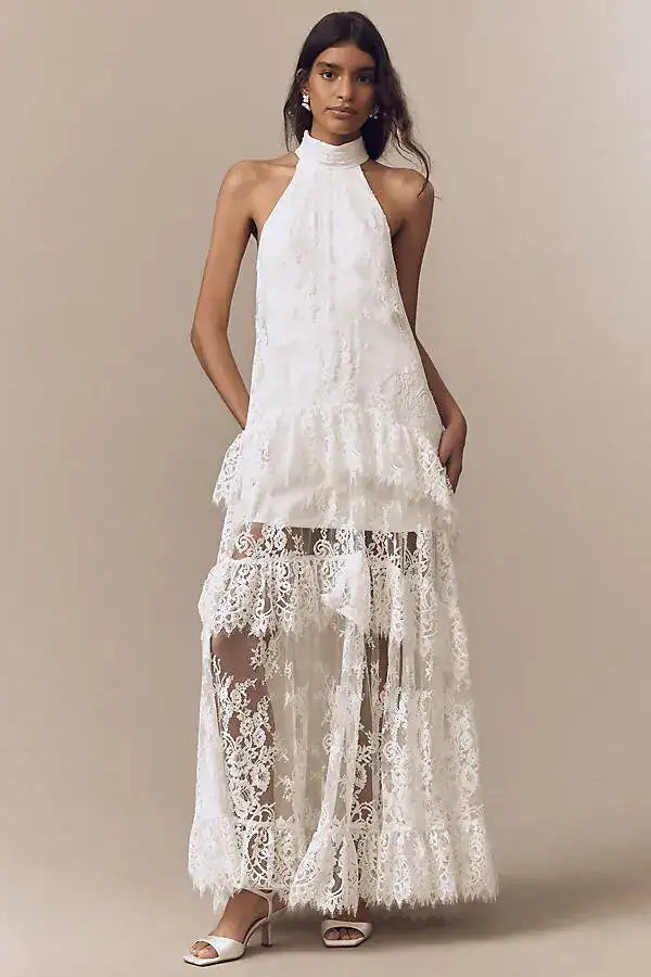 A white maxi dress featuring a halter neck design, layered lace details, and a sheer high-waist panel—merging delicate lace fabric with elegant layered silhouettes for formal events or upscale romantic styling.