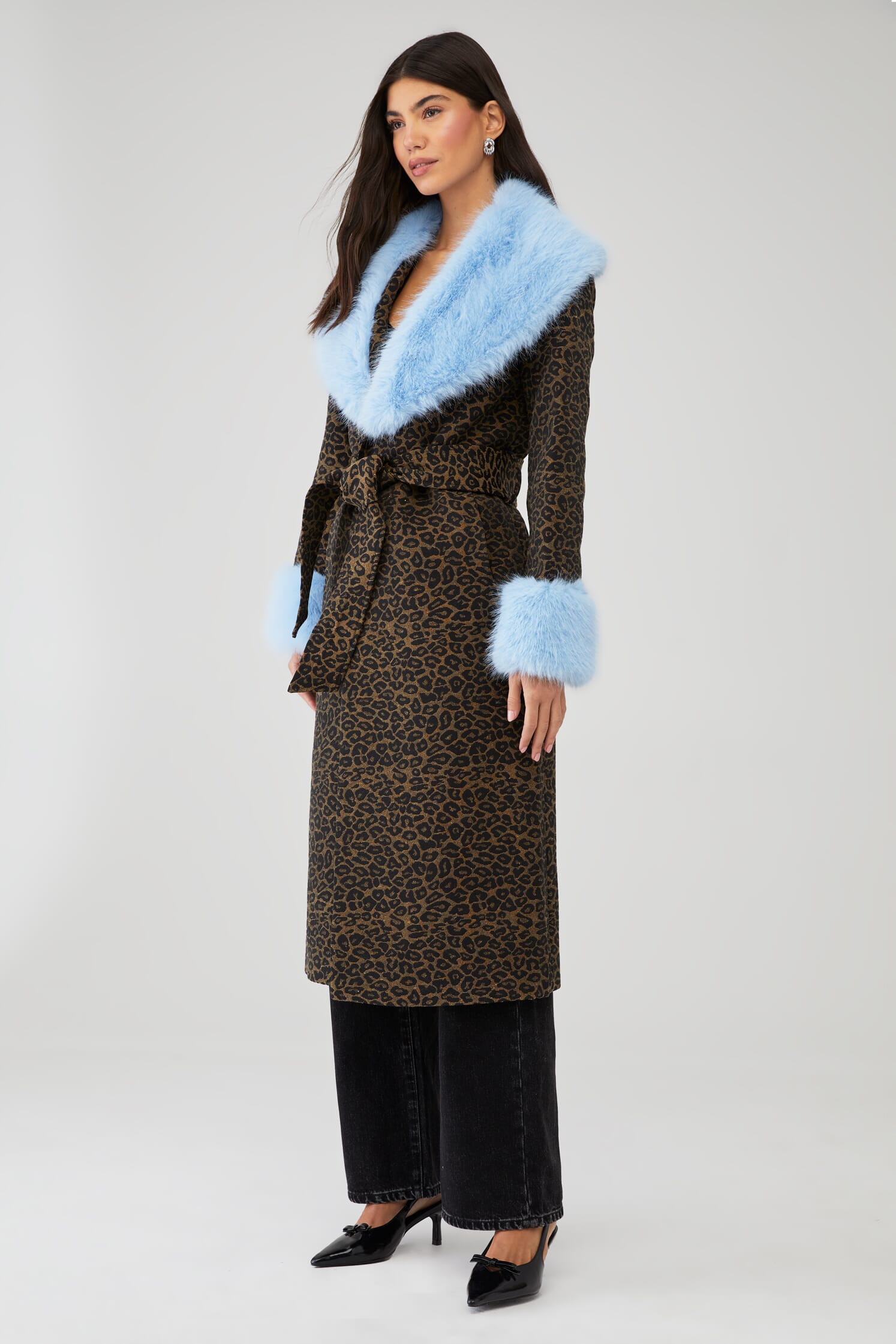 • Design: Leopard-Print Coat with Light Blue Faux Fur Trim