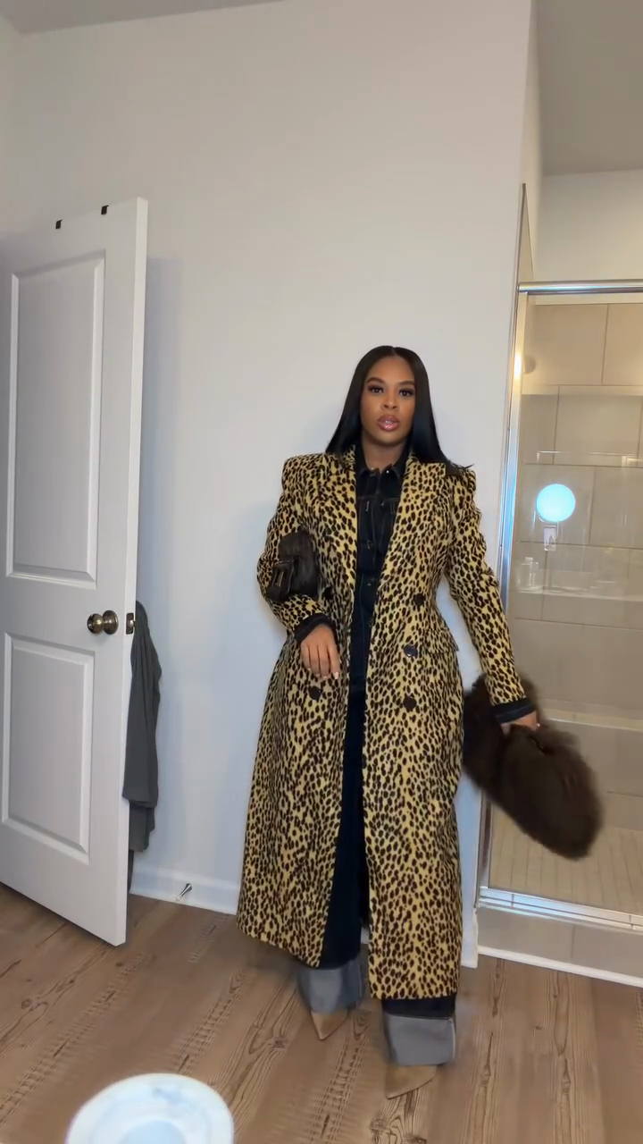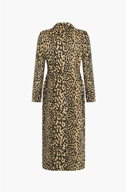 • Key Features: High-contrast leopard print , double-breasted button closure , mid-length silhouette
