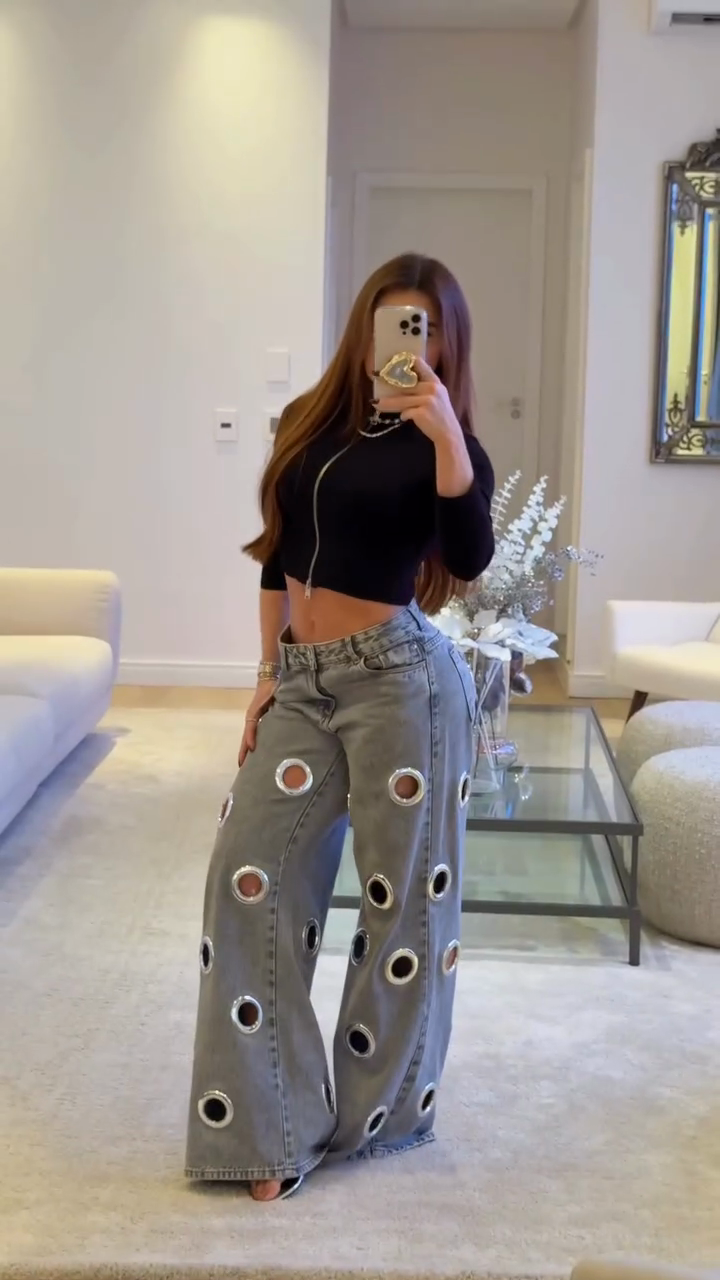 These jeans are made from distressed light-wash denim, featuring a relaxed, wide-leg fit and striking circular cutouts. Pair them with a black cropped zip-up top and strappy heels for an effortlessly stylish look.