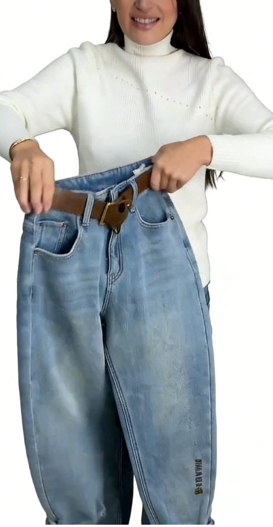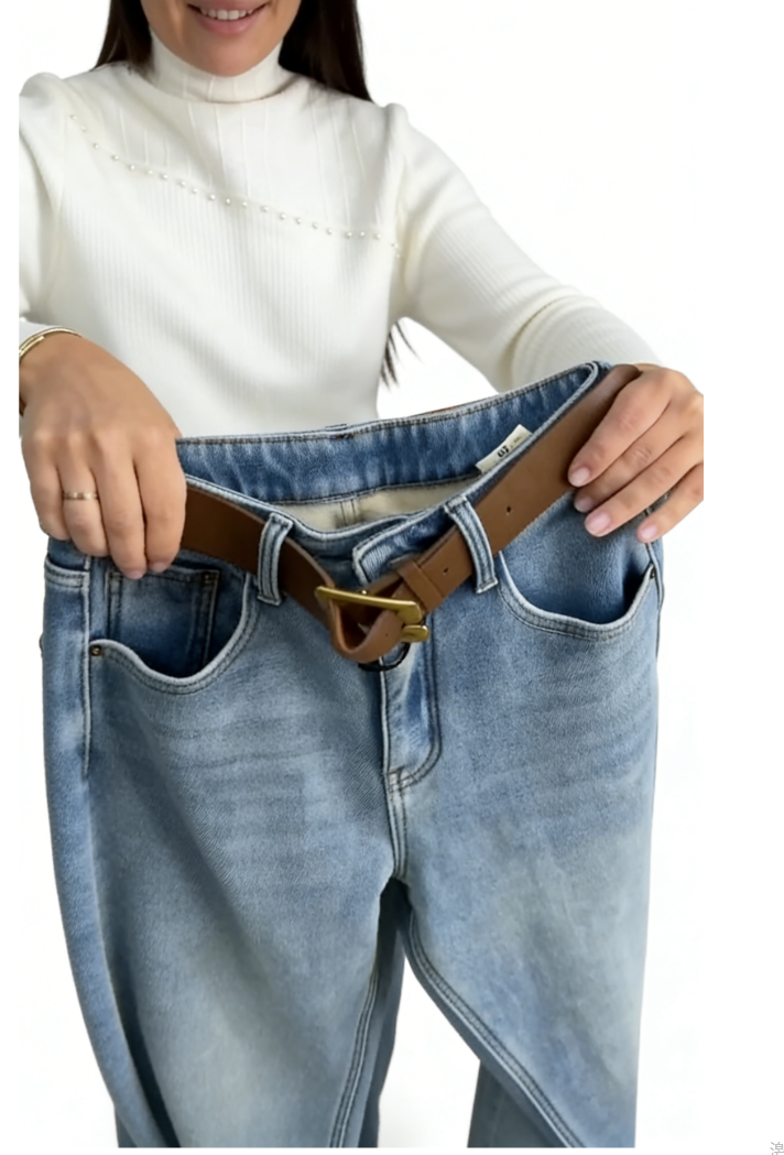 A pair of light-wash relaxed-fit jeans with fleece lining and branded embroidery, blending casual style with winter warmth for daily or leisure styling.