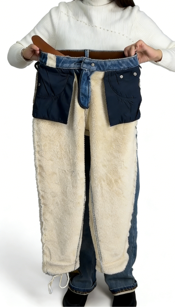 Fabric: Cotton denim (exterior); Fleece (lining)