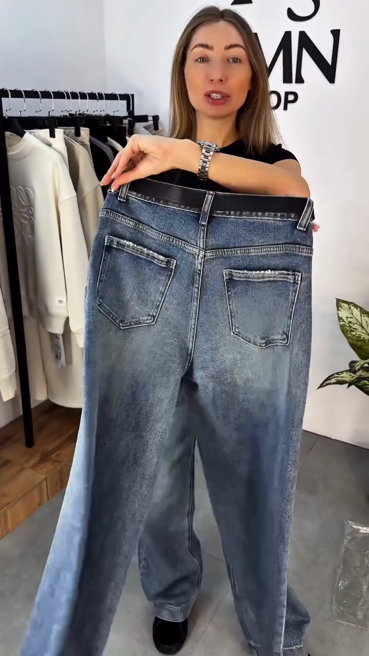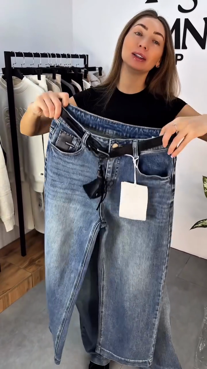 A light wash wide-leg jeans in denim fabric (relaxed wide-leg fit, decorative small bag detail). Blends casual comfort with trendy design, fitting daily outings, shopping or casual gatherings—pair with a fitted top and belt for a neat look.