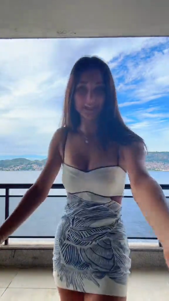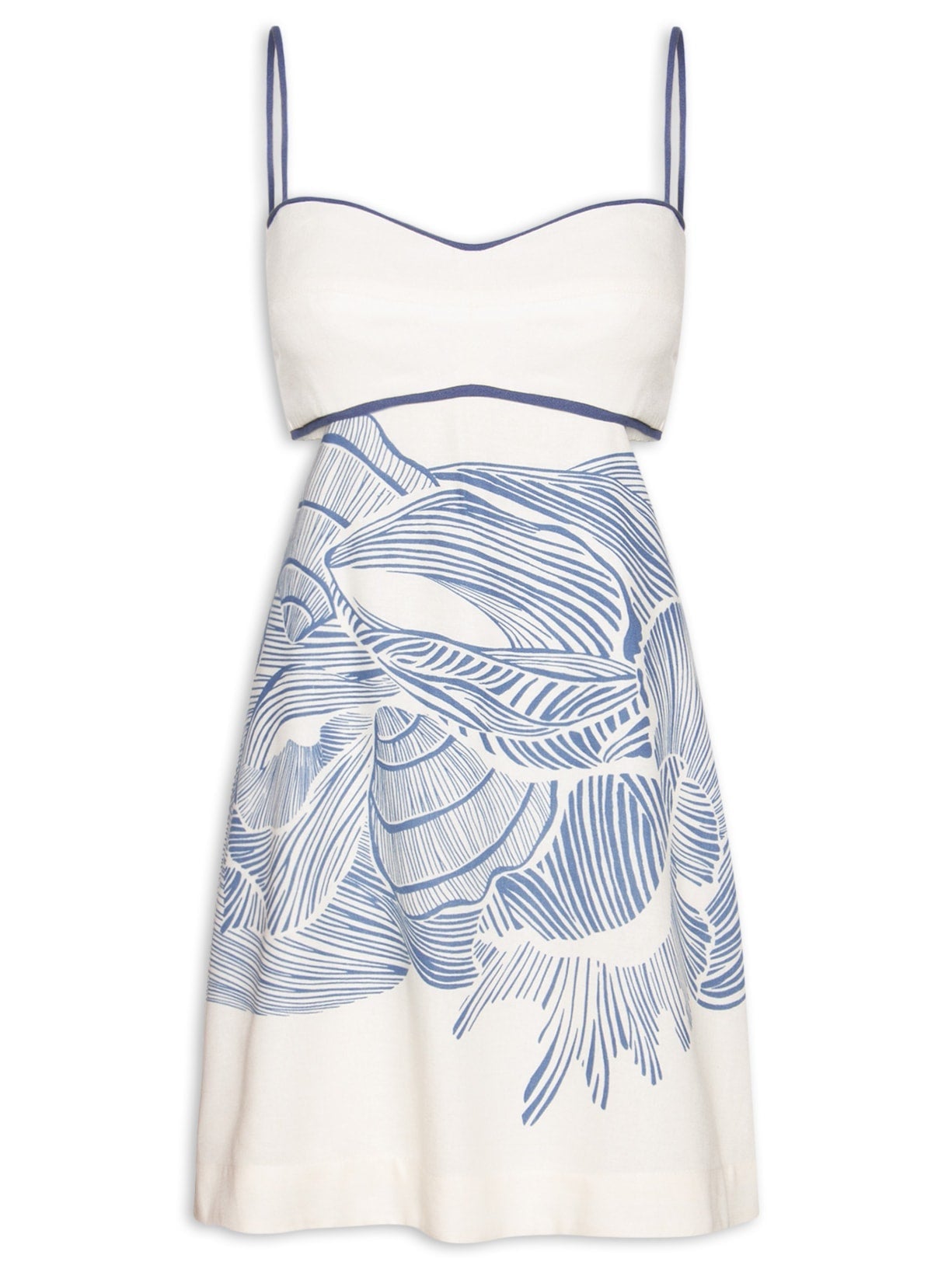 An ivory cami dress accented with navy line patterns, featuring a sweetheart neckline and waist cutout detail—merging artistic print design with modern silhouette elements for elegant casual or event styling.
