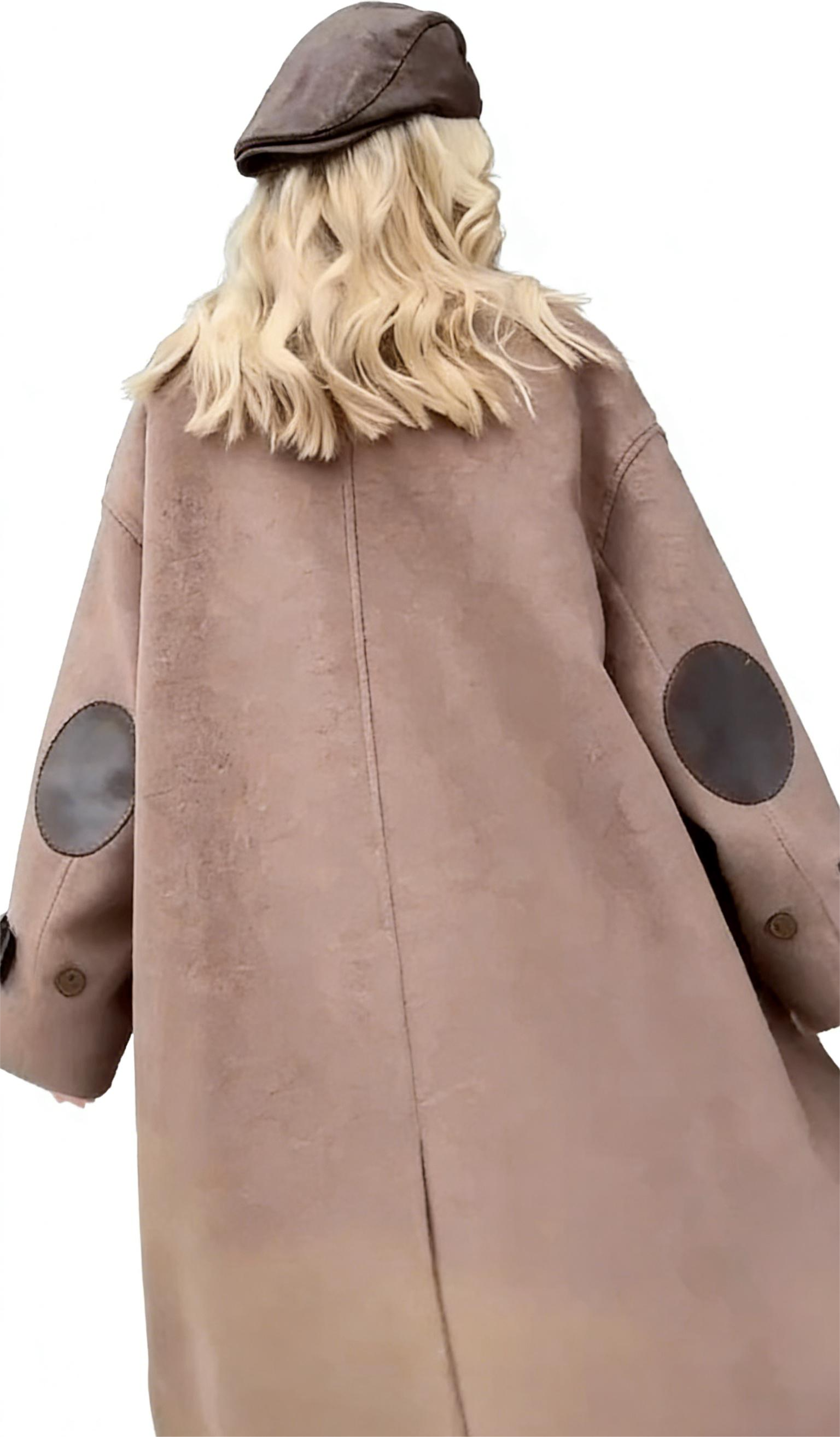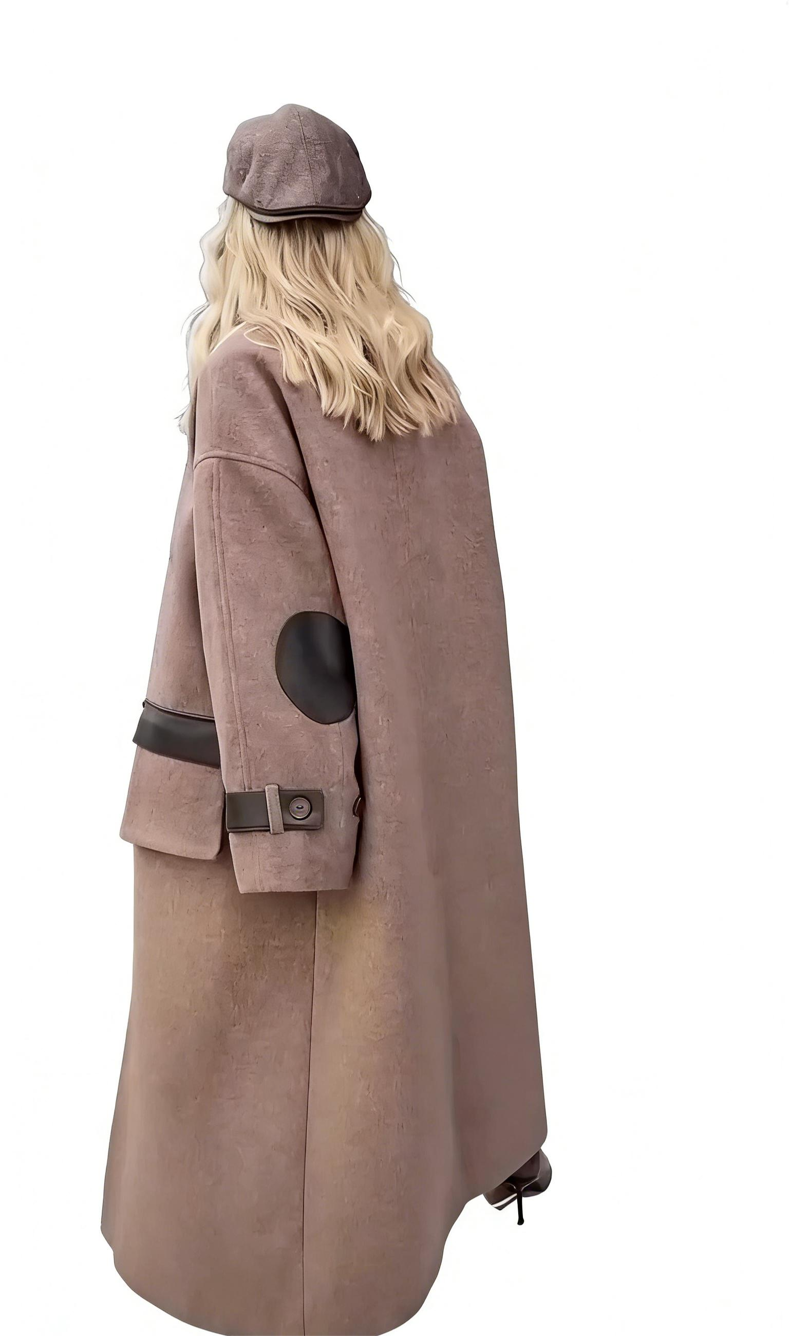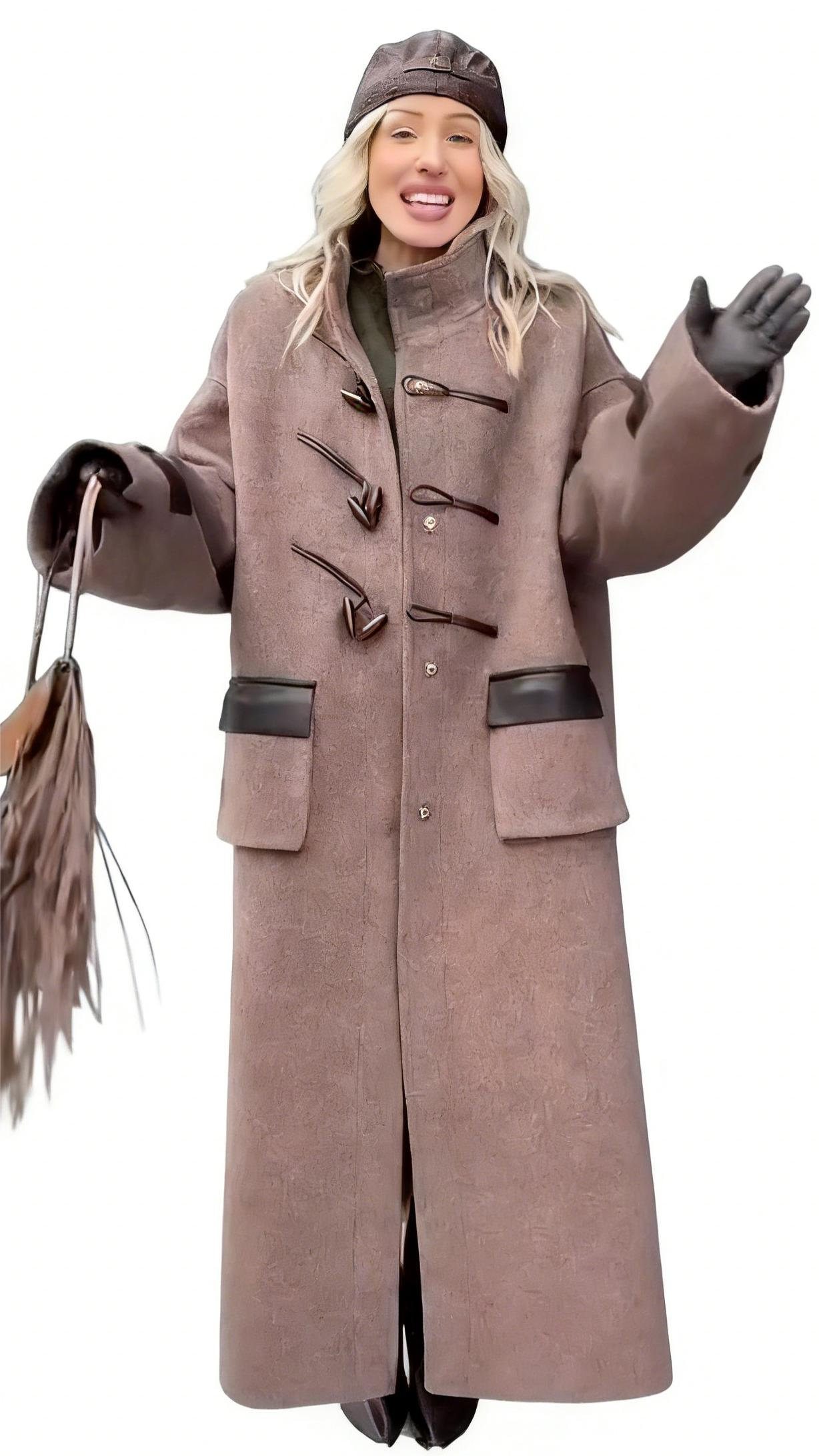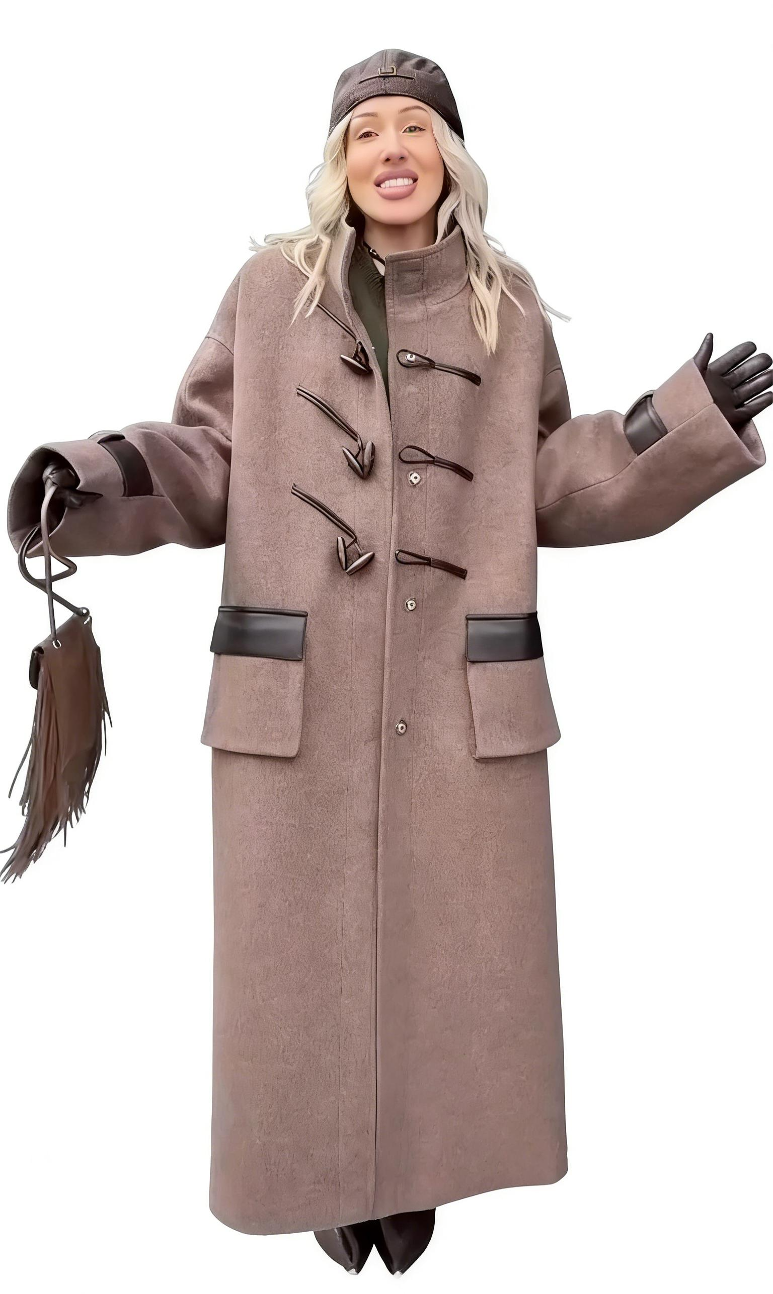 This coat, crafted from a soft taupe fabric, boasts a relaxed, floor-length silhouette with contrasting black leather details and classic toggle buttons, perfectly blending comfort, elegance, and modern style. Pair it with black slim-fit boots and a matching taupe fringed bag for a more sophisticated winter look.