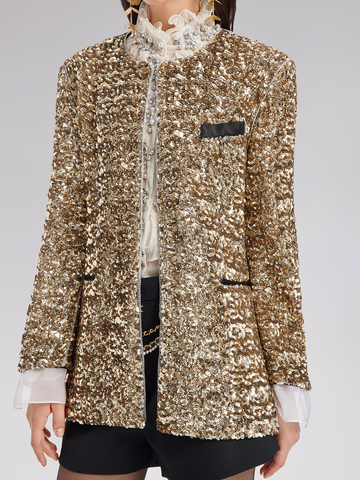 This gold sequined blazer is crafted from gold sequined fabric. Its relaxed fit and open front design exude luxury. Pair it with a white ruffled blouse and black shorts for an effortlessly stylish look.