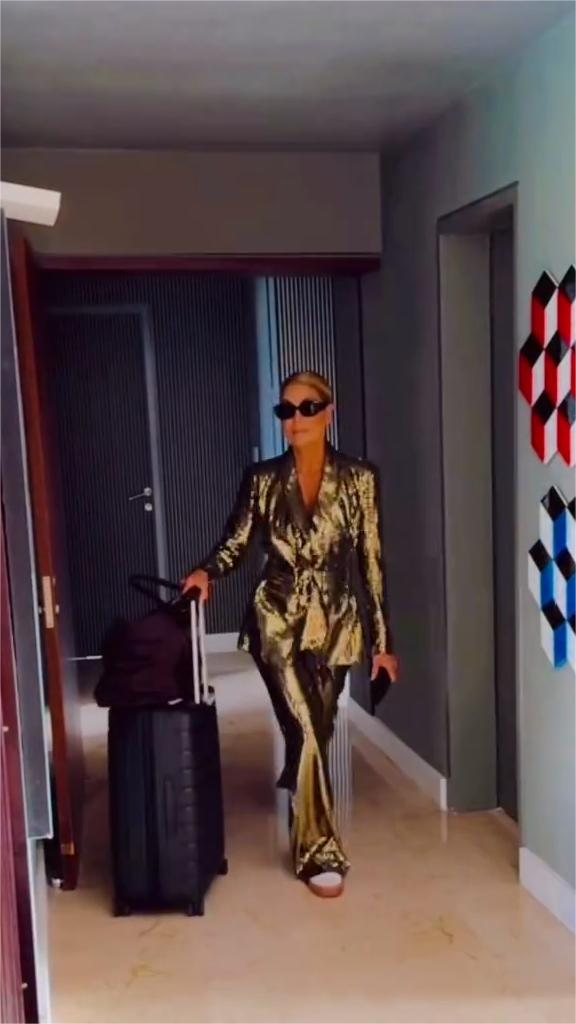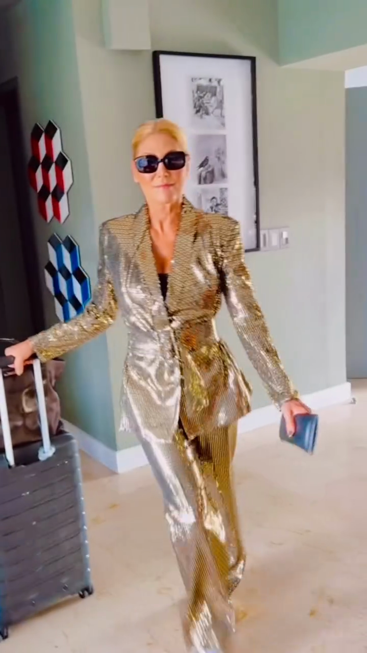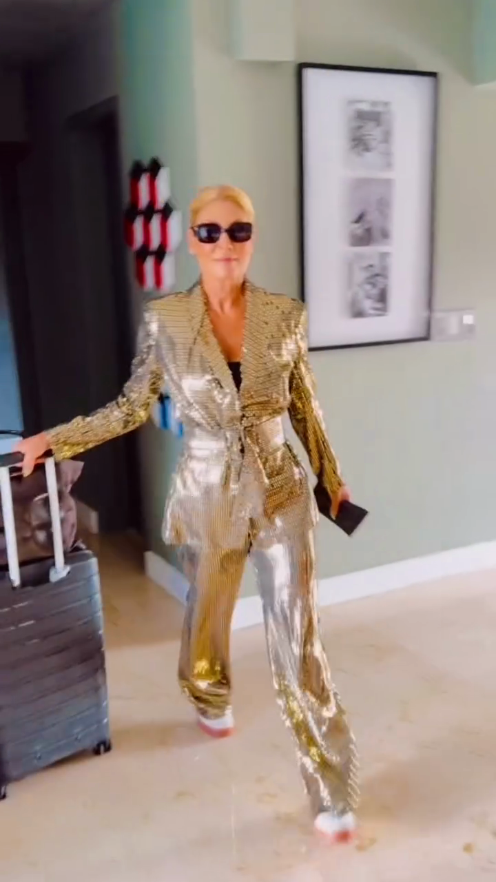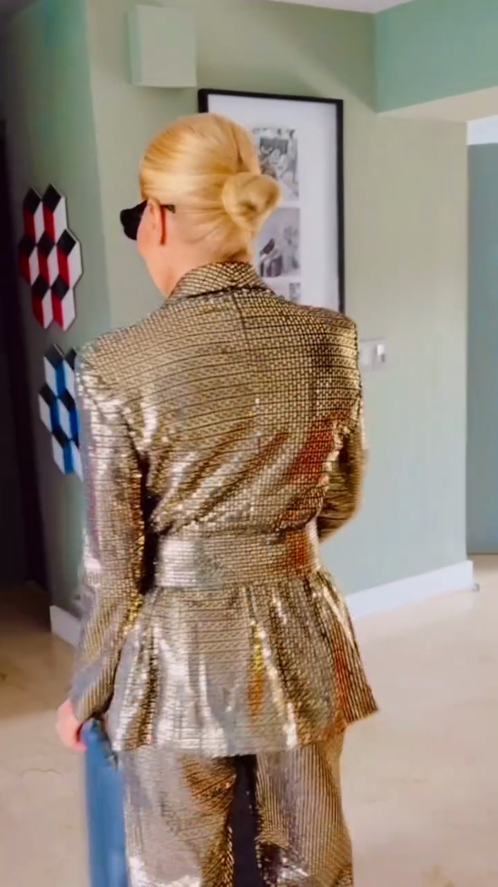 This two-piece suit is crafted from a shimmering metallic gold fabric and includes a fitted blazer with a ruffled waist and high-waisted wide-leg trousers. Elevate your look by pairing it with a black camisole and eye-catching sunglasses.