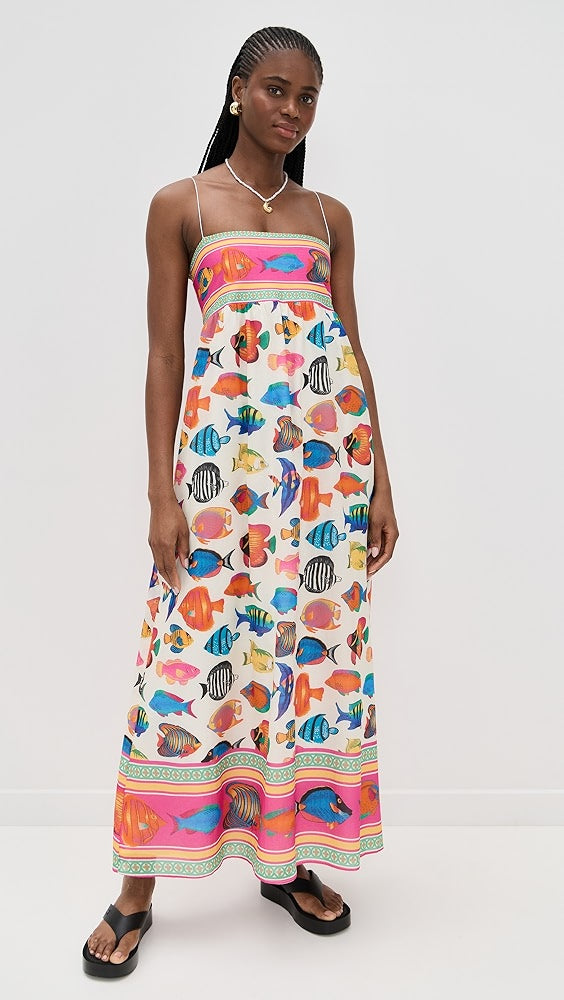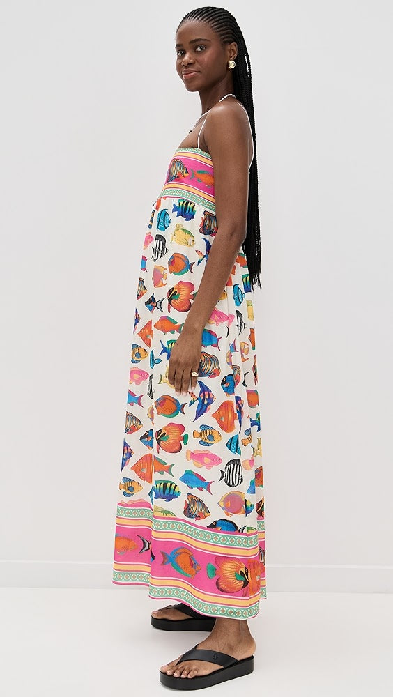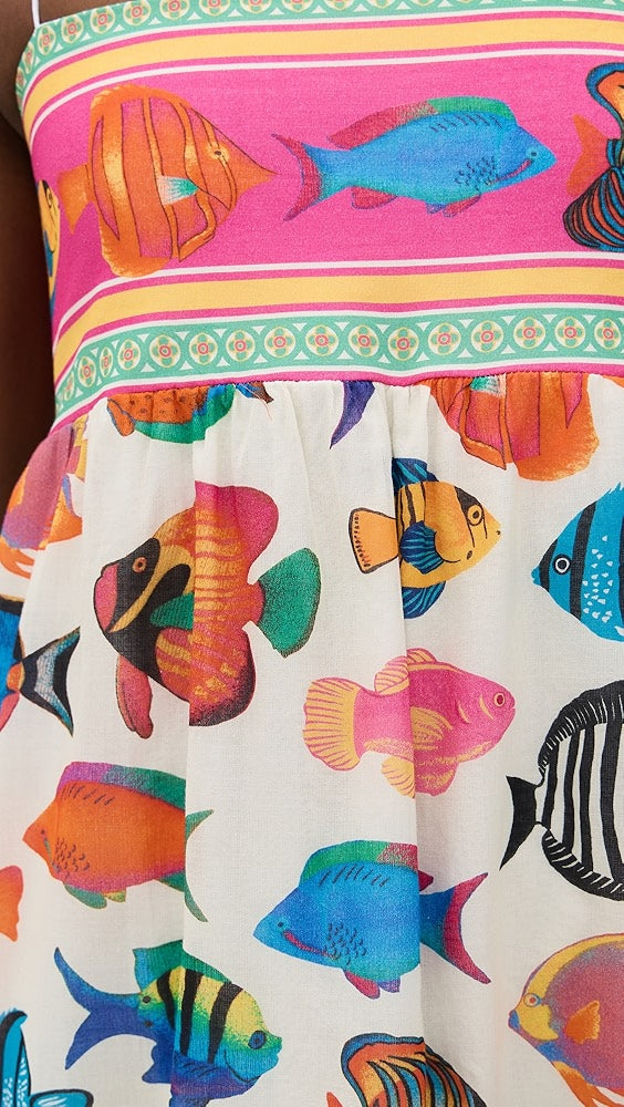 A white-based cami maxi dress adorned with vibrant multi-color fish patterns, featuring a smocked bust and ruffled hem—merging playful print design with lightweight comfort for vacation or casual summer styling.