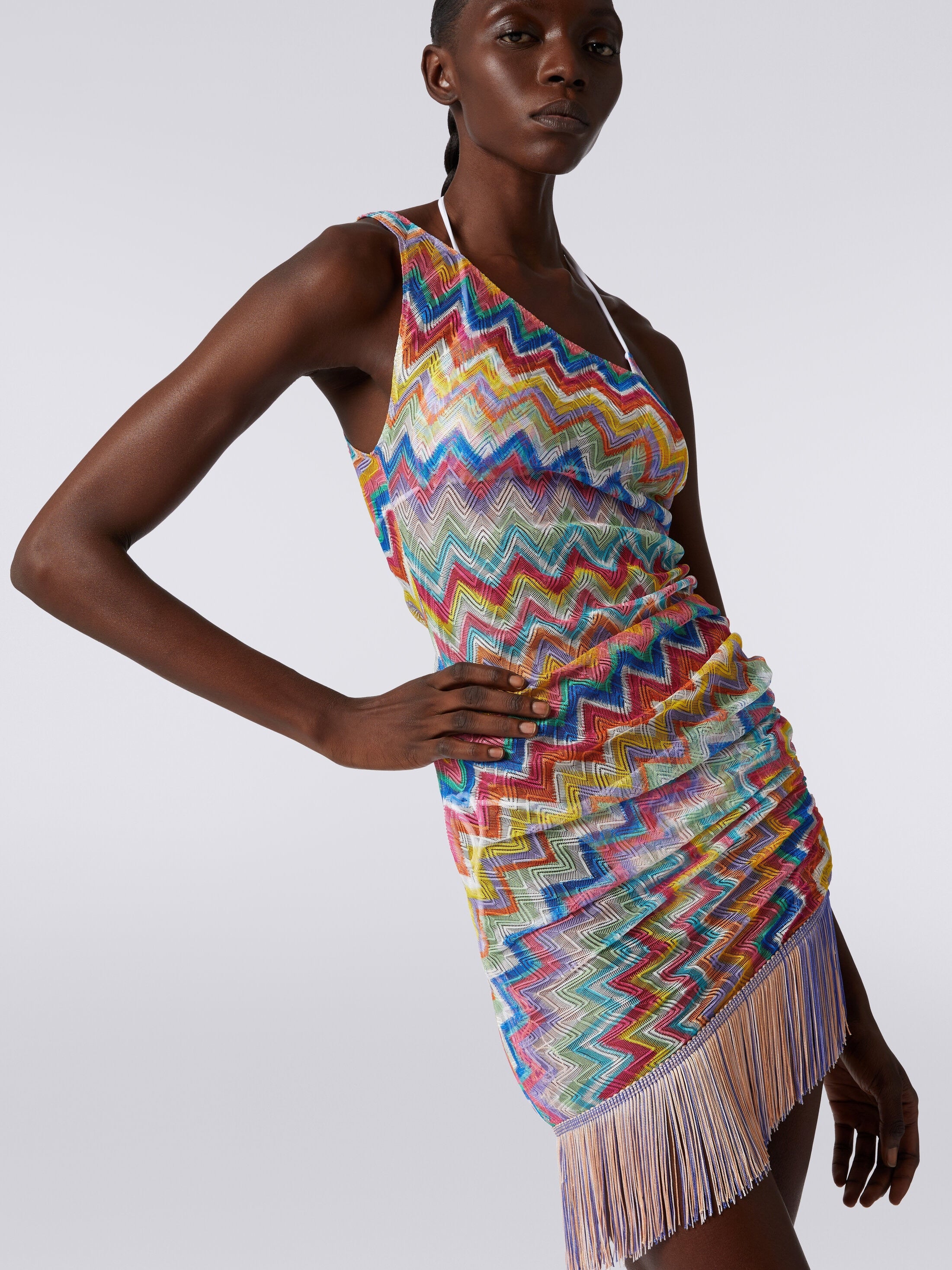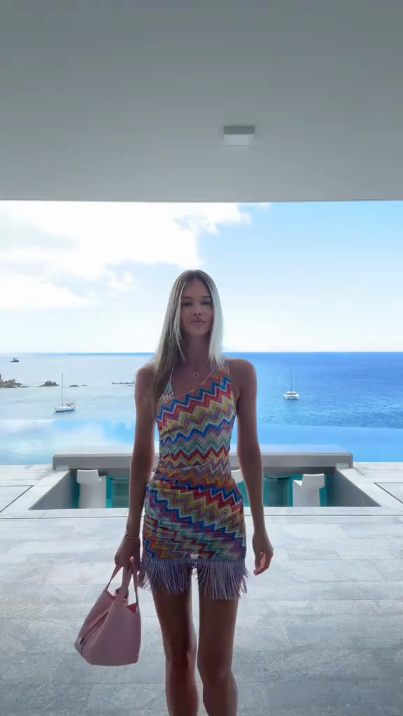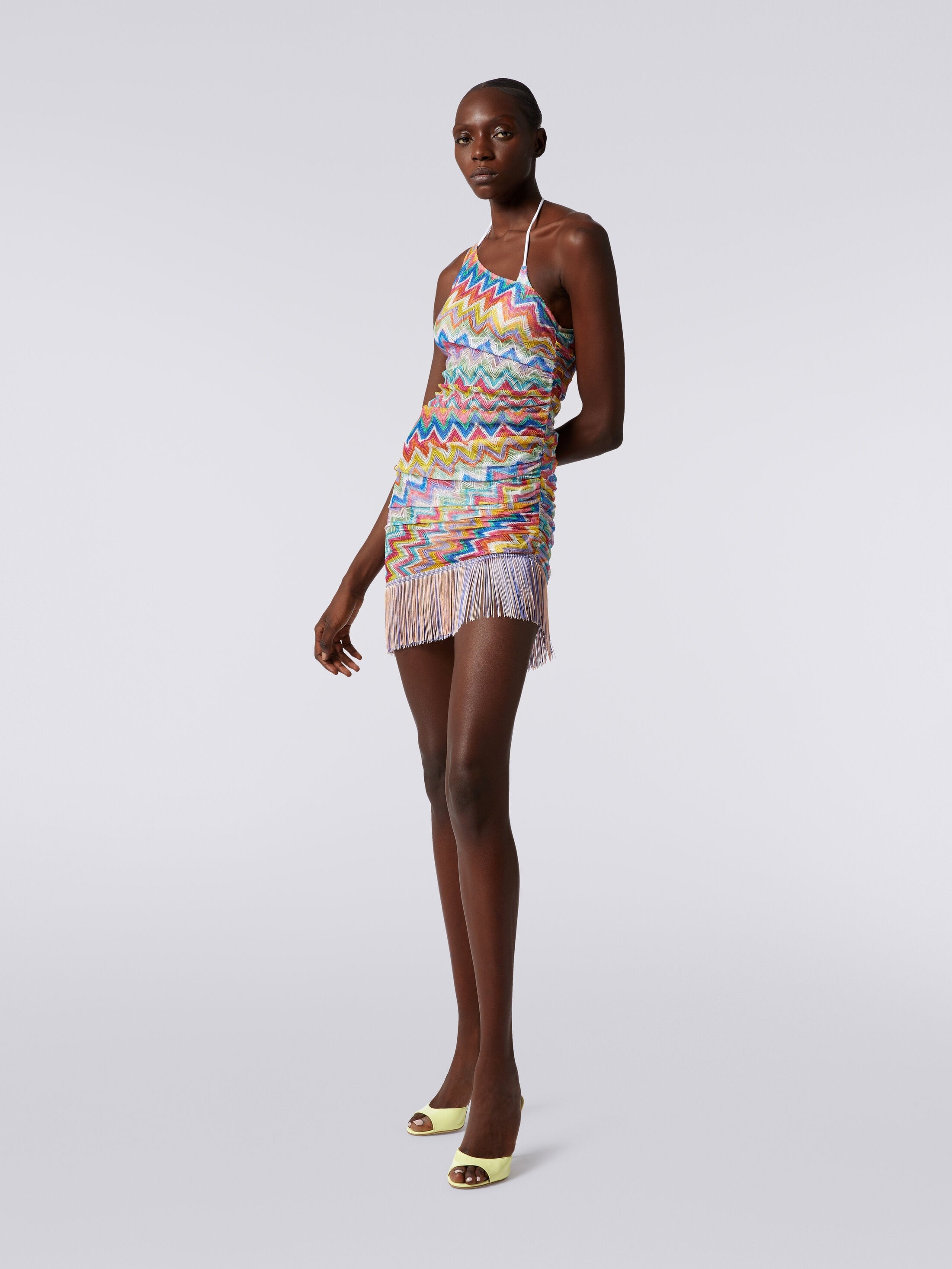 This mini dress is crafted from a vibrant, multi-colored herringbone knit fabric. It features a sleeveless, open back design and a playful fringed hem. Pair it with strappy sandals and a light pink handbag for an effortlessly stylish look.